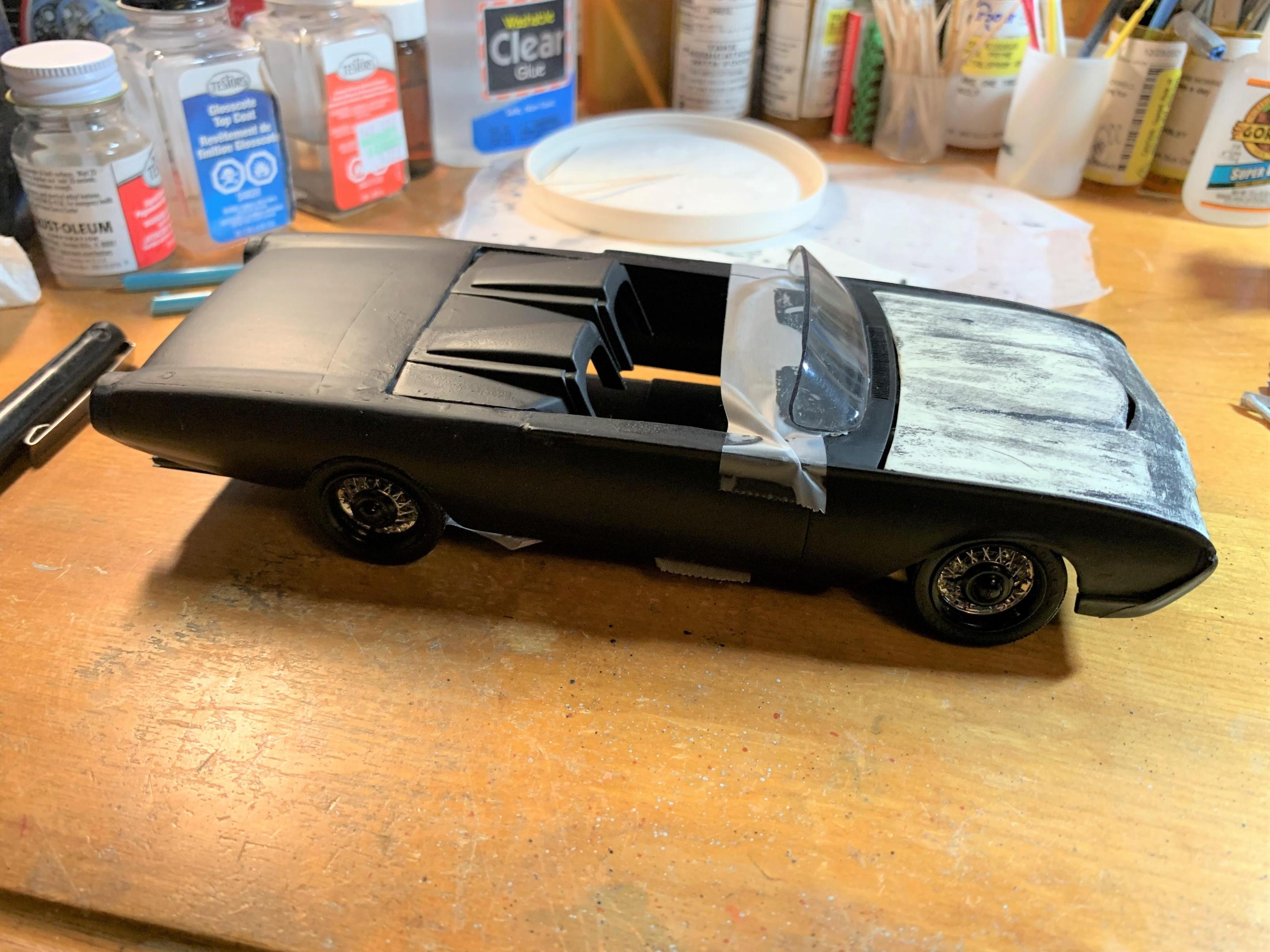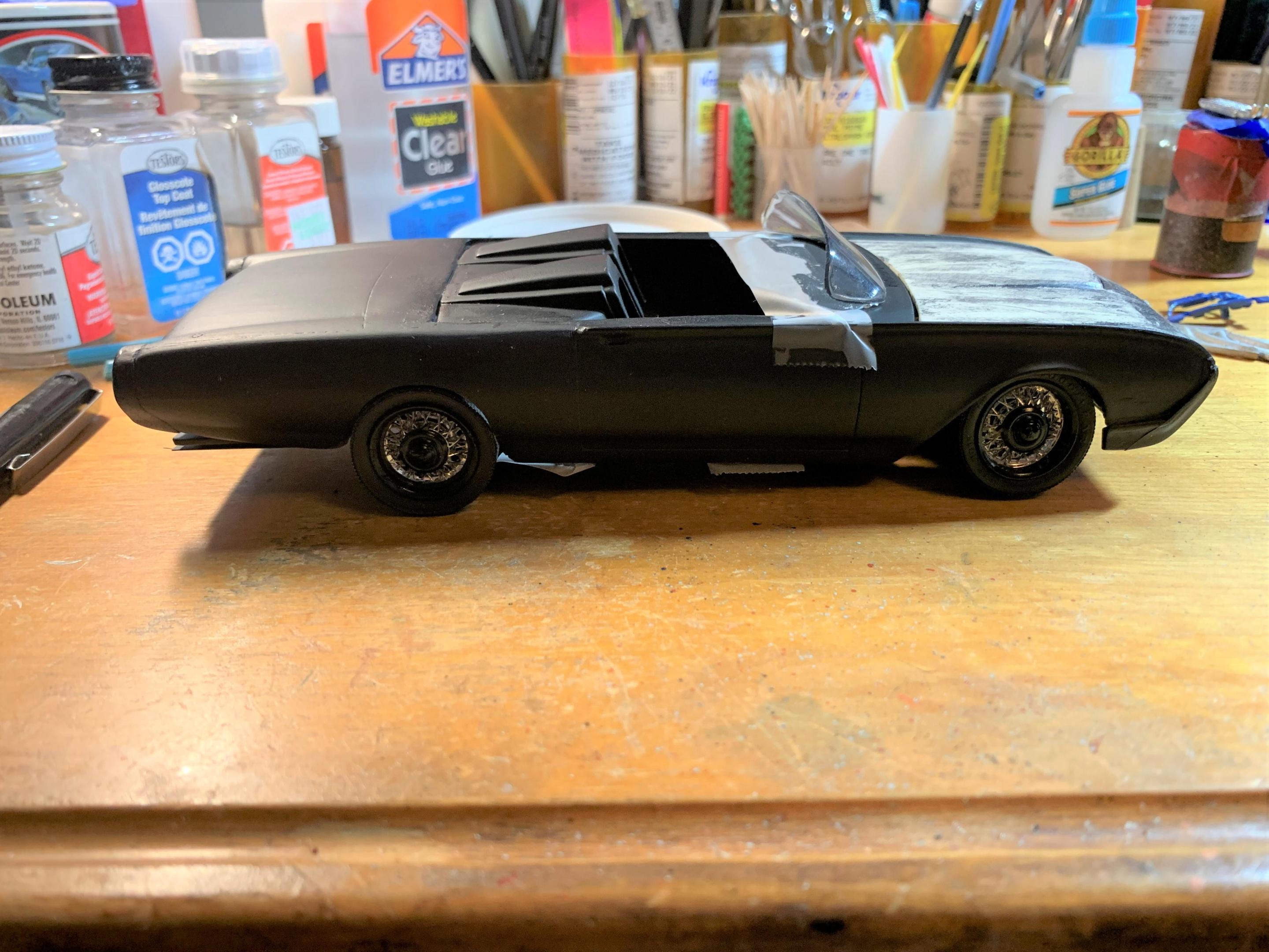 This project was started years ago, pulled out occasionally and tinkered with, then back on the shelf. Finally decided it was time to git-r-done! Started with a 1961 T-bird junker, decided to add a 427 Cobra chassis and suspension, a DOHC engine from the parts stash, and bits and pieces from here and there. Got to the point where a mock up was in order. Still some adjustments such as removing more material from the rear wheel arches, more clearance for the front suspension, and some putty on the body. The Cobra chassis rails will be lengthened with sprue. More pix when I get more done.