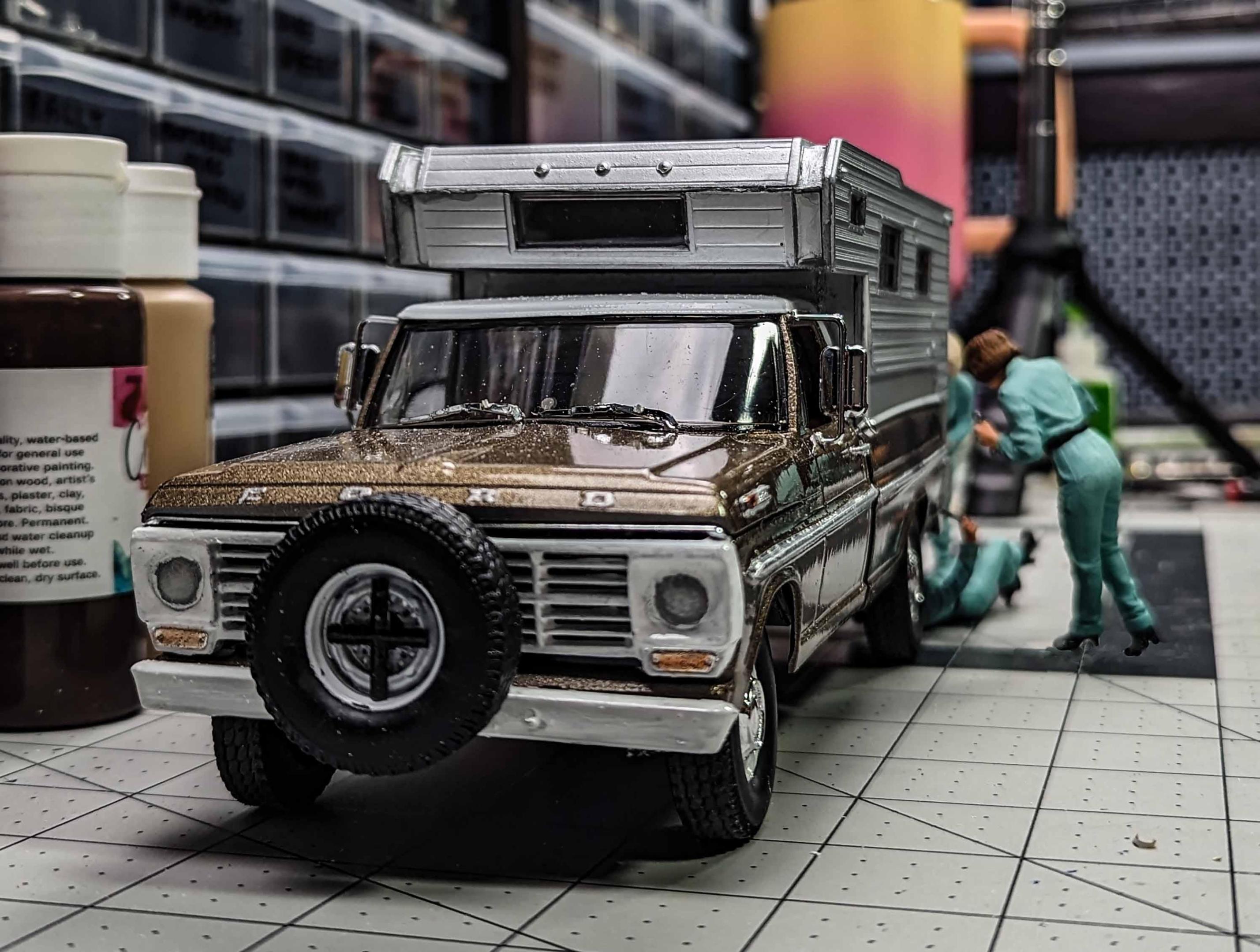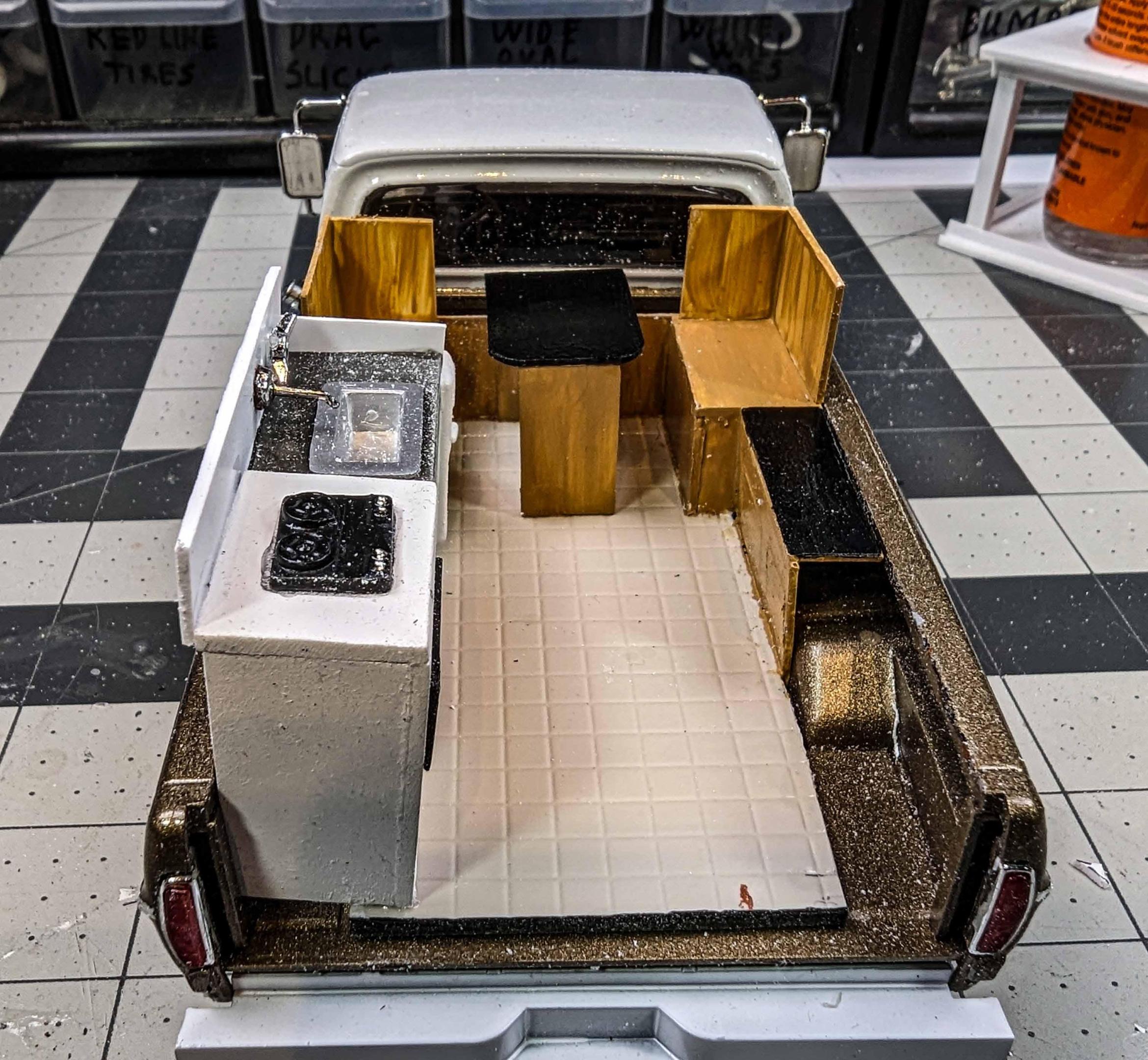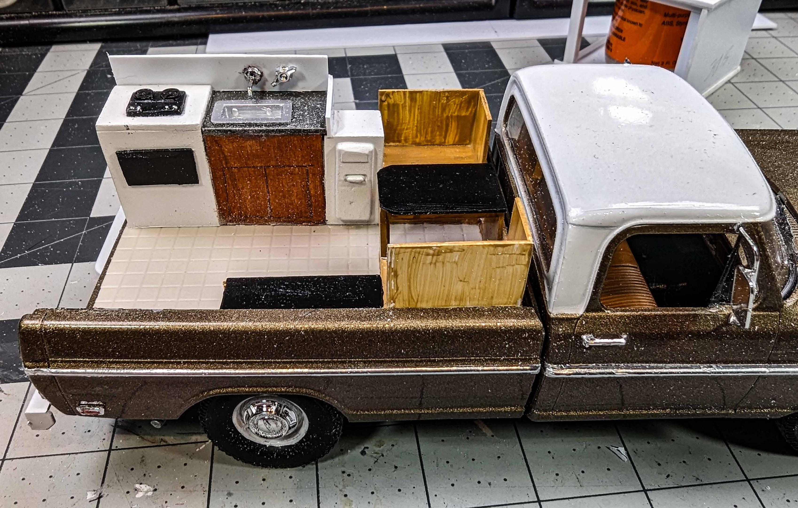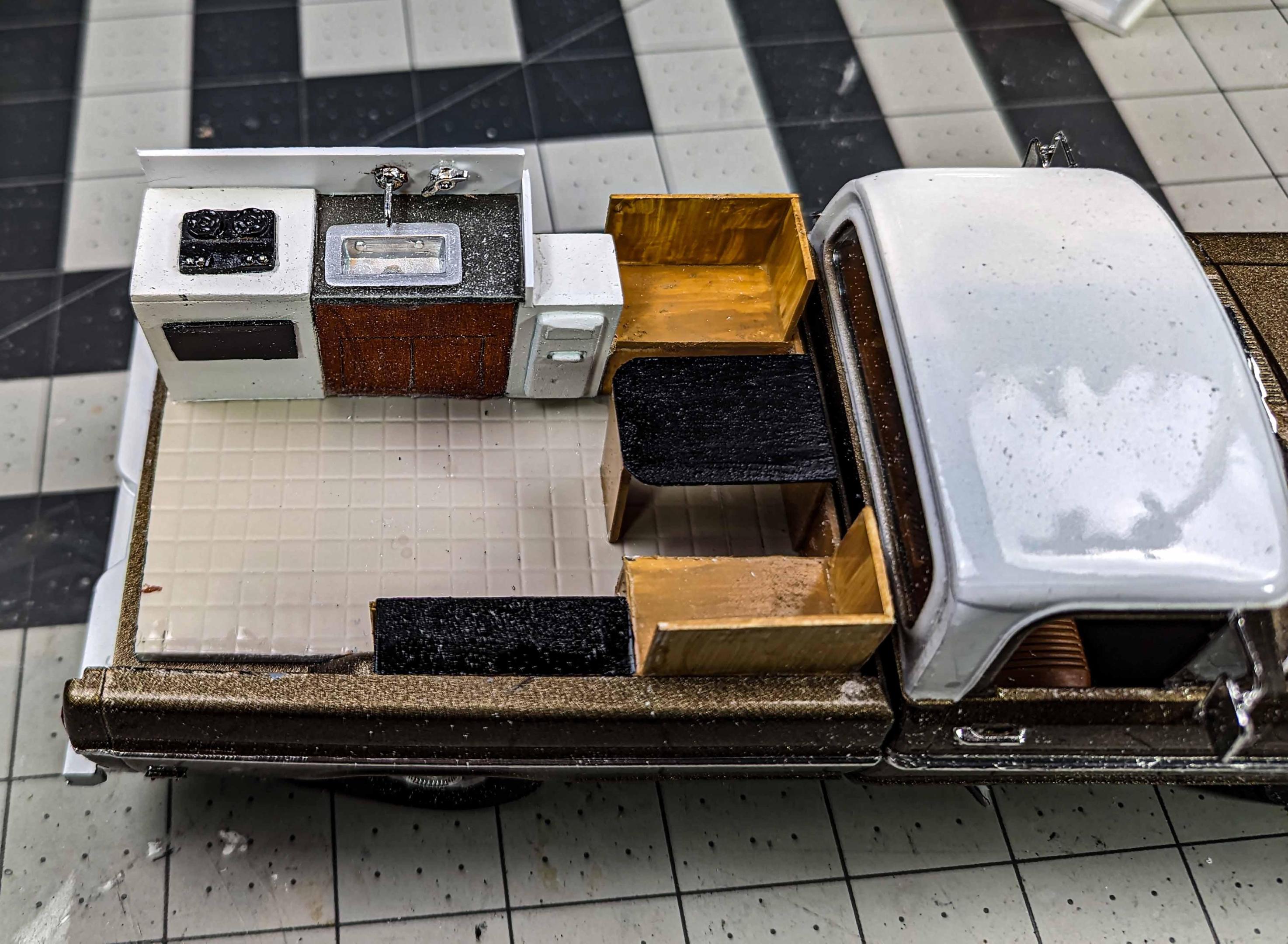 This Moebius 1968 Ford F-250 pickup is being combined with the camper from the AMT 1965 El Camino. The camper is being modified to fit the truck, as part of a YouTube group build. The alterations for the truck consisted of moving the spare tire to the front, removing chrome from the grill/front bumper, and removing some side trim, to lower the model status. The camper had to be widened and have additional sheeting added to the side. Inside it gained a ceiling panel with lights, a reworked bed from the White Freightliner kit, cupboards/closets, table, seating, tile floor, refrigerator, sink, and stove. I still have some marker lights to add as well as tail lights for the camper unit. There will also be a boat added to complete the rig. These are only in construction photos. When I'm done, I'll get better quality photos and post the rig to the completed forum.