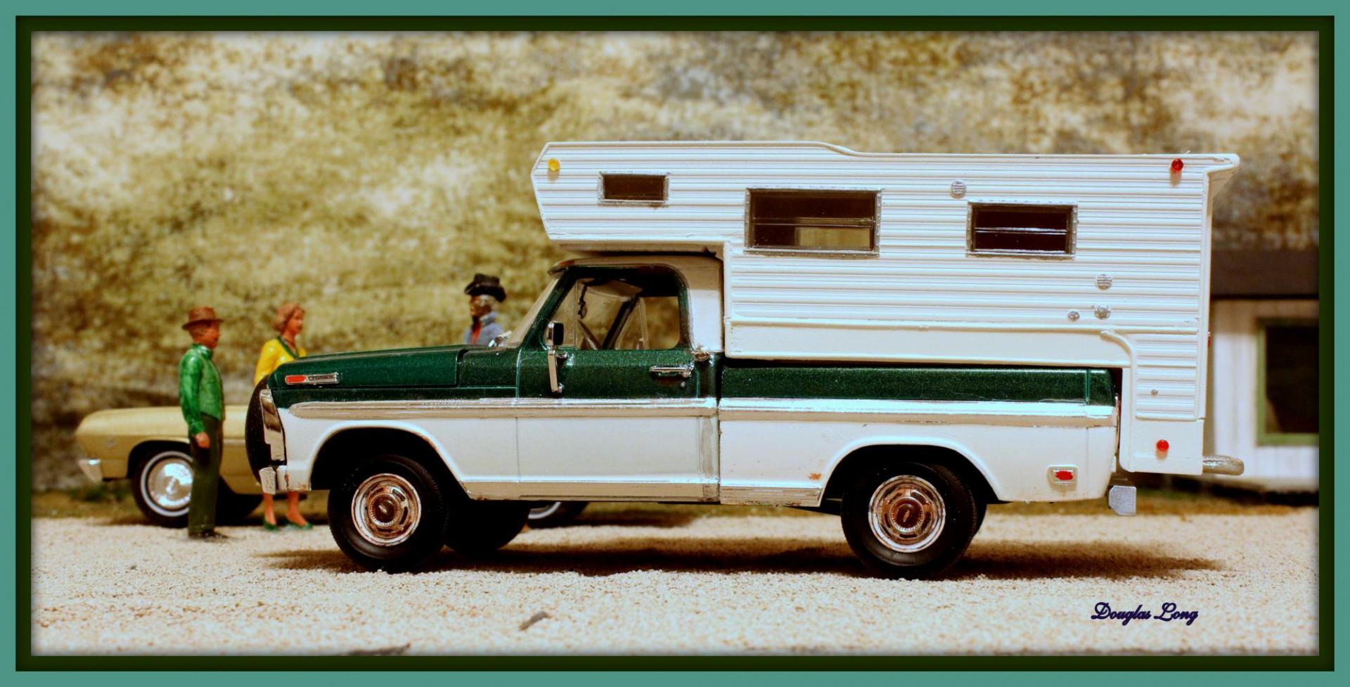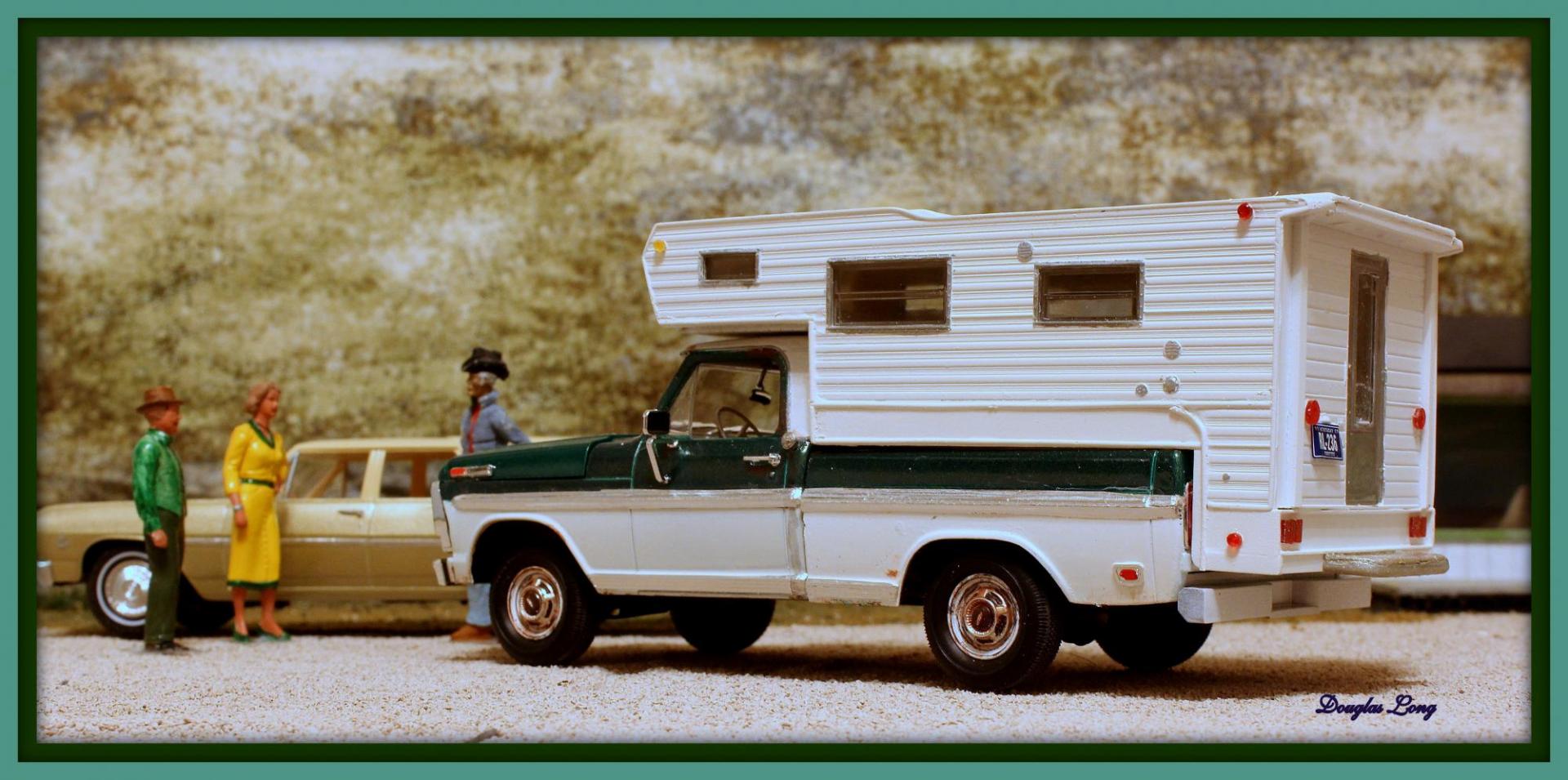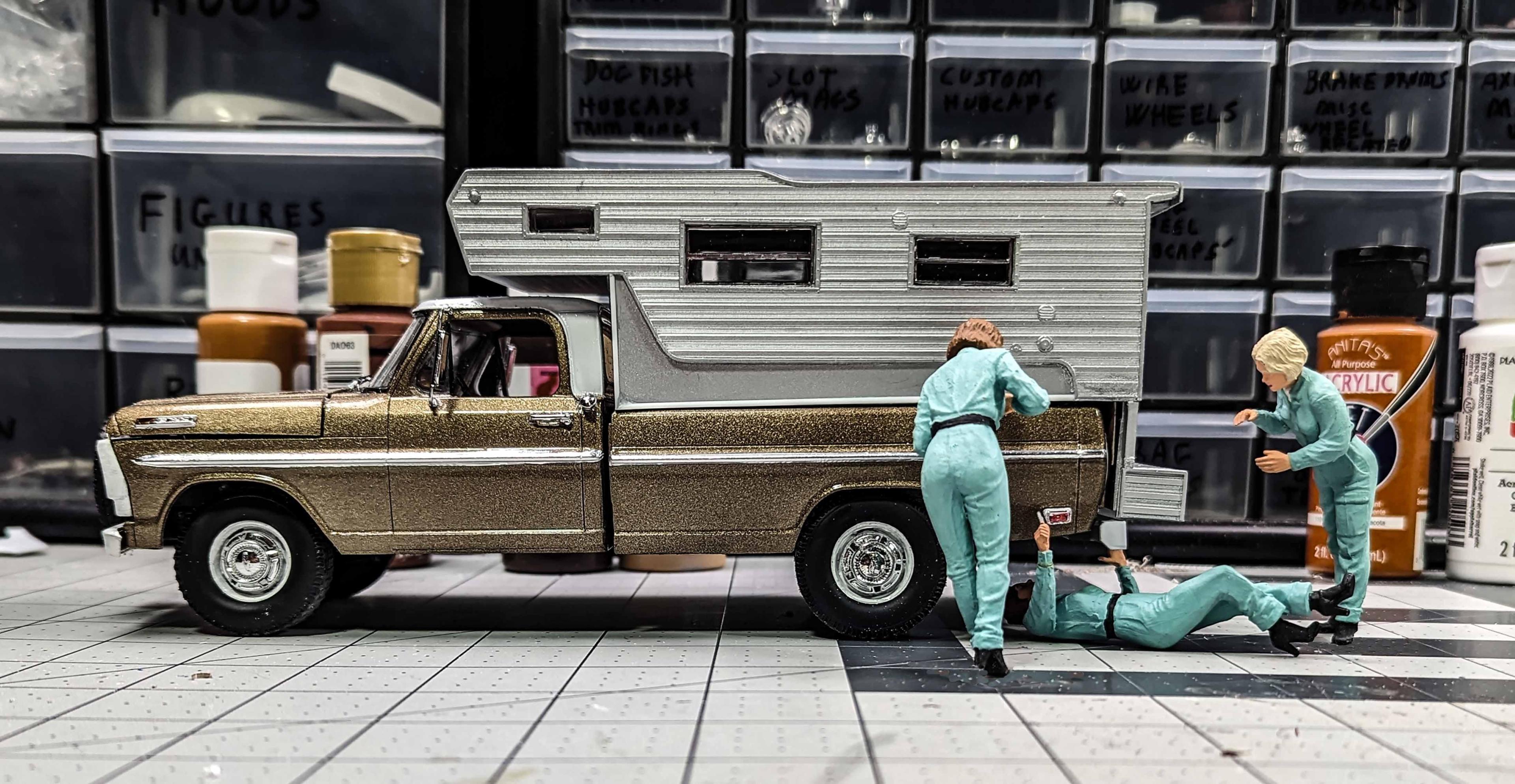 This Moebius 1968 Ford F-250 pickup is being combined with the camper from the AMT 1965 El Camino. The camper is being modified to fit the truck, as part of a YouTube group build. The alterations for the truck consisted of moving the spare tire to the front, removing chrome from the grill/front bumper, and removing some side trim, to lower the model status. The camper had to be widened and have additional sheeting added to the side. Inside it gained a ceiling panel with lights, a reworked bed from the White Freightliner kit, cupboards/closets, table, seating, tile floor, refrigerator, sink, and stove. I still have some marker lights to add as well as tail lights for the camper unit. There will also be a boat added to complete the rig. These are only in construction photos. When I'm done, I'll get better quality photos and post the rig to the completed forum.