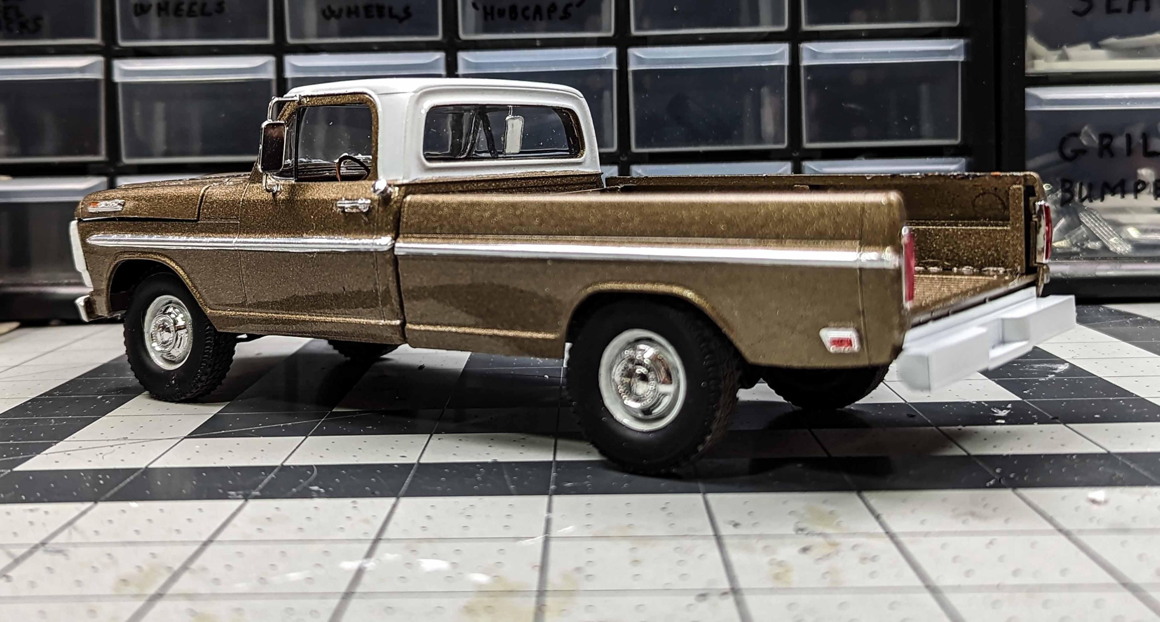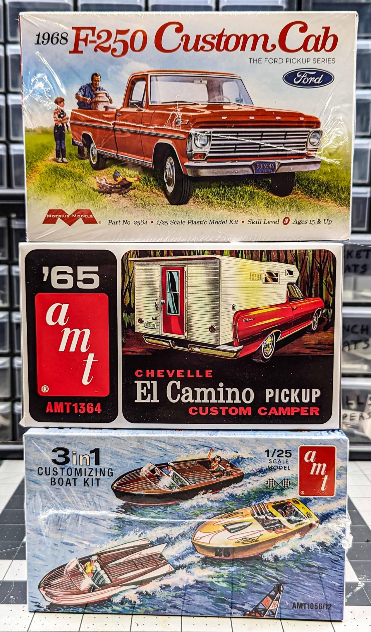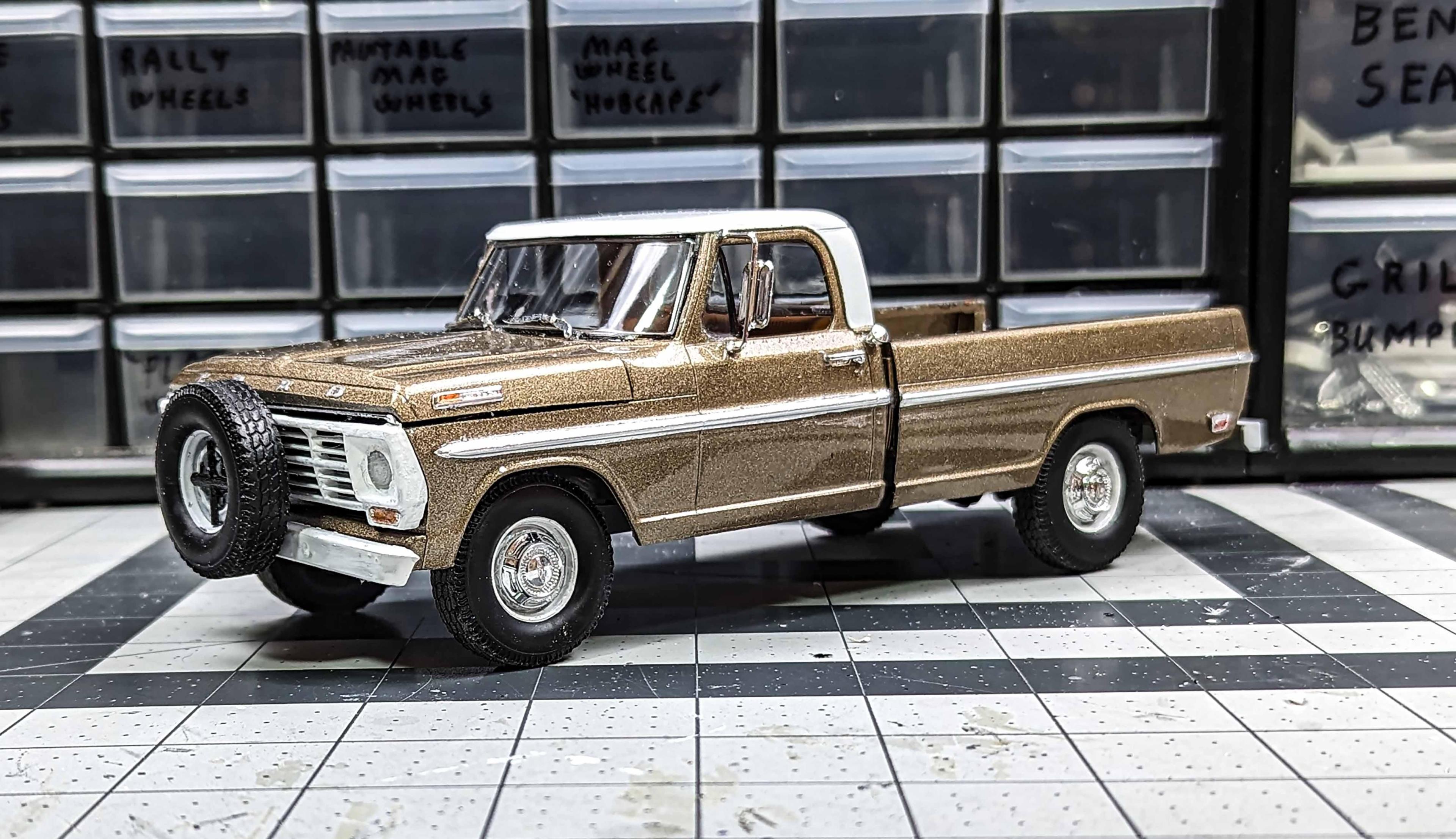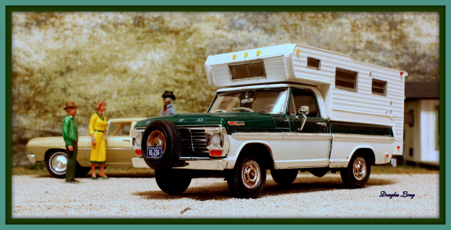 This Moebius 1968 Ford F-250 pickup is being combined with the camper from the AMT 1965 El Camino. The camper is being modified to fit the truck, as part of a YouTube group build. The alterations for the truck consisted of moving the spare tire to the front, removing chrome from the grill/front bumper, and removing some side trim, to lower the model status. The camper had to be widened and have additional sheeting added to the side. Inside it gained a ceiling panel with lights, a reworked bed from the White Freightliner kit, cupboards/closets, table, seating, tile floor, refrigerator, sink, and stove. I still have some marker lights to add as well as tail lights for the camper unit. There will also be a boat added to complete the rig. These are only in construction photos. When I'm done, I'll get better quality photos and post the rig to the completed forum.