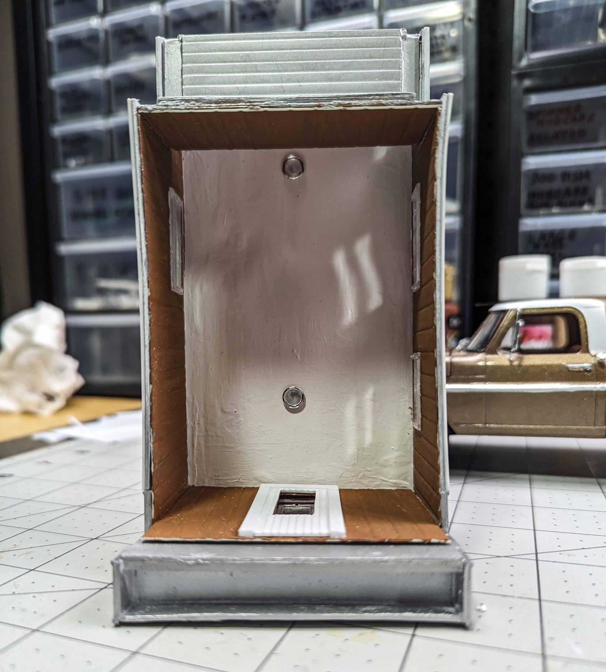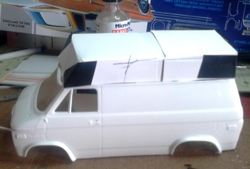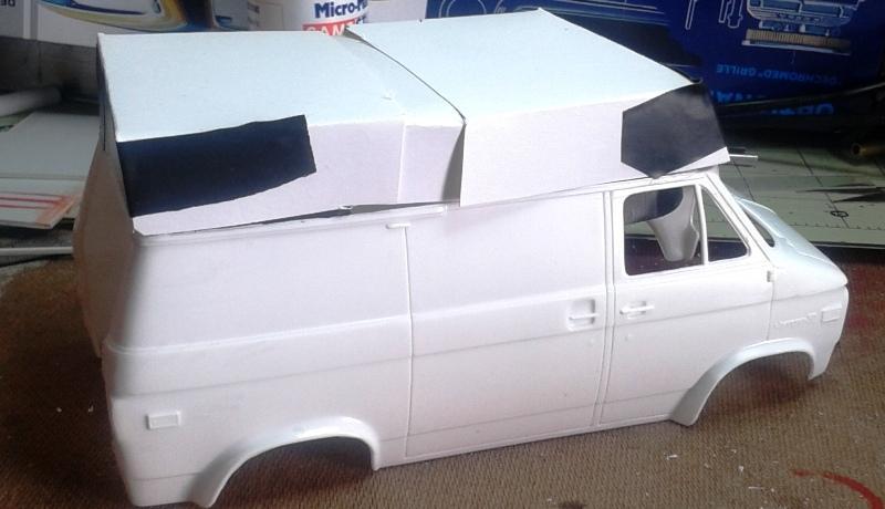 My current build is the 1977 Chevy Van, that I am going to build into a camper. I have removed the roof to add a 24 inch extension and cut the back doors open. My intention is to add a cabinet with Microwave, Refrigerator, and sink; a table and chairs, bench seat/fold down bed, as well as storage overhead of the van cab. Carpet will be grey felt and the walls will have simulated paneling. The raised roof with simulate the fiberglass cap that was relatively common for conversion vans back then. I plan to paint the van white and use the blue decals that came with the kit to decorate the outside. Jeff