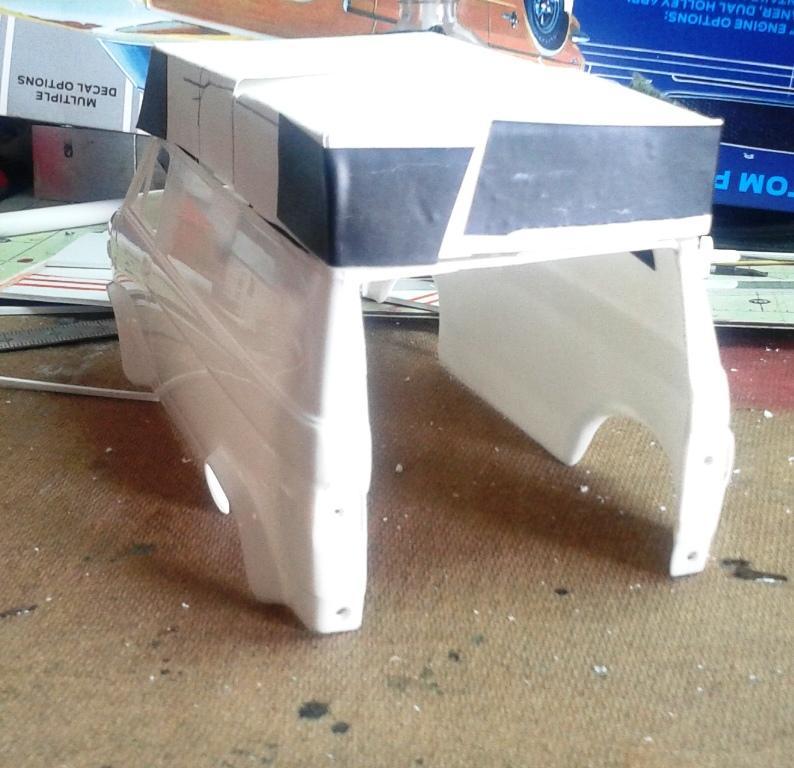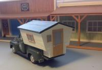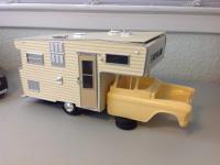 This is a mock-up of my Open Road Camper, with a 1955 Chevy Cameo in front of it. The original release of the camper kit came with a truck. I believe it was a 1967 Chevy. But the AMT re-release did not come with a truck. It was a 'stand alone' camper. I wanted to connect it to a truck, but found it hard to find a match. As you can see here on the photo, the suspension of the camper is too low. I placed the camper on a sanding stick to verify the difference in hight. I think I need to take the wheels off under the camper and elevate the suspension a bit.