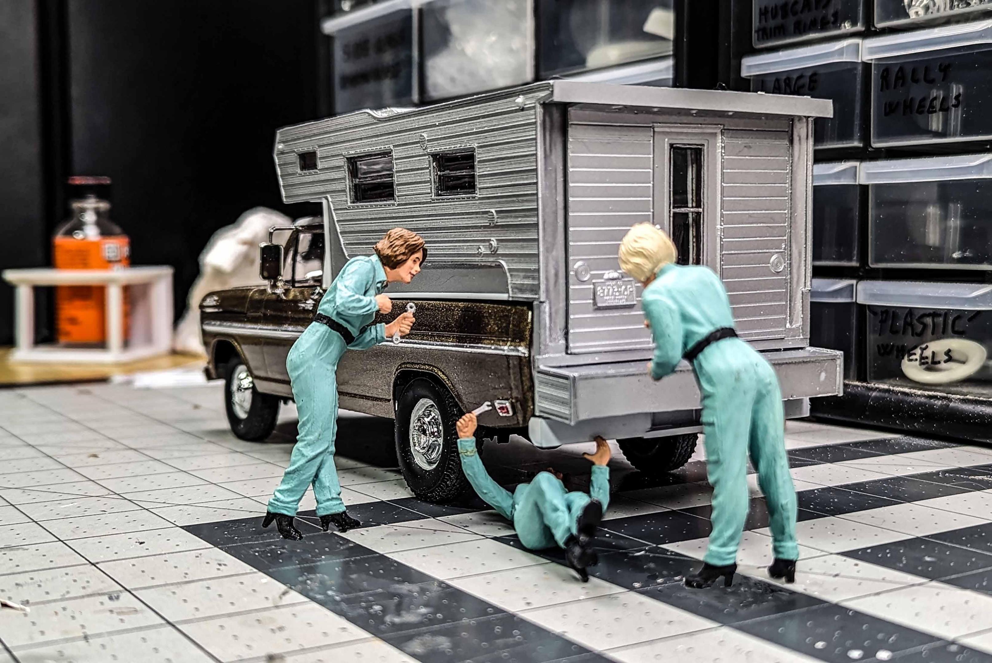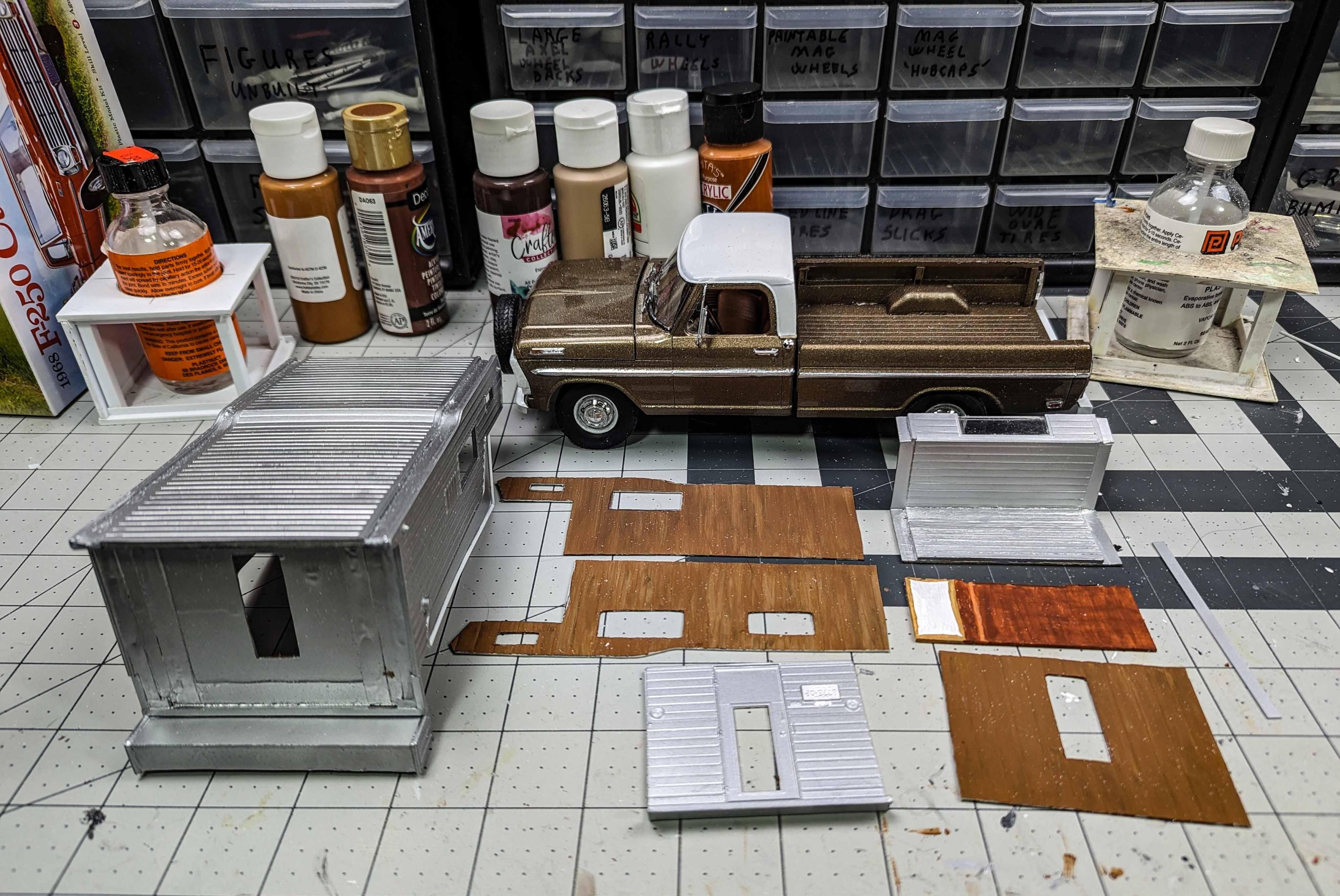 Model Kings Camper set. Im going with a 1964 Chevy pick up Truck, I've cut out the truck and camper to make it a pass thru. The chassis and truck body is nearly finished, it's getting the matching truck bed as a trailer, And a bit of a Corvette theme.