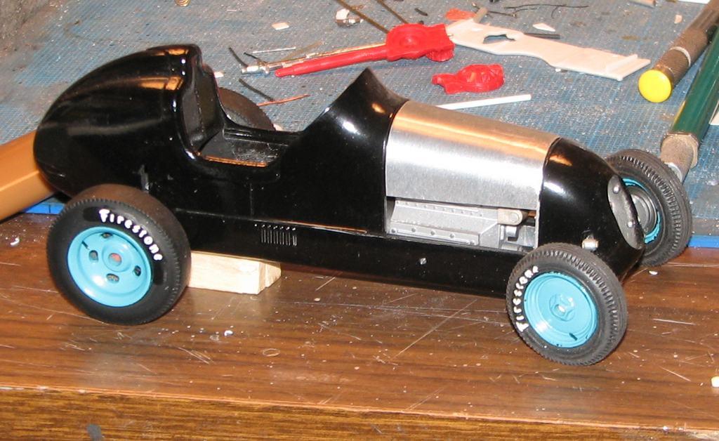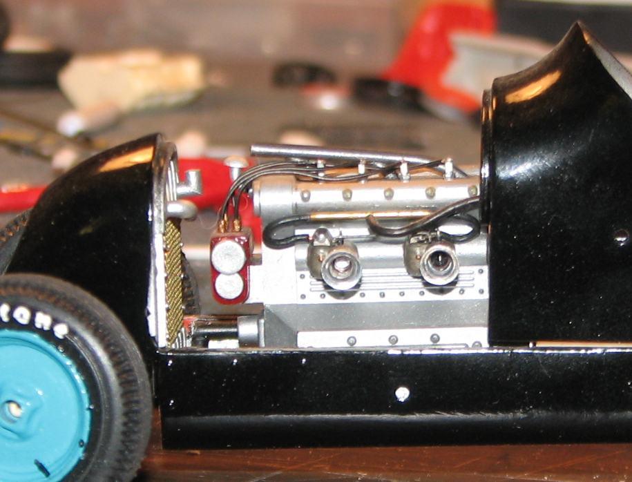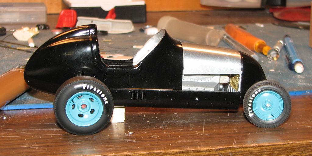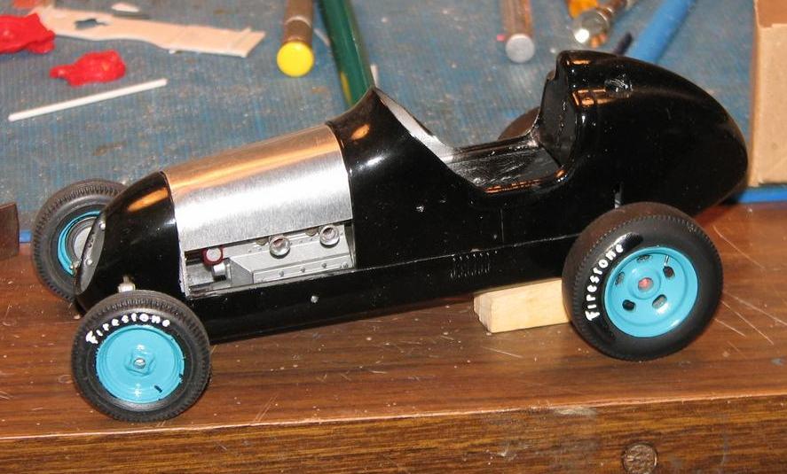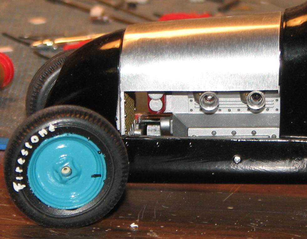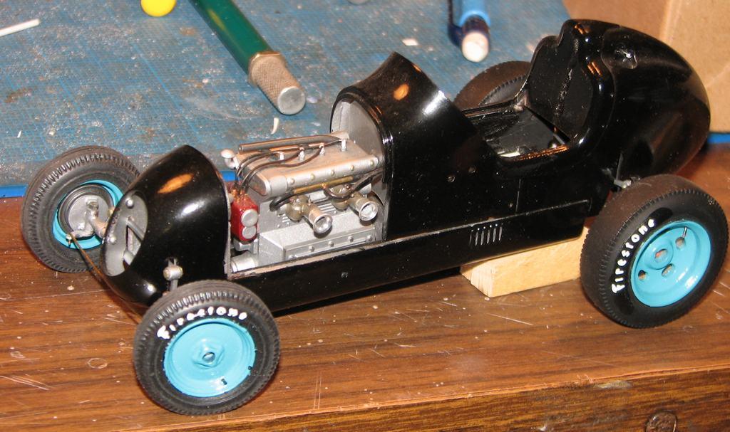 I started work on this almost twenty years ago, moved on to something else, and put it back in the closet. Last night, I decided to get it out and take some better photos of it. It began as Monogram's old off-scale Midget kit. Inspired by the old Belanger Special Indy car, I cut it apart and lengthened it, to better represent one of the "big cars". I am considering finishing it up, as I don't think it would require too much time (relatively speaking) to do so. The radiator is completely scratchbuilt. The firewall, hood and seat support are aluminum sheet. Evergreen styrene tube and half-round were used to represent the chassis tubing. The dash has photo-reduced gauges, is covered with "tooling aluminum" found at a crafts store, with bezels (one of which has detached and departed) made from aluminum tubing. Most of it is from the kit, with some modifications and/or enhancements. I've said before that I love these old Monogram kits! I've also been told that I do much more work on them, than they deserve! For me, they capture a real sense of Americana and nostalgia, and, given some attention, they look pretty cool, sitting in the display case. Comments and questions welcome. Thanks for having a look!