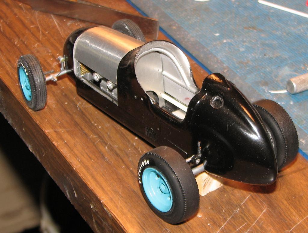 After a year of trying this and that, I finished this crazy kitbash project. Based around the Monogram 1/48 scale P=40 Warhawk, AMT Model T frame, suspension parts from Airfix's 1/32 Omnibus, and a mish-mash of other bits I either grabbed from the parts pile, or built myself. Drive system drops from behind the prop spinner to a shaft running under the engine to the rear axle. After these photos were taken, I added hexnuts to cap the front hubs. Figure is a 1/43 '50s sports car driver in resin.