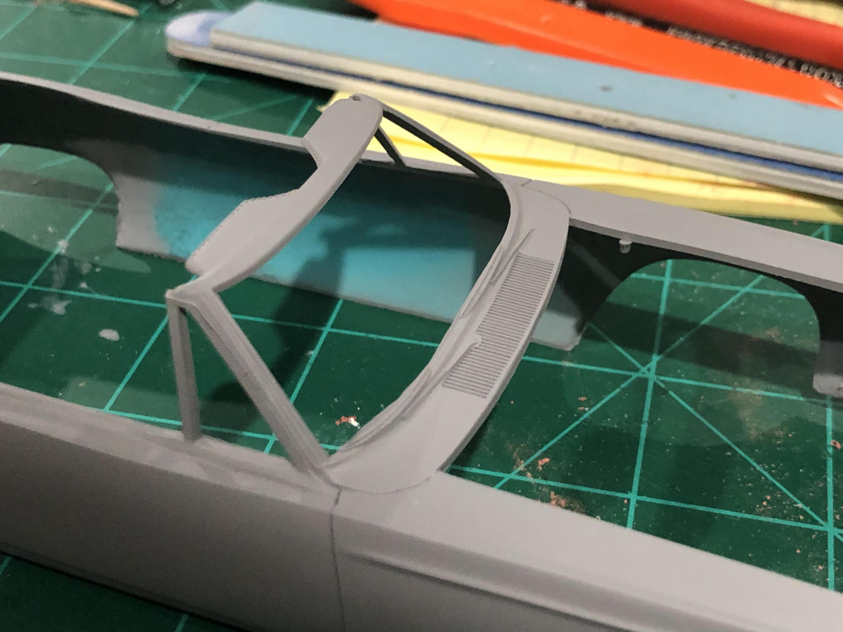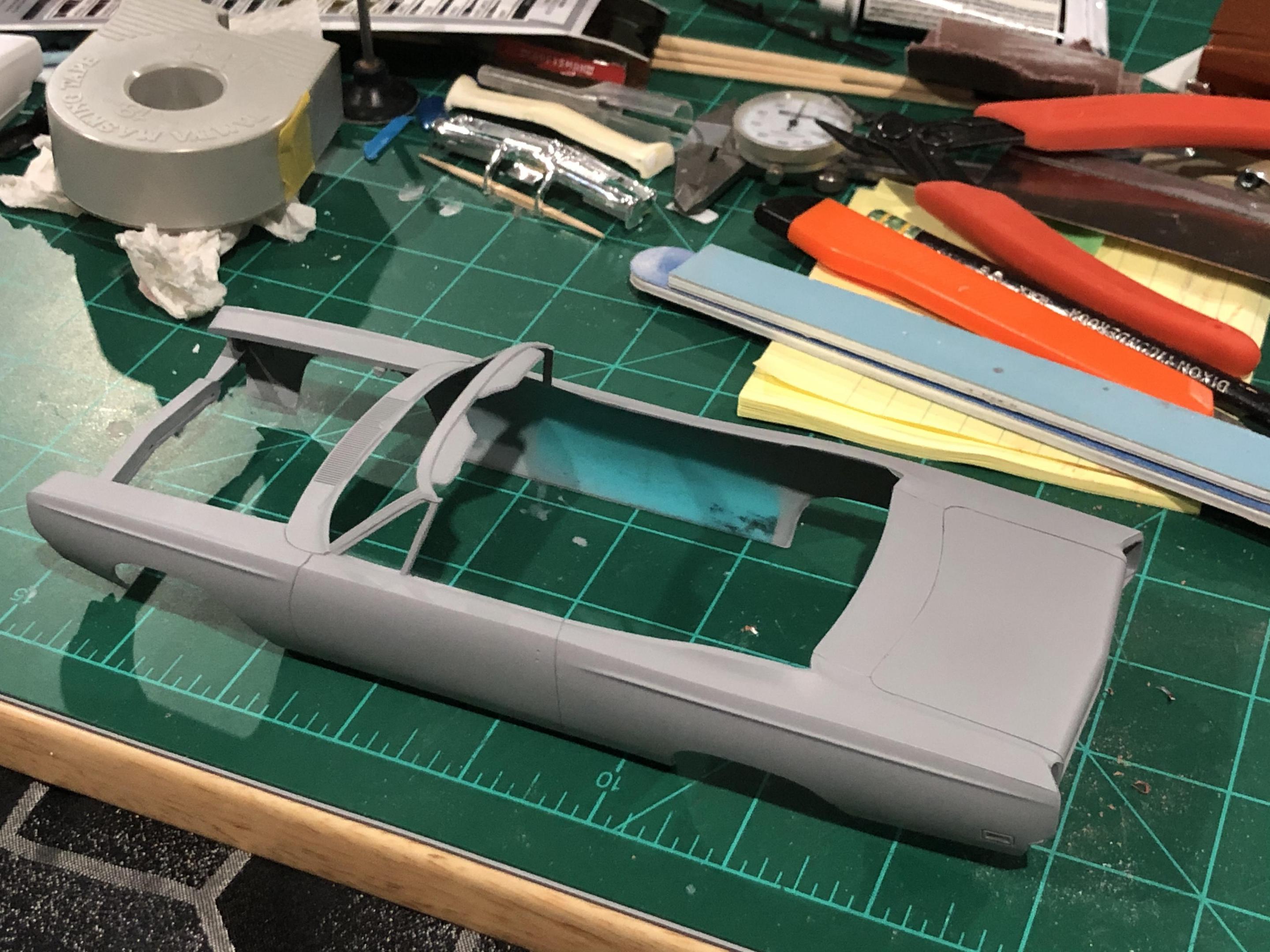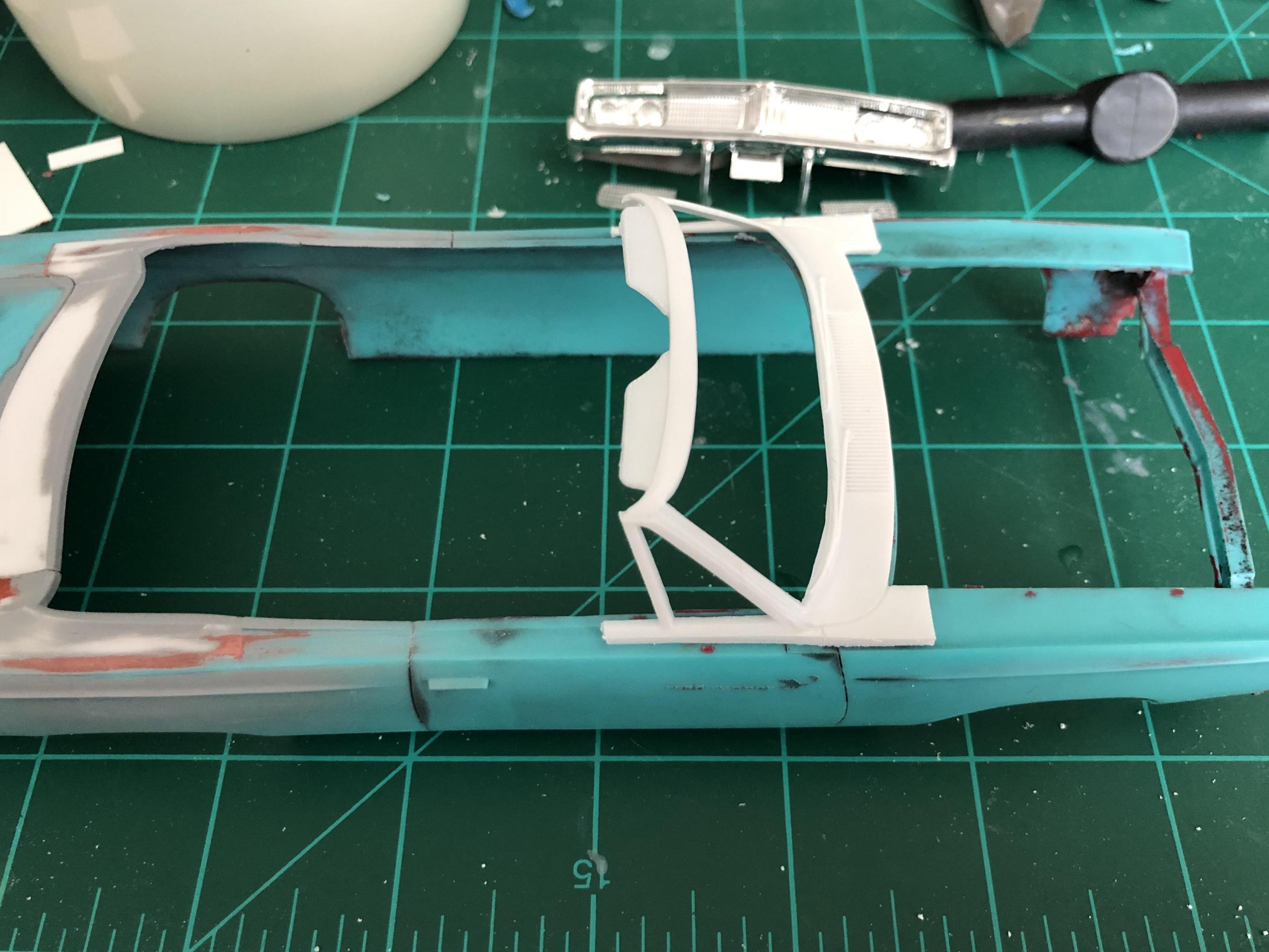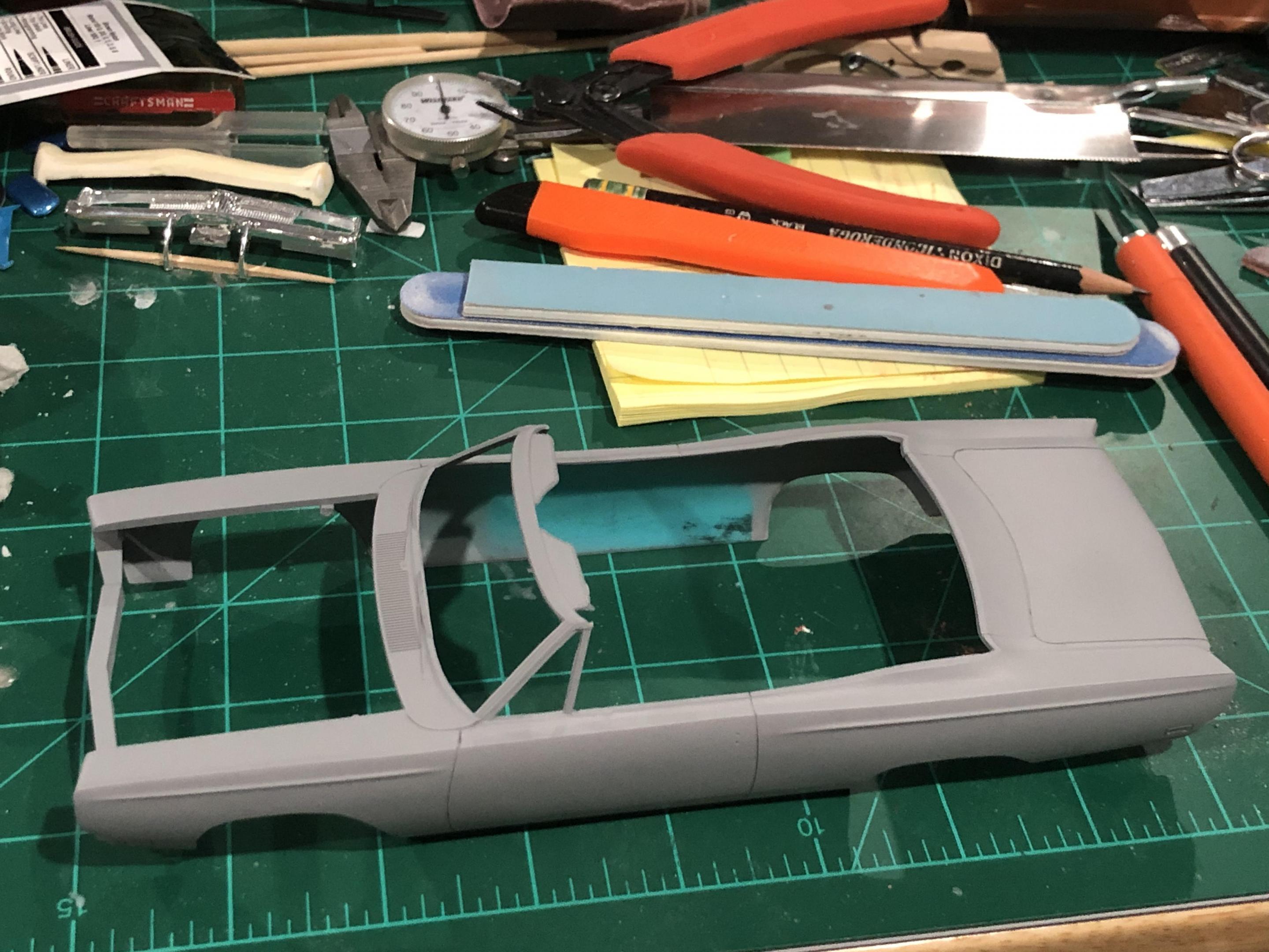 I bought a couple Jo-han 1969 Road Runners off eBay in recent weeks. This one in particular was more of a glue bomb than the other. So much glue was used to secure the glass that it melted the roof. I figured it would be a prime candidate for a convertible conversion. I picked up the AMT GTX convertible from Hobby Lobby, they conveniently reopened last week! I started by cutting out the tulip panel including tops of the quarter panels around the rear section of the interior. I had to narrow it a little bit at one of the natural seams. Then re-contour to match the shape of the deck lid. I removed the windshield surround from the GTX including the tops of the fenders and doors for added strength. Plus I kinda like the cowl shape better than Jo-han’s There are couple spots to sand, but it’s pretty much were I want it. I spent six hours, in a model car hang out online last night, fitting the interior. I will post those pictures a little bit later.