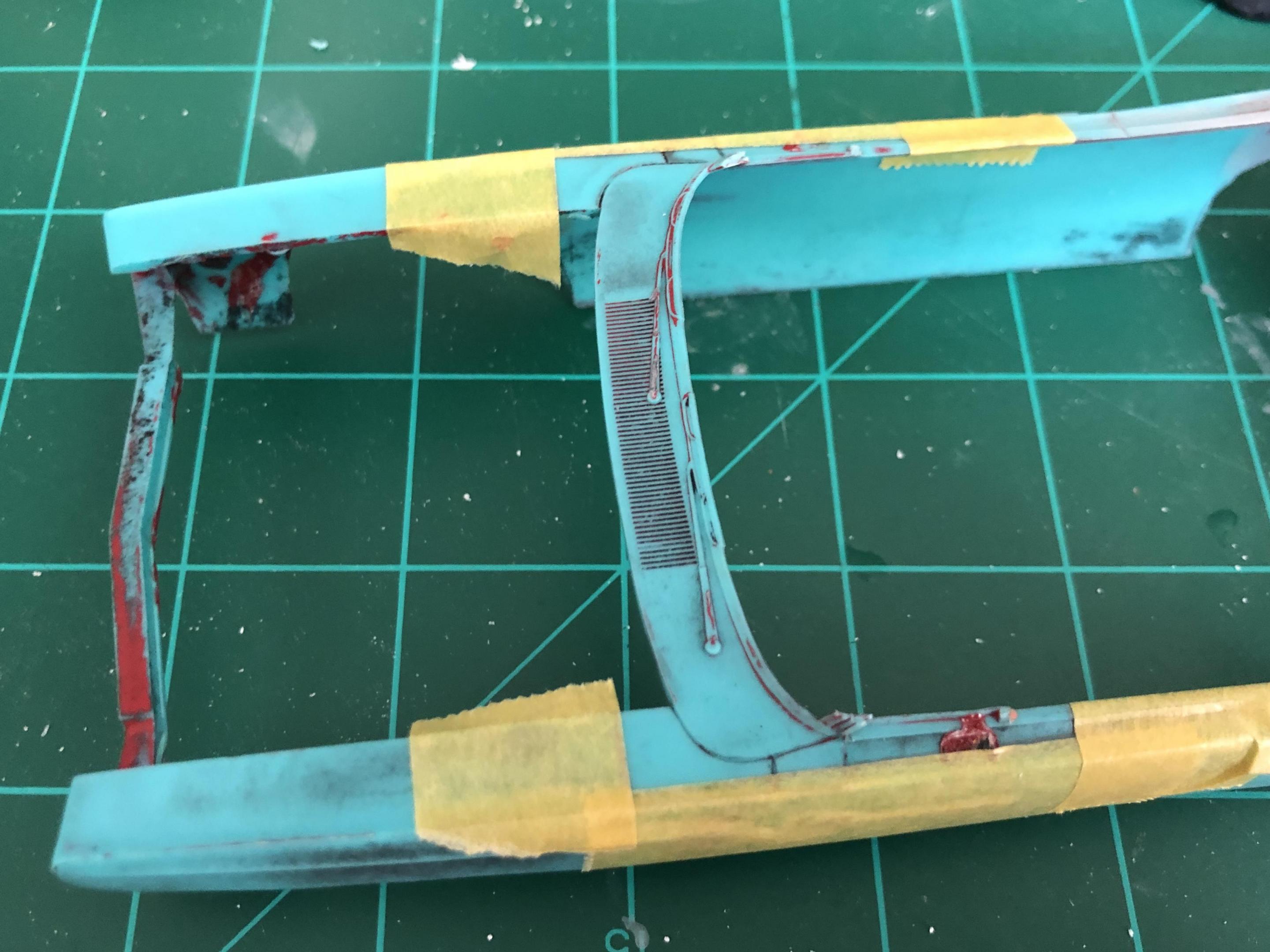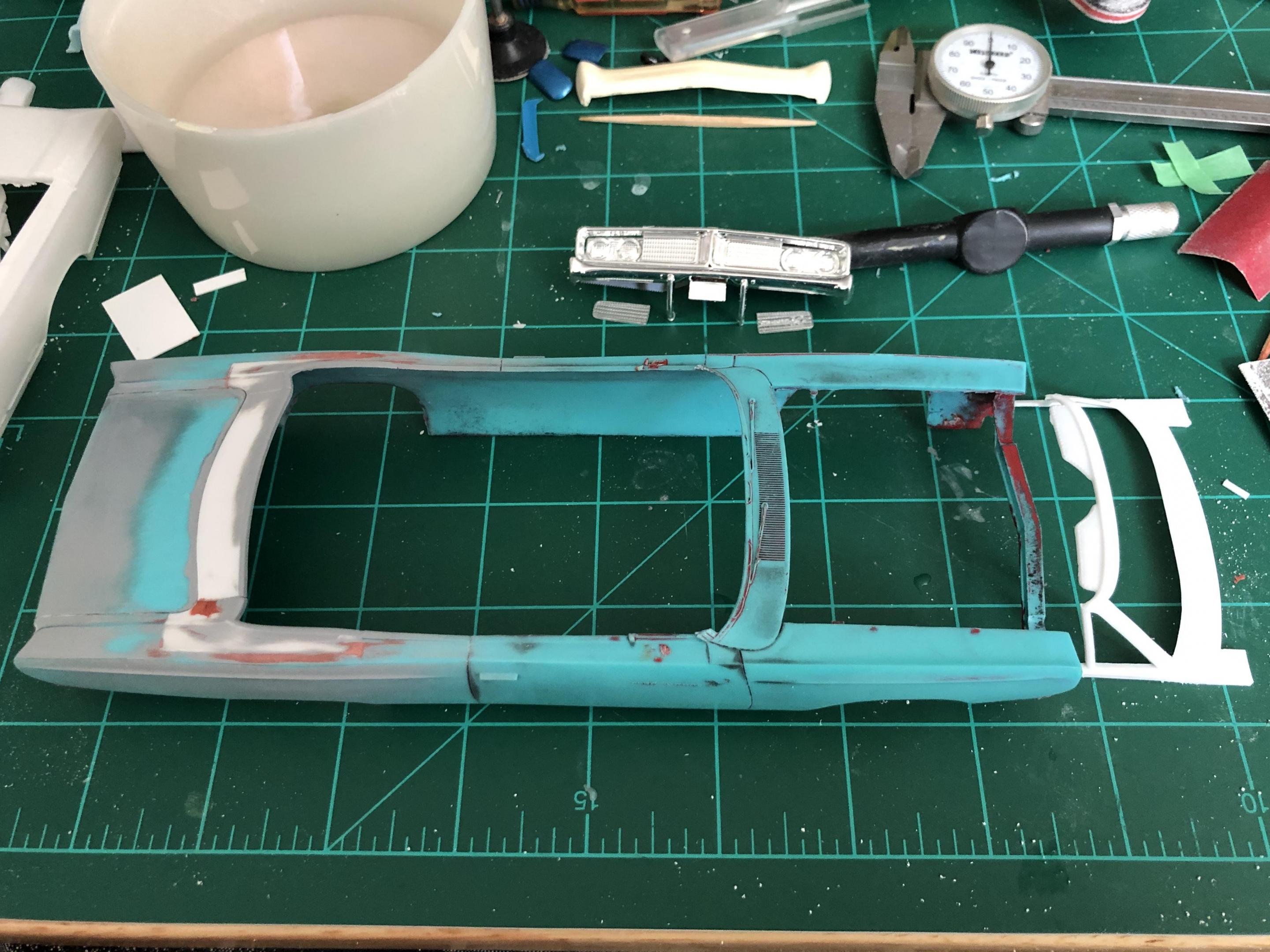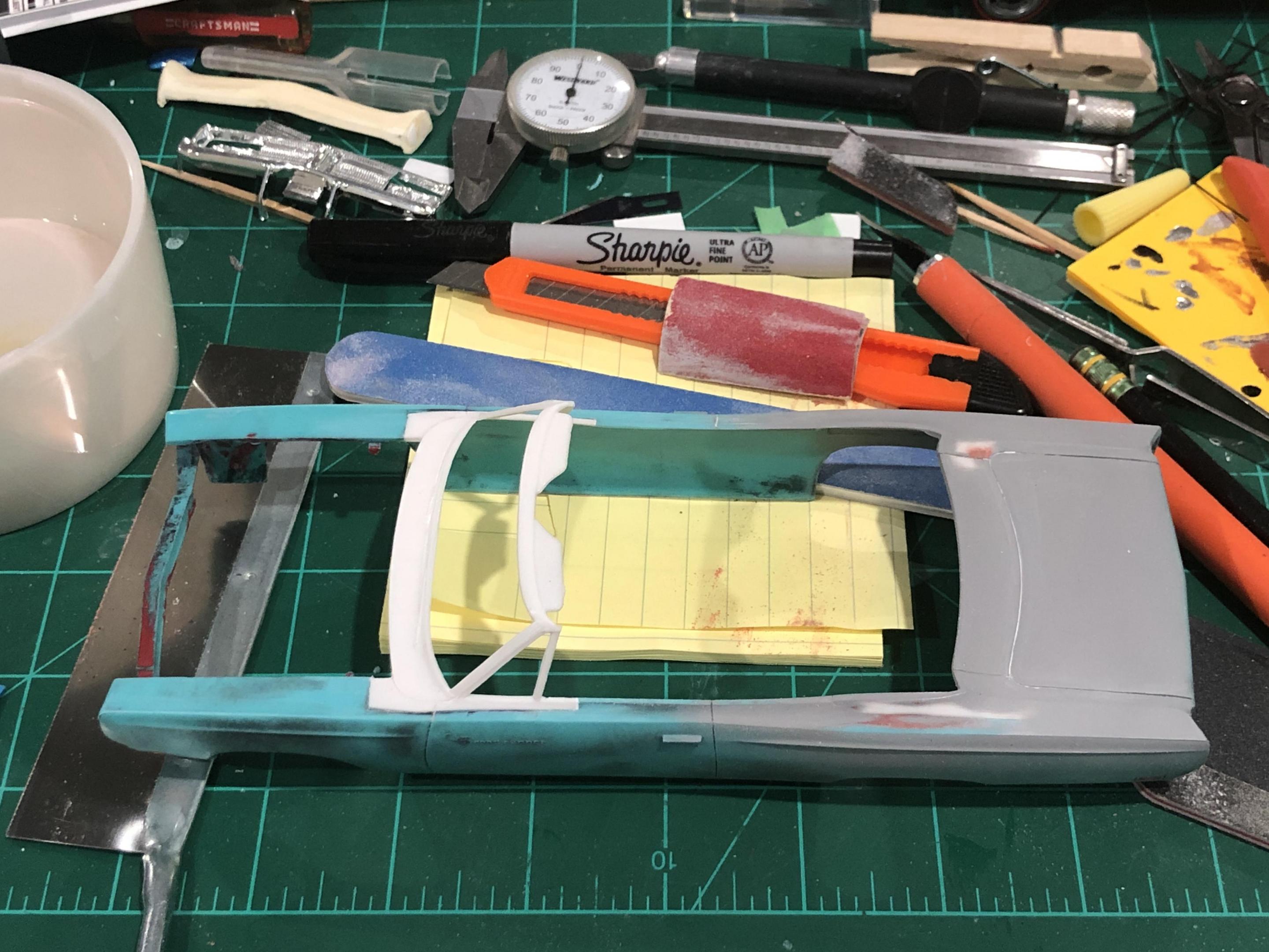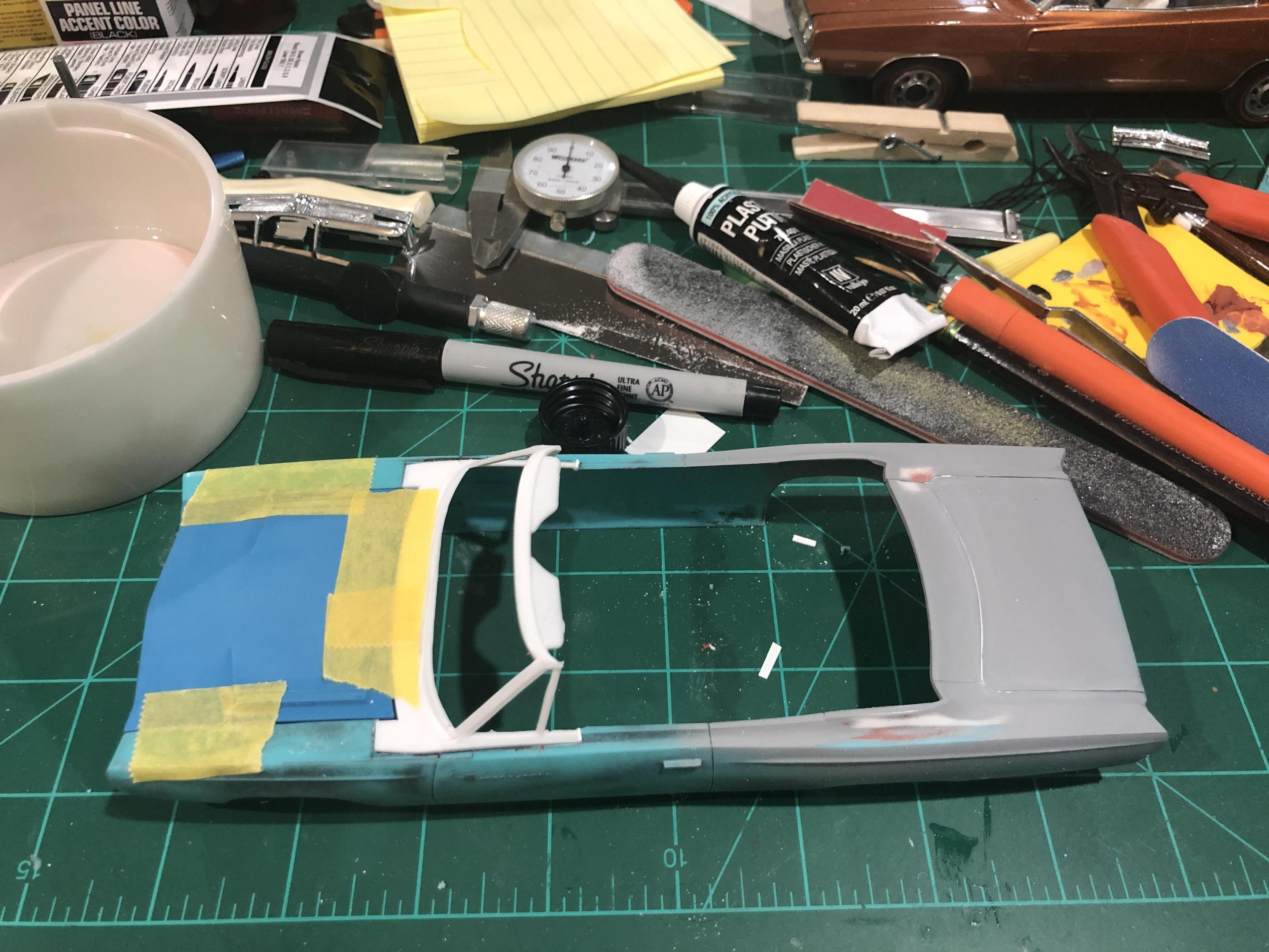I bought a couple Jo-han 1969 Road Runners off eBay in recent weeks. This one in particular was more of a glue bomb than the other. So much glue was used to secure the glass that it melted the roof. I figured it would be a prime candidate for a convertible conversion. I picked up the AMT GTX convertible from Hobby Lobby, they conveniently reopened last week! I started by cutting out the tulip panel including tops of the quarter panels around the rear section of the interior. I had to narrow it a little bit at one of the natural seams. Then re-contour to match the shape of the deck lid. I removed the windshield surround from the GTX including the tops of the fenders and doors for added strength. Plus I kinda like the cowl shape better than Jo-han’s There are couple spots to sand, but it’s pretty much were I want it. I spent six hours, in a model car hang out online last night, fitting the interior. I will post those pictures a little bit later.
