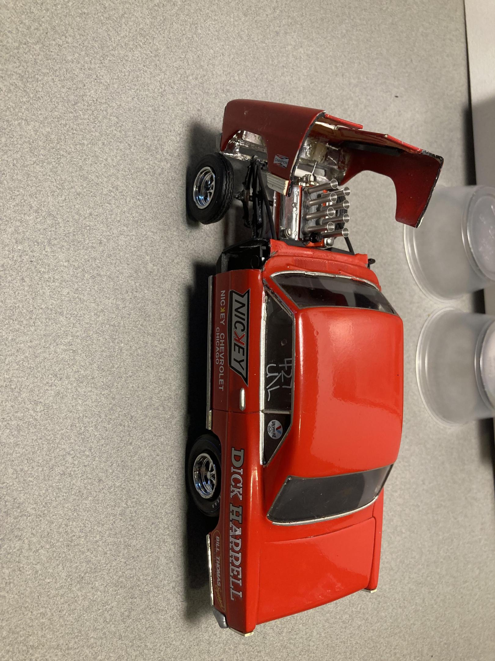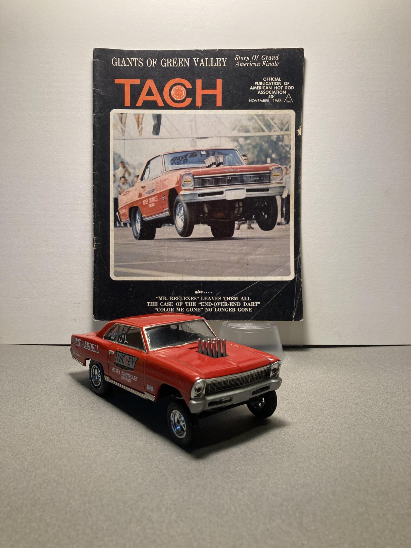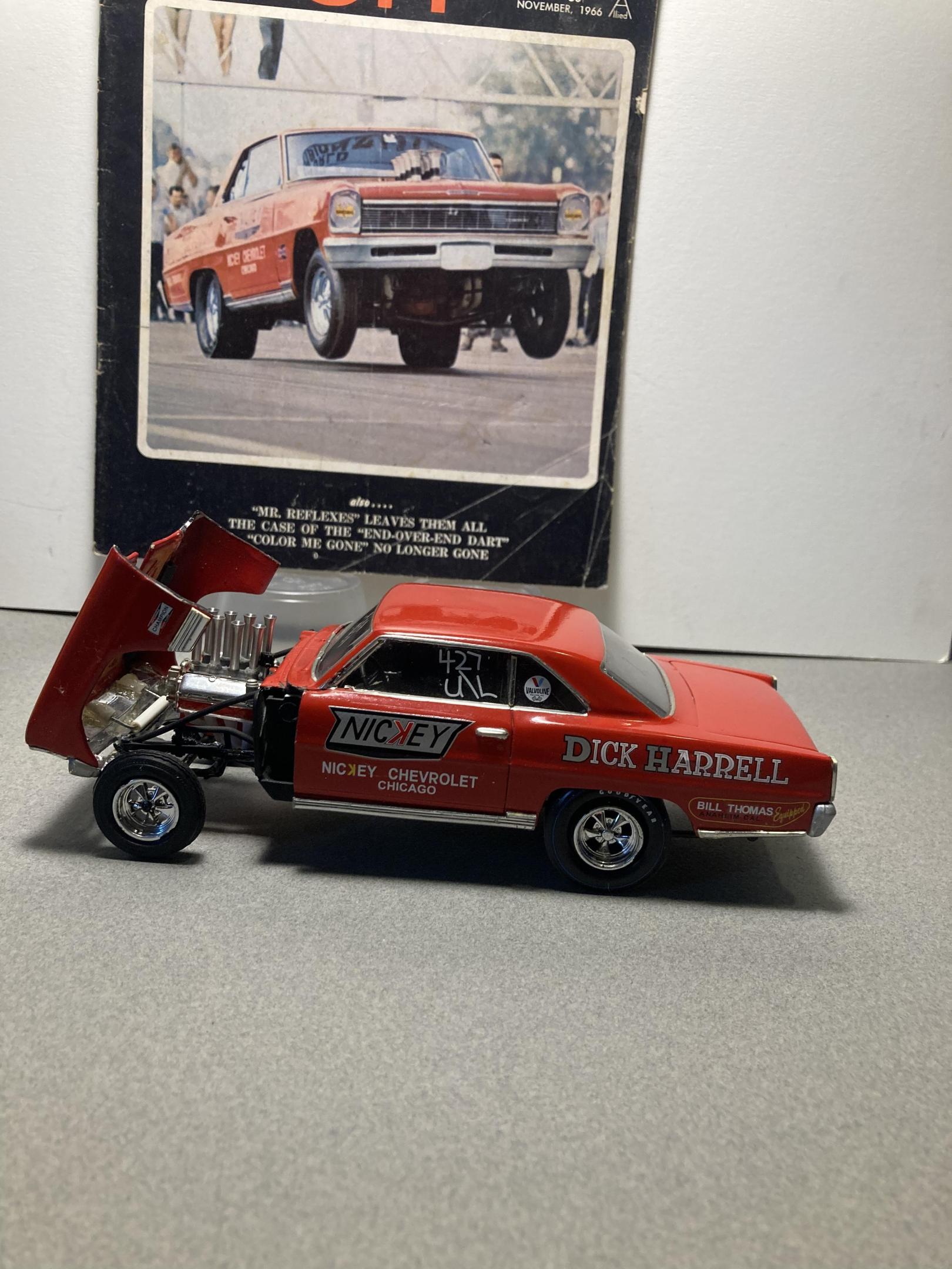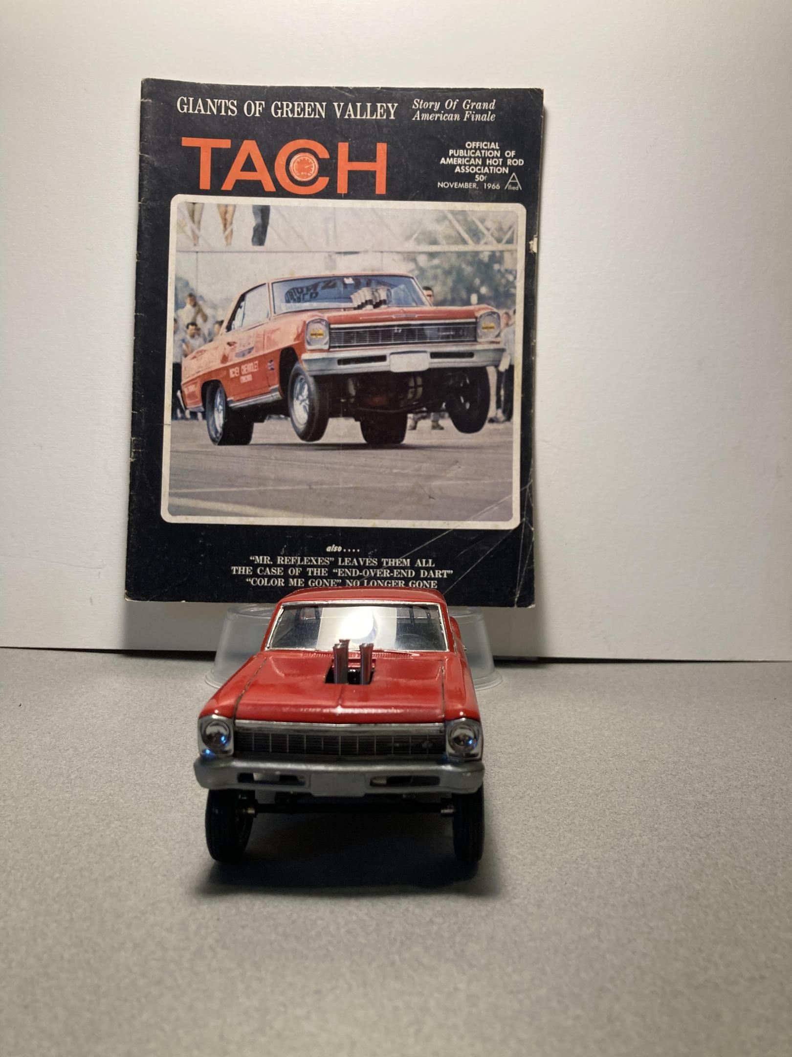 This one started off with the amt nova pro street kit. I altered the rear wheel wells separated the front fenders and made a one piece flip front end . In the engine compartment is a big block from the amt 1967 pro street chevelle kit with the injector manifold from the amt 63 corvette the stacks are aftermarket , the timing chain cover was in the amt 1939 ford sedan The wheels are from the old pro nova . The front leaf springs came from the amt 1933 Willy’s the axle is aluminum tubing . I made the roll bar from 0.80 plastic rod . The hurst t- handle shifter is from the mpc flip front 1953 ford pickup. Amt blue streaks out back and Firestone supreme tires up front. The beautiful red enamel is plain old testors topped with slixx decals. as always thanks for looking ?, Mike