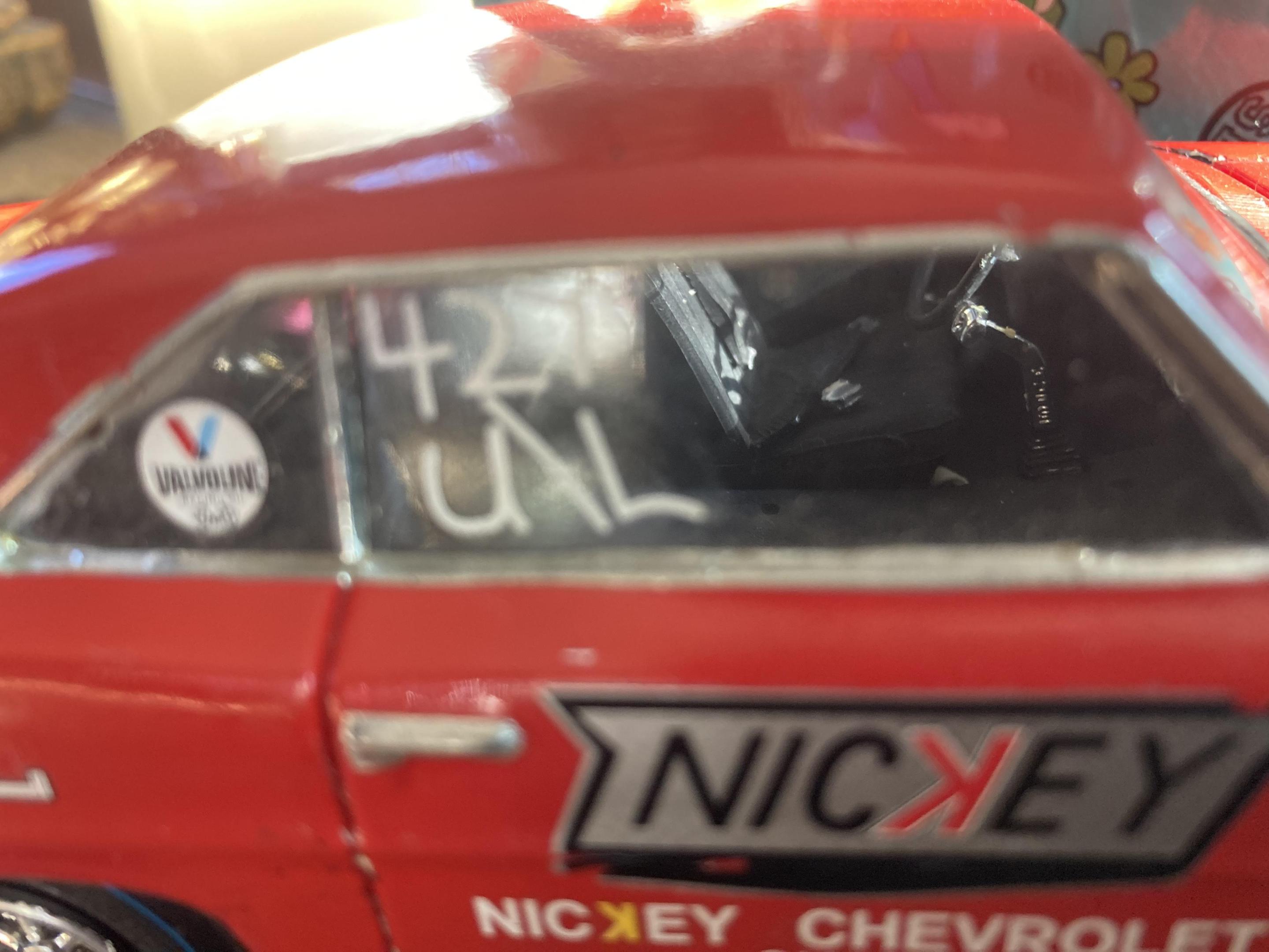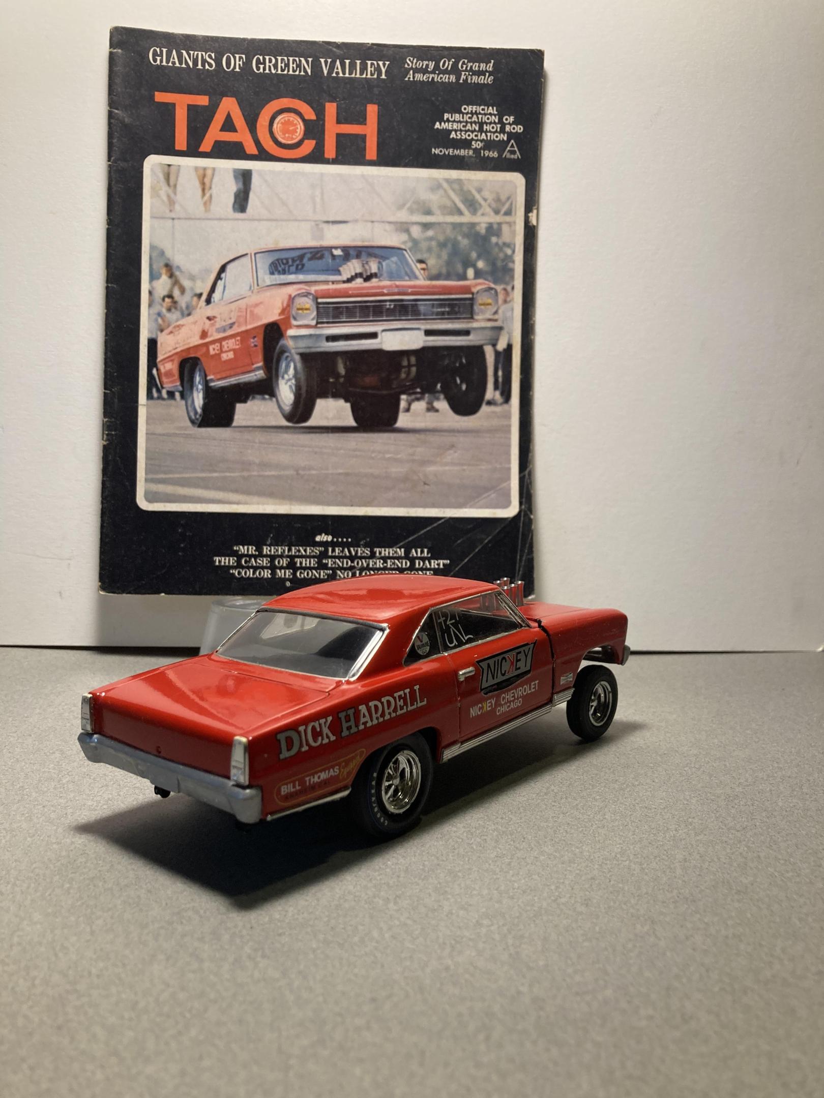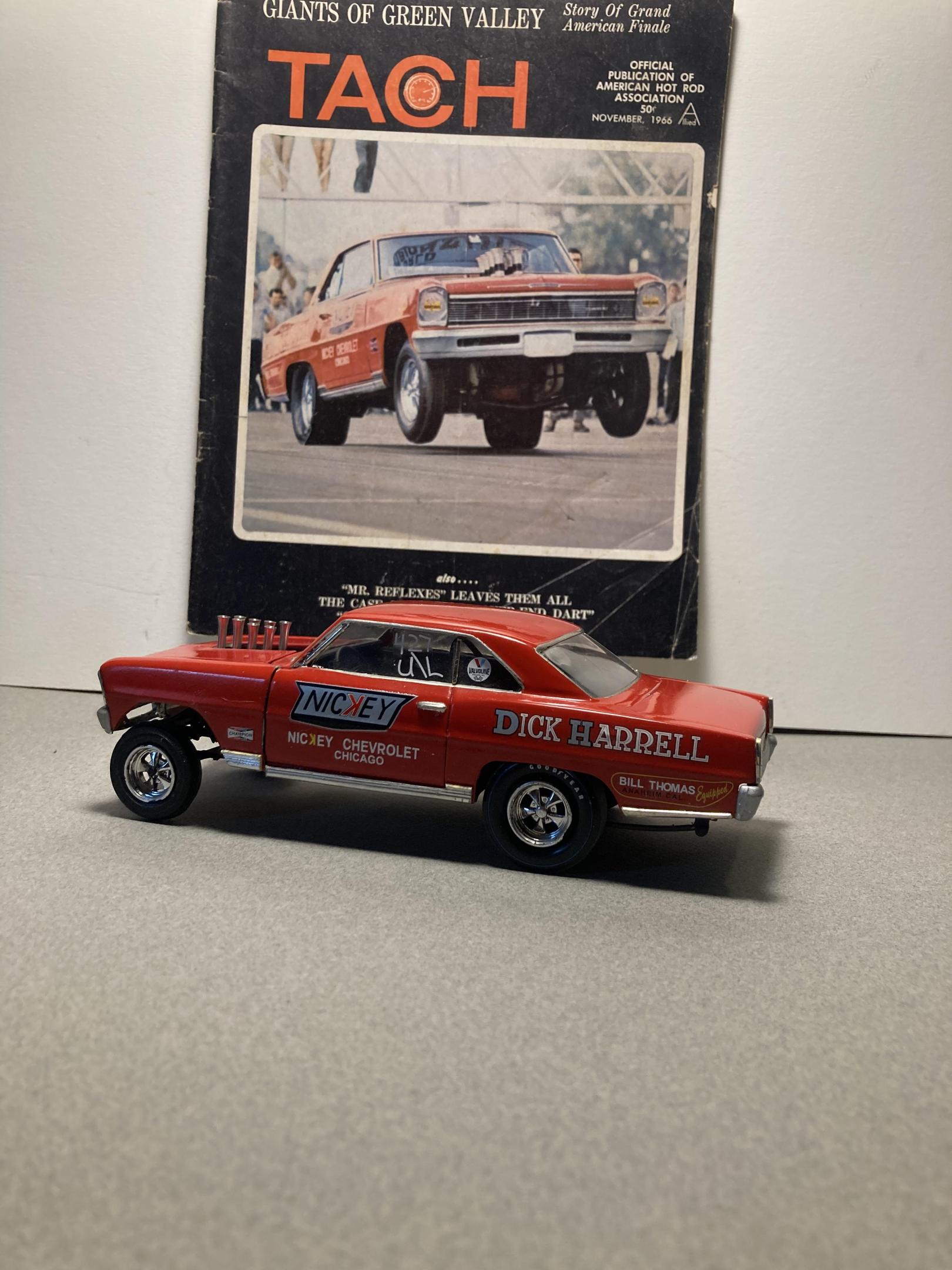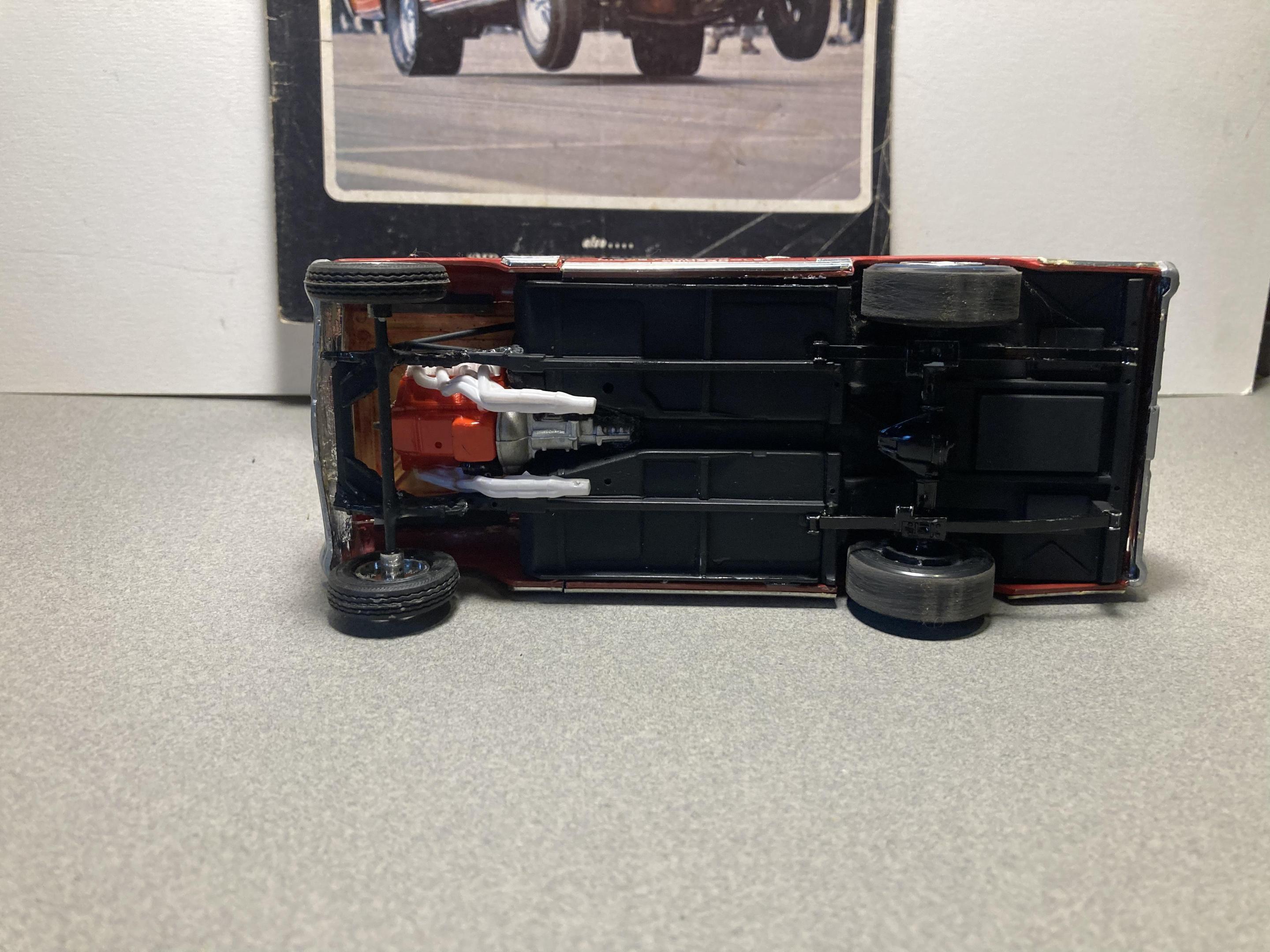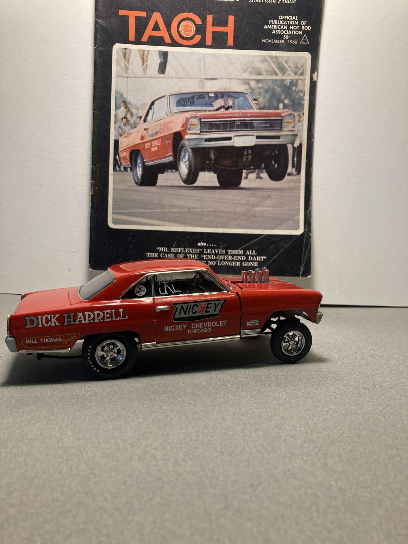 This one started off with the amt nova pro street kit. I altered the rear wheel wells separated the front fenders and made a one piece flip front end . In the engine compartment is a big block from the amt 1967 pro street chevelle kit with the injector manifold from the amt 63 corvette the stacks are aftermarket , the timing chain cover was in the amt 1939 ford sedan The wheels are from the old pro nova . The front leaf springs came from the amt 1933 Willy’s the axle is aluminum tubing . I made the roll bar from 0.80 plastic rod . The hurst t- handle shifter is from the mpc flip front 1953 ford pickup. Amt blue streaks out back and Firestone supreme tires up front. The beautiful red enamel is plain old testors topped with slixx decals. as always thanks for looking ?, Mike