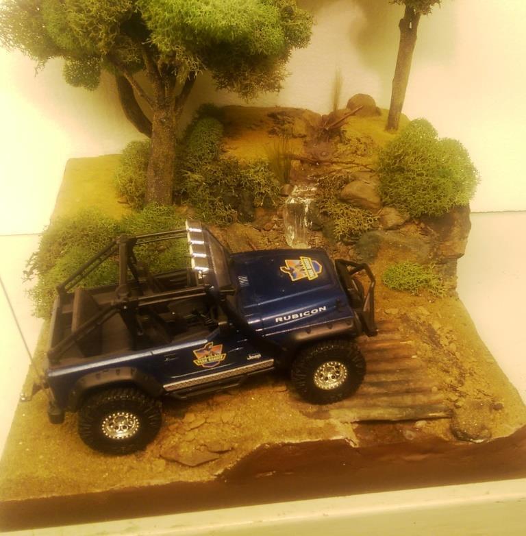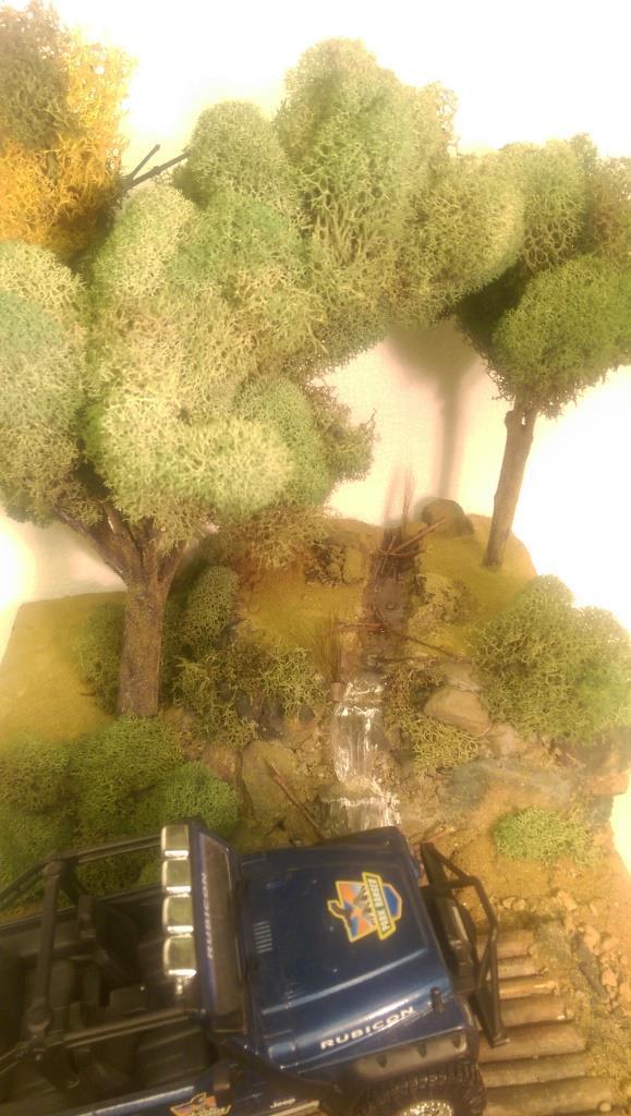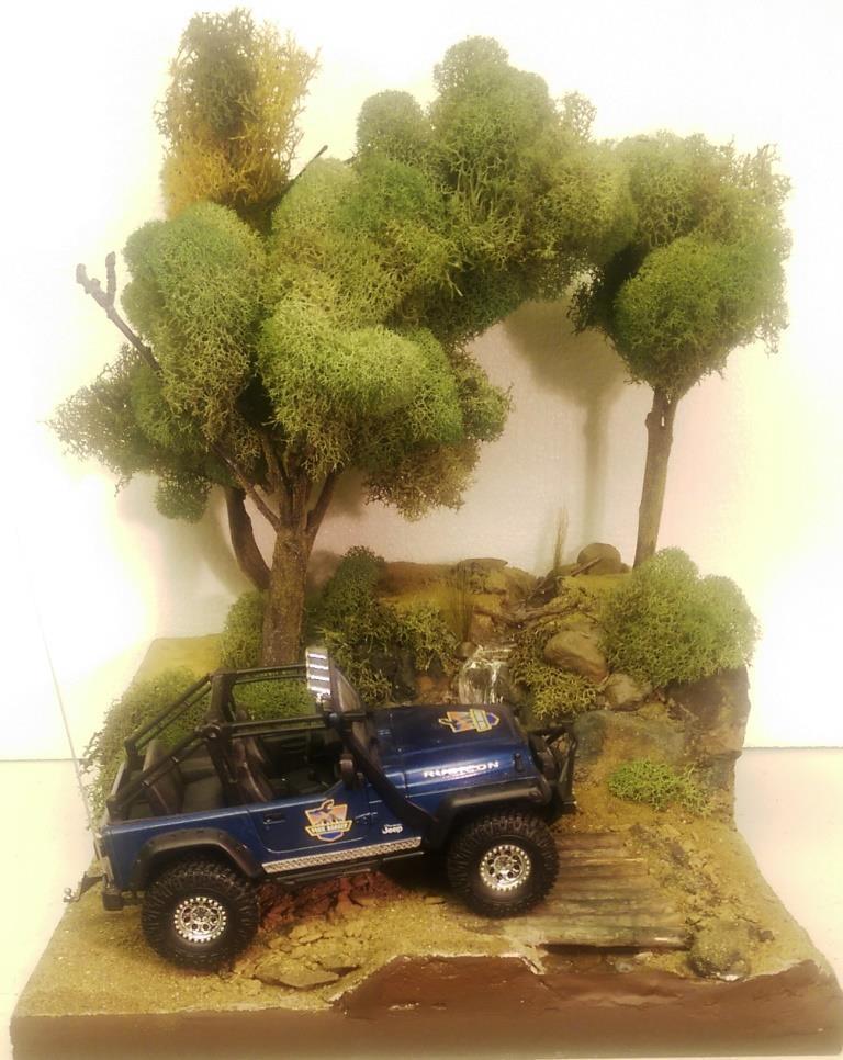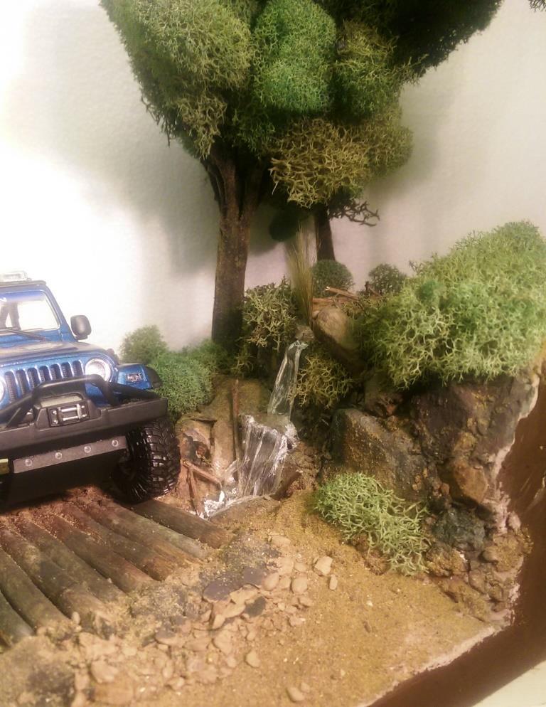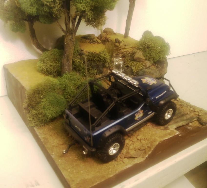 I was looking at the 1/25 Jeep Wrangler Rubicon that I put together sometime ago and had a great idea for a diorama. I started out with the idea of making a desert scene and have the jeep climbing a hill. However I got a little carried away and built it up too tall. So I decided to make a stream and waterfall instead. I started with a wood base, sealed it and glued 2 layers of that pink styrofoam on top of each other. I then covered the entire thing in tinted joint compound. Some rock gathering at a local park proved to work out well. I painted the rocks and dusted the entire thing with sand and blended turf for model railroading. The bridge is made out of similar sized maple branches I found in the back of my property. I used Scene A Rama Ripplin' Water Kit for the stream and waterfall. The three trees turned out the best. I used a thick wire I had, attached several tree branches found laying around the property to the wire using florist tape. Then I "painted" a couple of thin layers of joint compound on the trunks to blend them together. Once it was dry I painted the entire tree the same color, then added some variations in coloring with washes. I then took some stuff I got from my local craft store called Reindeer Moss and glued it to the branches. The final step in making the trees involved spraying them with diluted white glue the help hold them together and sprinkling some blended turf on the trunks to make then look like moss. The trees were then attached in holes with some foam-safe CA glue.