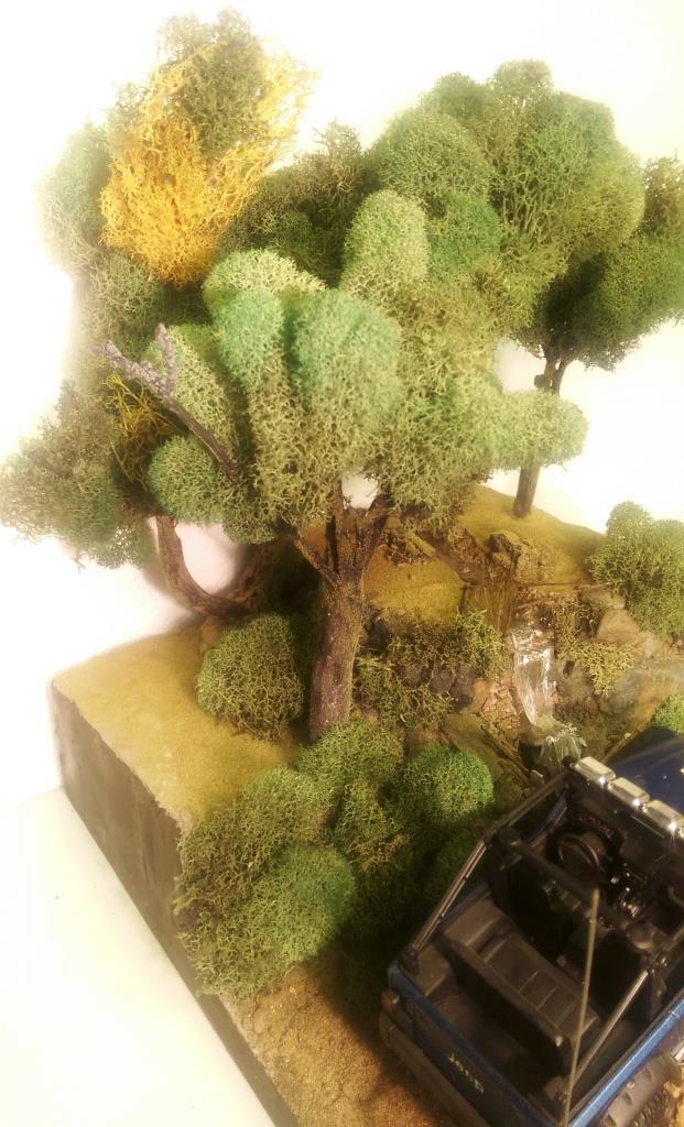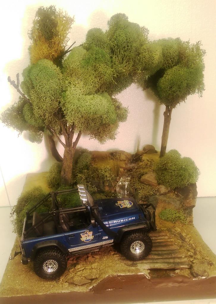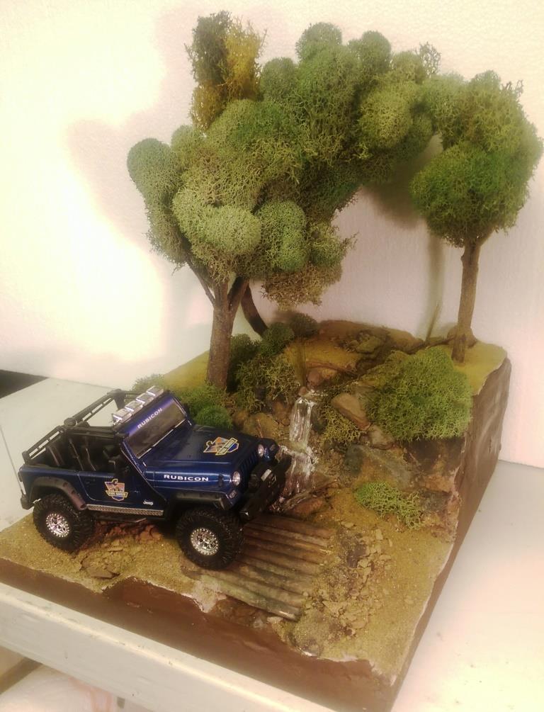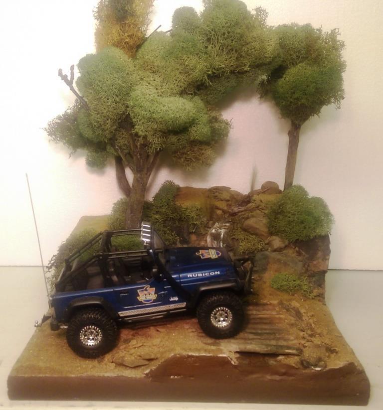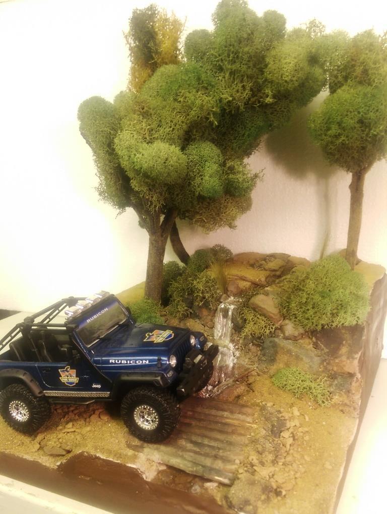 I was looking at the 1/25 Jeep Wrangler Rubicon that I put together sometime ago and had a great idea for a diorama. I started out with the idea of making a desert scene and have the jeep climbing a hill. However I got a little carried away and built it up too tall. So I decided to make a stream and waterfall instead. I started with a wood base, sealed it and glued 2 layers of that pink styrofoam on top of each other. I then covered the entire thing in tinted joint compound. Some rock gathering at a local park proved to work out well. I painted the rocks and dusted the entire thing with sand and blended turf for model railroading. The bridge is made out of similar sized maple branches I found in the back of my property. I used Scene A Rama Ripplin' Water Kit for the stream and waterfall. The three trees turned out the best. I used a thick wire I had, attached several tree branches found laying around the property to the wire using florist tape. Then I "painted" a couple of thin layers of joint compound on the trunks to blend them together. Once it was dry I painted the entire tree the same color, then added some variations in coloring with washes. I then took some stuff I got from my local craft store called Reindeer Moss and glued it to the branches. The final step in making the trees involved spraying them with diluted white glue the help hold them together and sprinkling some blended turf on the trunks to make then look like moss. The trees were then attached in holes with some foam-safe CA glue.