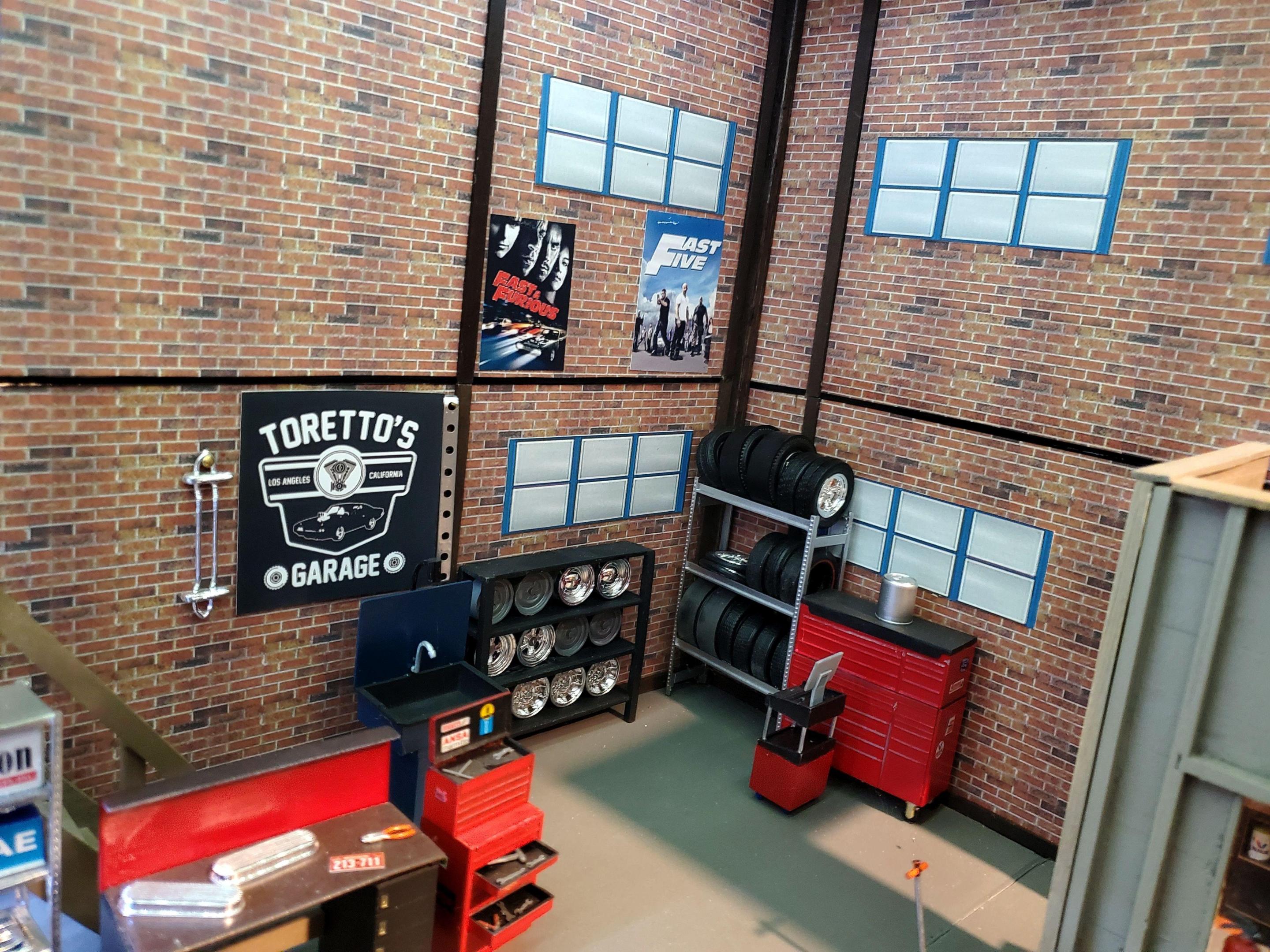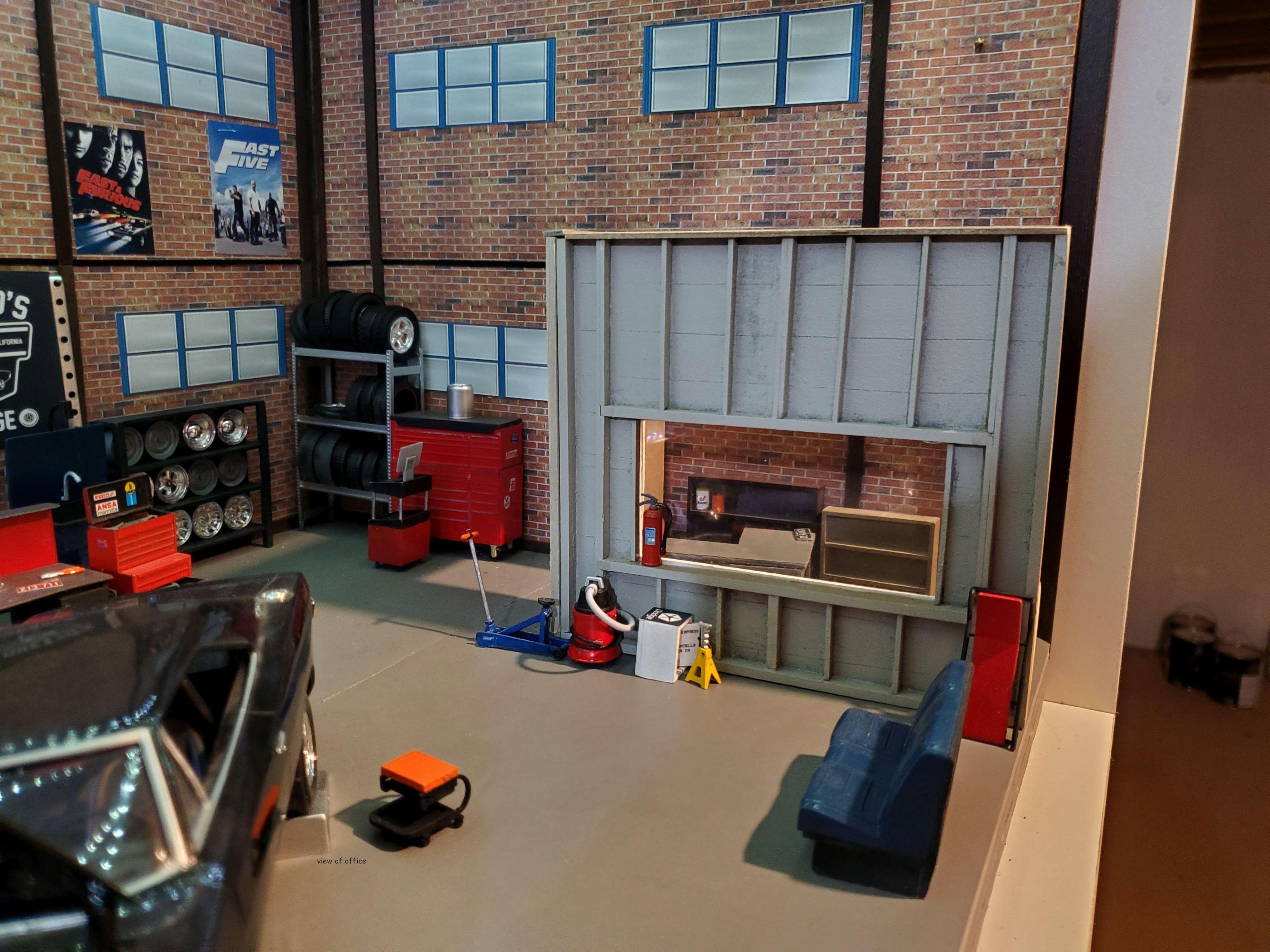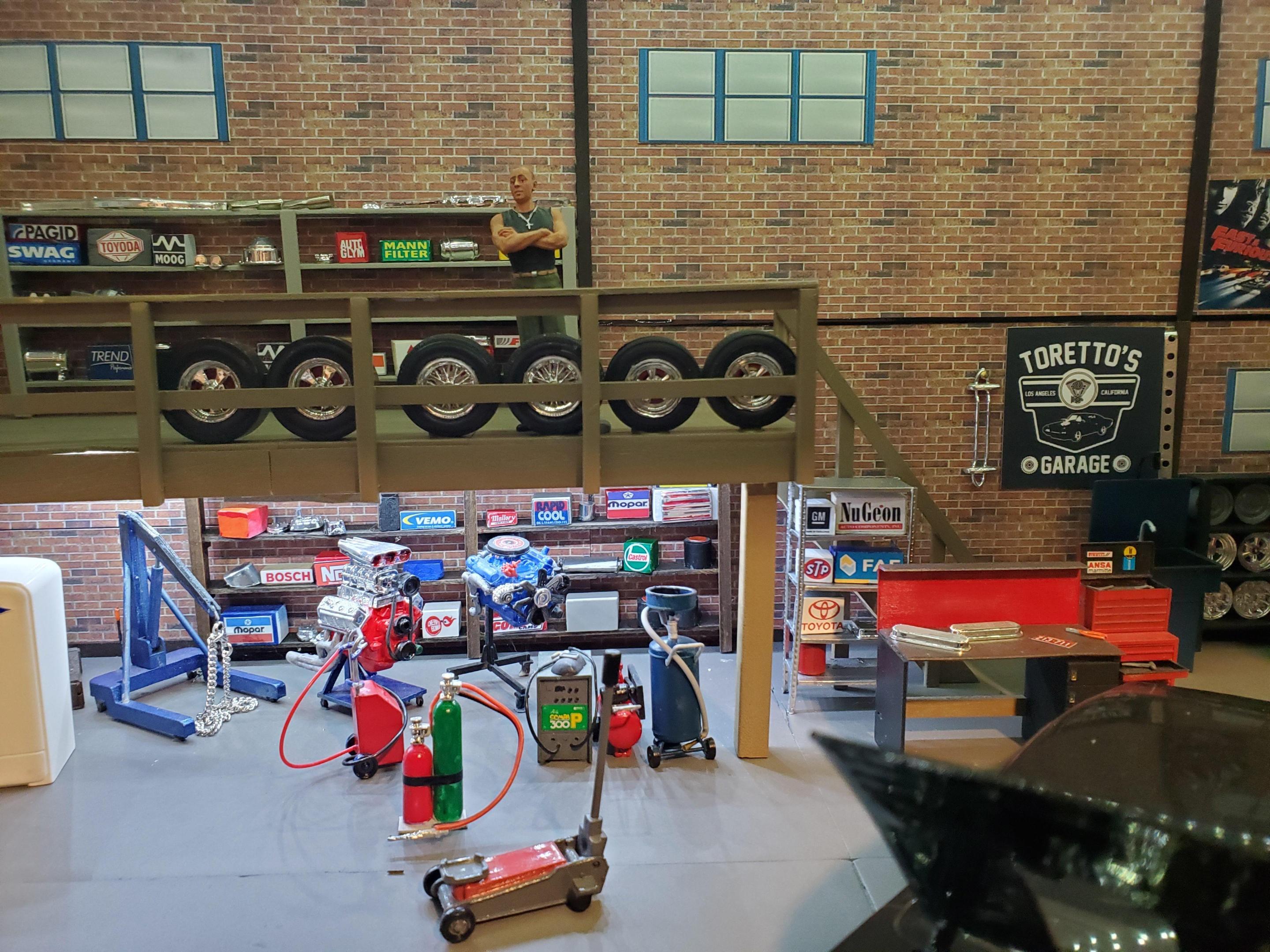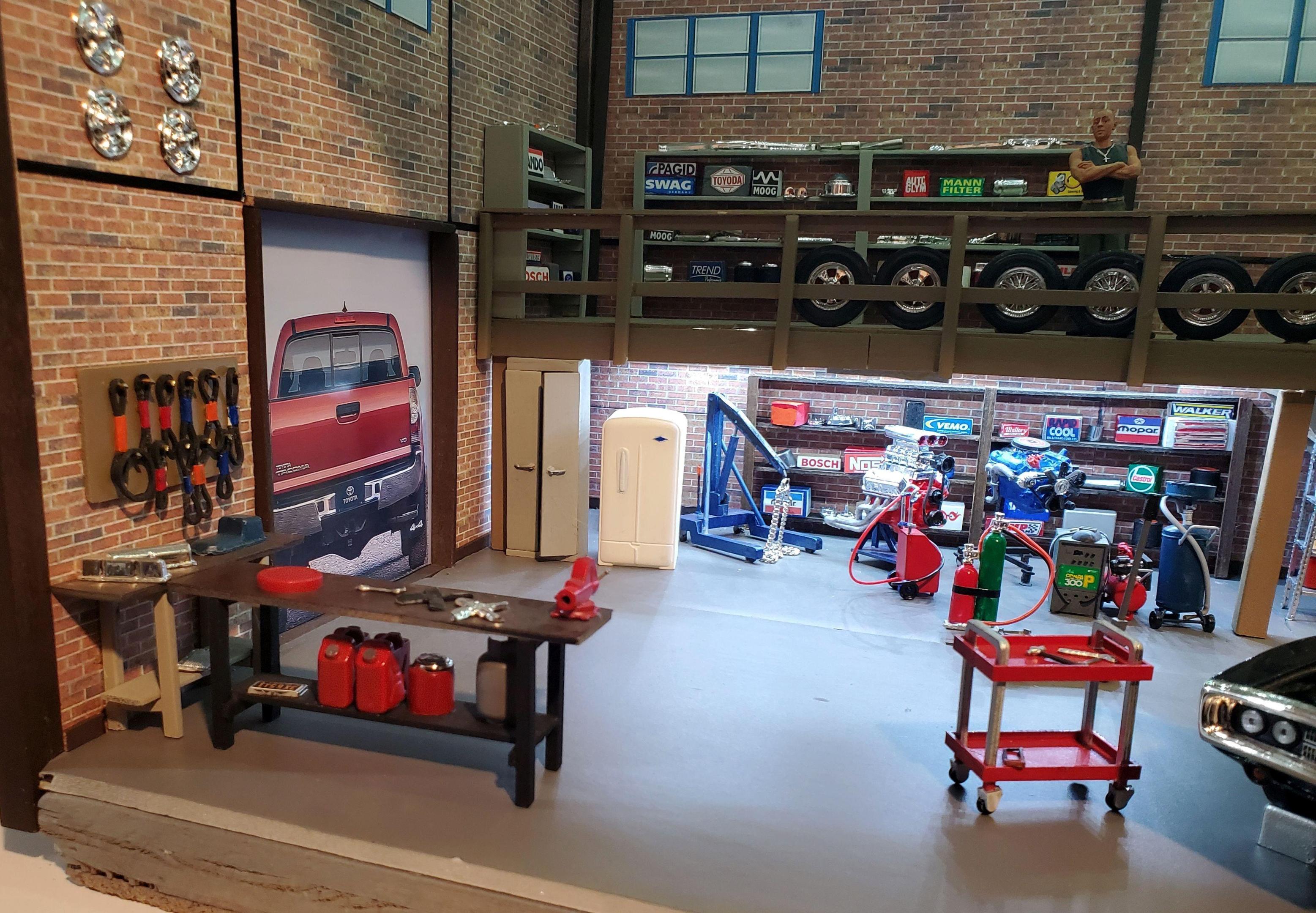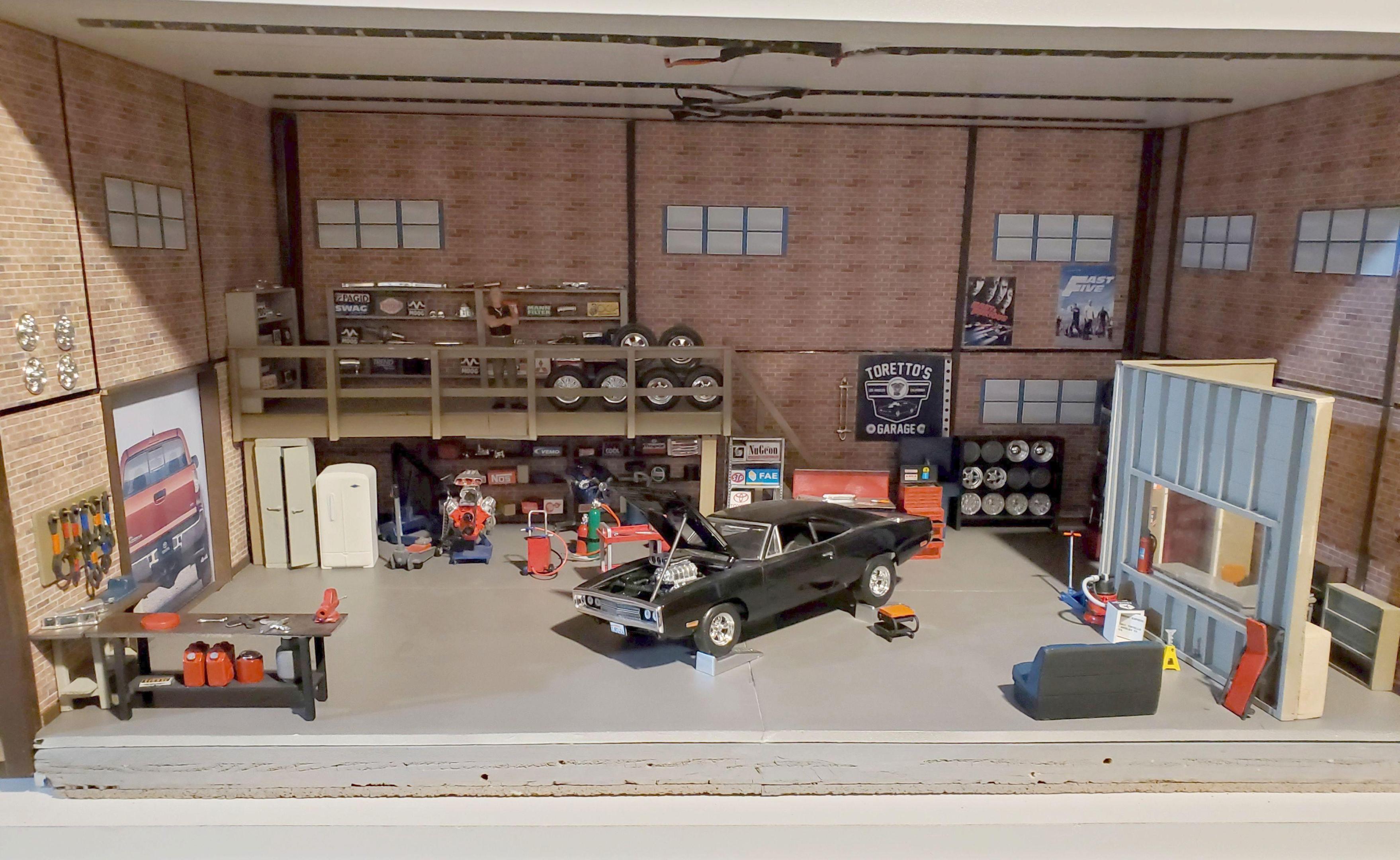 Because I enjoyed the movie so much, It was a natural for me to build a diorama based on it. Dom's garage was only shown in the first movie & was featured in 4 scenes, for a total of only 60-70 seconds. But I thought I could manage it, if I used common sense & my imagination to fill in what I could not see in the film. Right off the top, because I had a few big empty spaces in some basement shelving, I figured to make a large display. Measures 2' wide, 14" deep and 13" tall. Walls and base are foam board. Found the brick wall paper on line. Once the walls and ceiling were done, I started out with the stairs and loft. as that looked as the most difficult. I took my time . The stair treads, risers & railing are exactly as the stairs going to my basement in 1/24th scale. All of it is made of wood as is the shelves and walls of Dom's office. I used strips of small LED lights on the underside of the loft, just as I did on the ceiling. Some things were easy to put in the right place as per the film. The board on the wall holding the fan belts (tiny rubber bands) went to the left of the overhead door. along with a work bench. I've posted a screen grab from the film to illustrate that. On the right side of the opening, as was shown in the film, there is what appears to be a school locker & an old refrigerator (thanx ebay). Behind that stuff, & under the loft, was a bunch of equipment, including an engine hoist which was standing on it's end. I didn't repeat that error. The car is a die cast. I had bought a model charger, but only to use the blown Hemi & 383 Magnum engines, tires and wheels. Dom's office was briefly shown in the film. I guessed that it would be at the back of the shop. Sharp eyed viewers will note the sofa made out of the back seat of the donor charger. Dom and his girlfriend, Lettie, were shown in a short scene sharing an intimate moment on it. I stocked the shelves with boxes & crates made of small blocks of wood. The lights are nice & bright. I had to turn them off to take some of the pics. Taking advantage of that, on top of the shelves I've placed some chrome parts left over from various model builds & a couple small pieces of metal, to reflect the light, to sparkle , making it more interesting for viewers. At least a couple people have commented on it. Thanks for looking, it was a fun project. Questions & suggestions welcome.