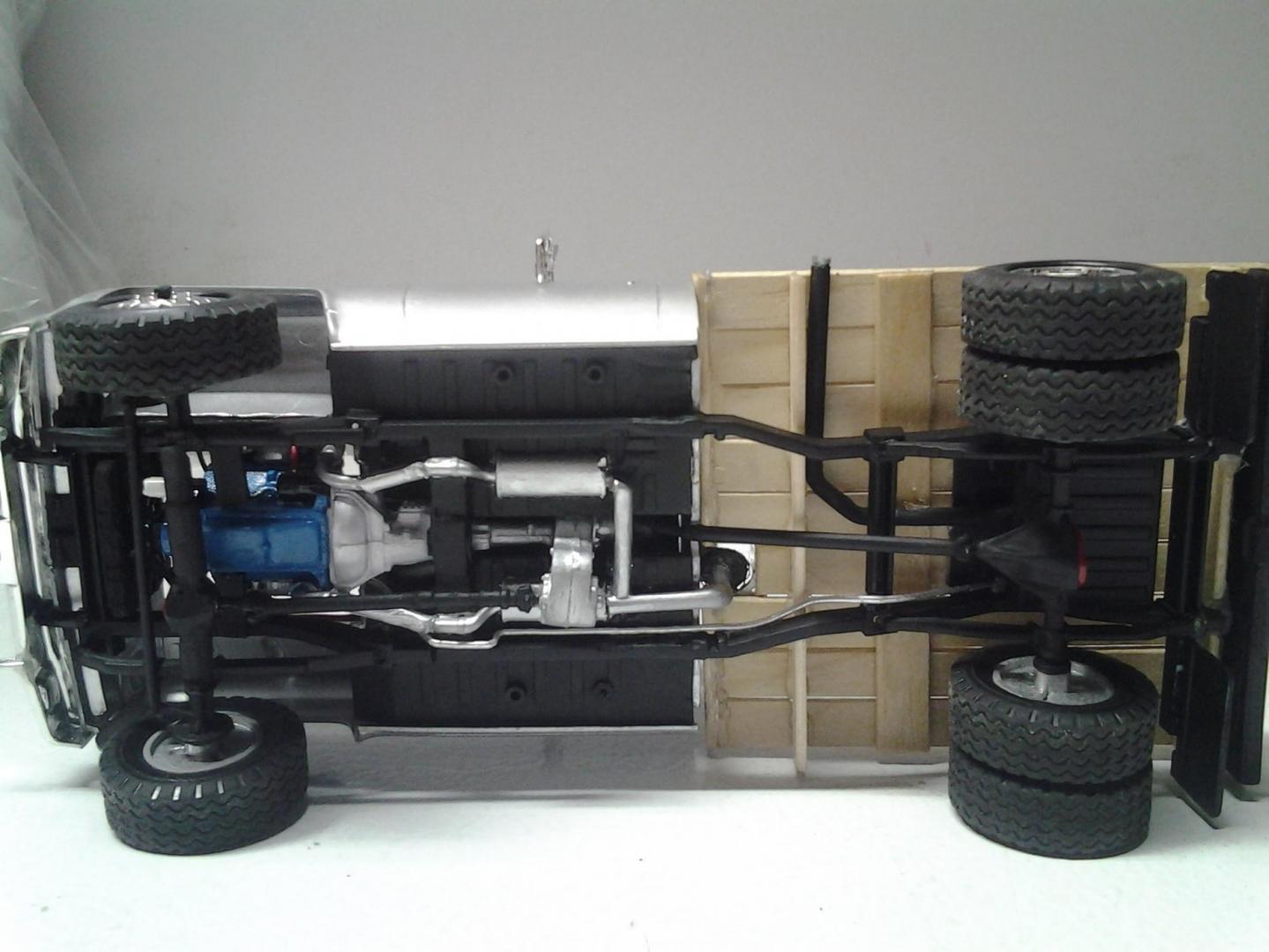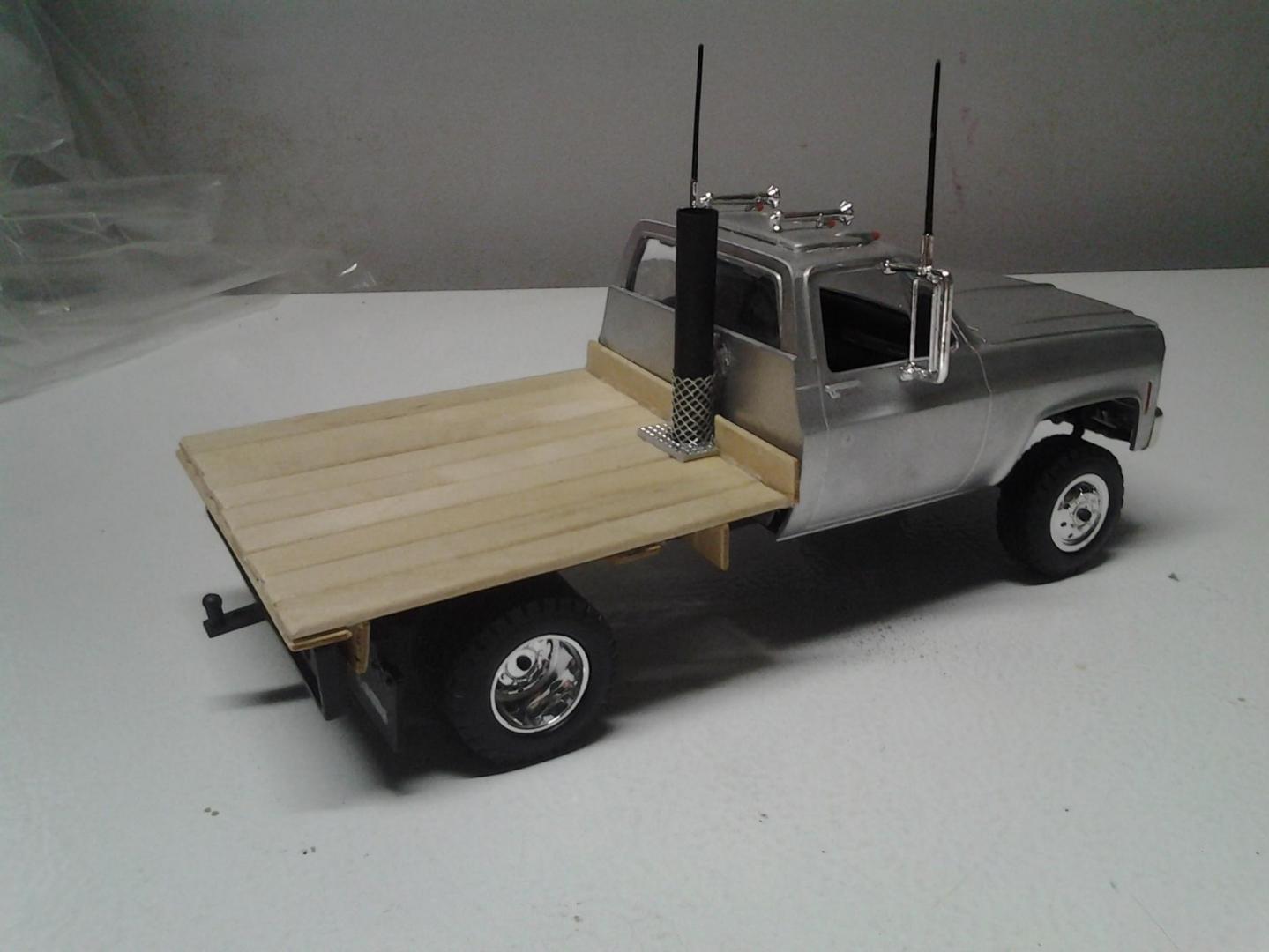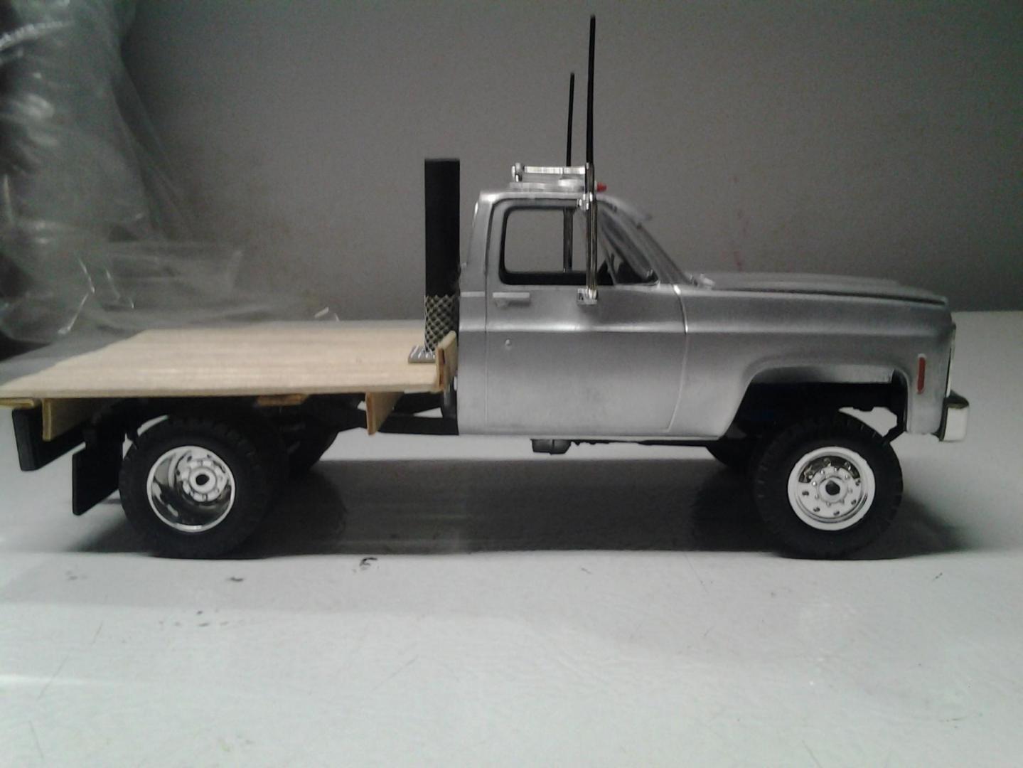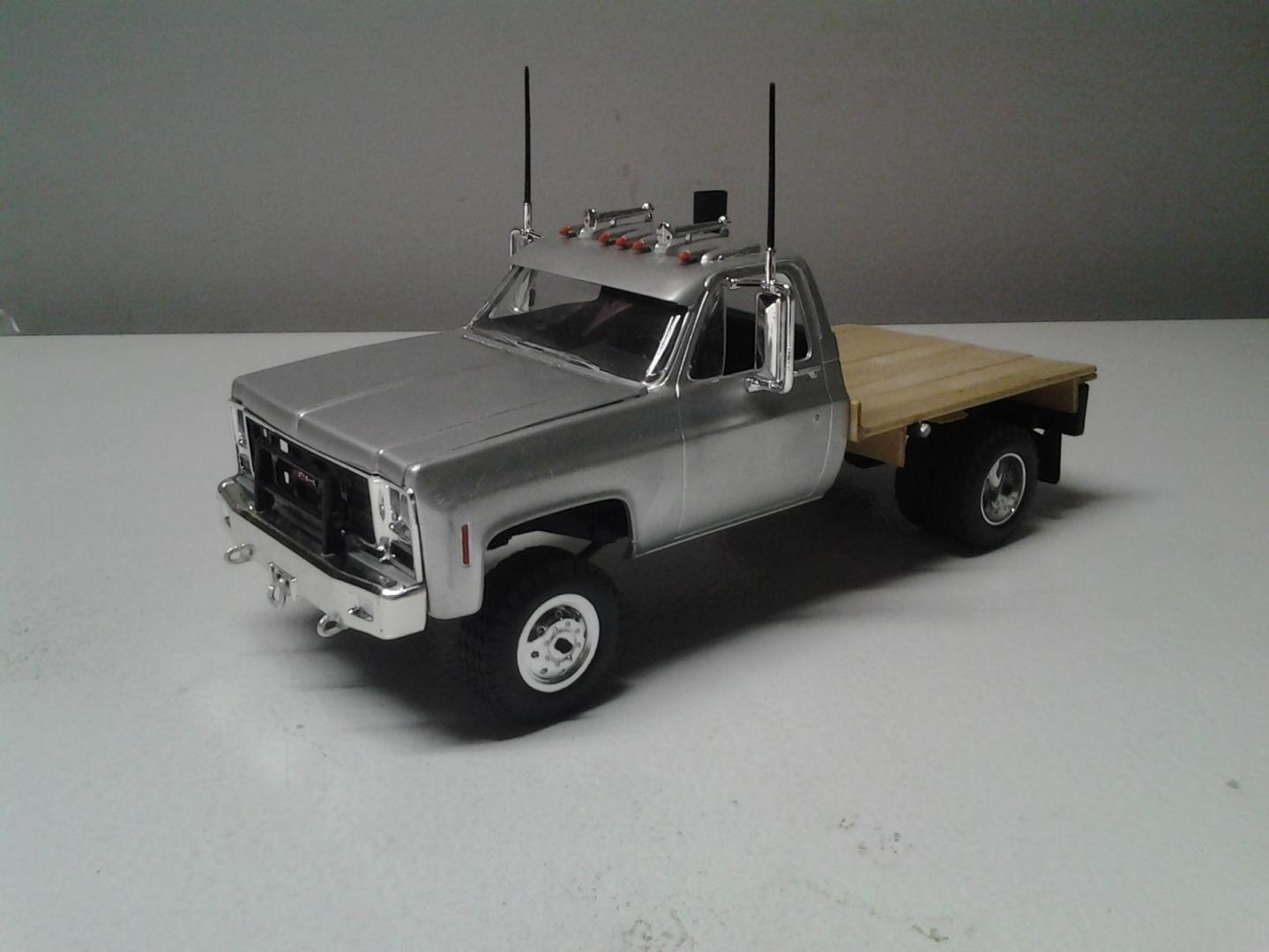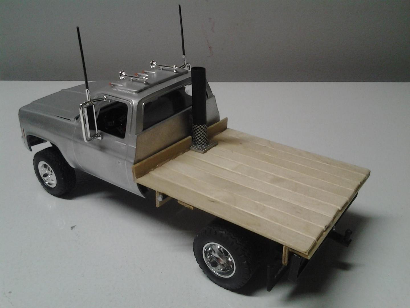 Been working on this one for a while now. It started off as the Revell 1977 GMC Wrecker, but that thing has a moulded-in engine and it's only RWD. This is why I converted it to 4x4. But I also wanted it to be a truck built for hauling parts and trailers. This is where the flatbed comes in. As for the moulded-in engine, I replaced by the Revell 1968 Charger's 440 big block. Here it is!