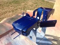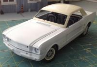 I found this 1966 Mustang at a garage sale. It was made by Mira. A low end model car brand. It looked not so great in red, and the rear wheel was broken. The rear wheels do not have an axle, but the wheels are snapped onto a plastic pin. This pin was broken, and the previous owner had glued the wheel back on, but not exactly in place. The car was now wobbly and the rear wheels did not spin. I stripped the paint, used the spare wheel in the trunk to fix the broken wheel, drilled a slot for a real axle and painted it blue with a white top. All wheels are rolling again. I'm still working on it, but I'm having so much fun with it.