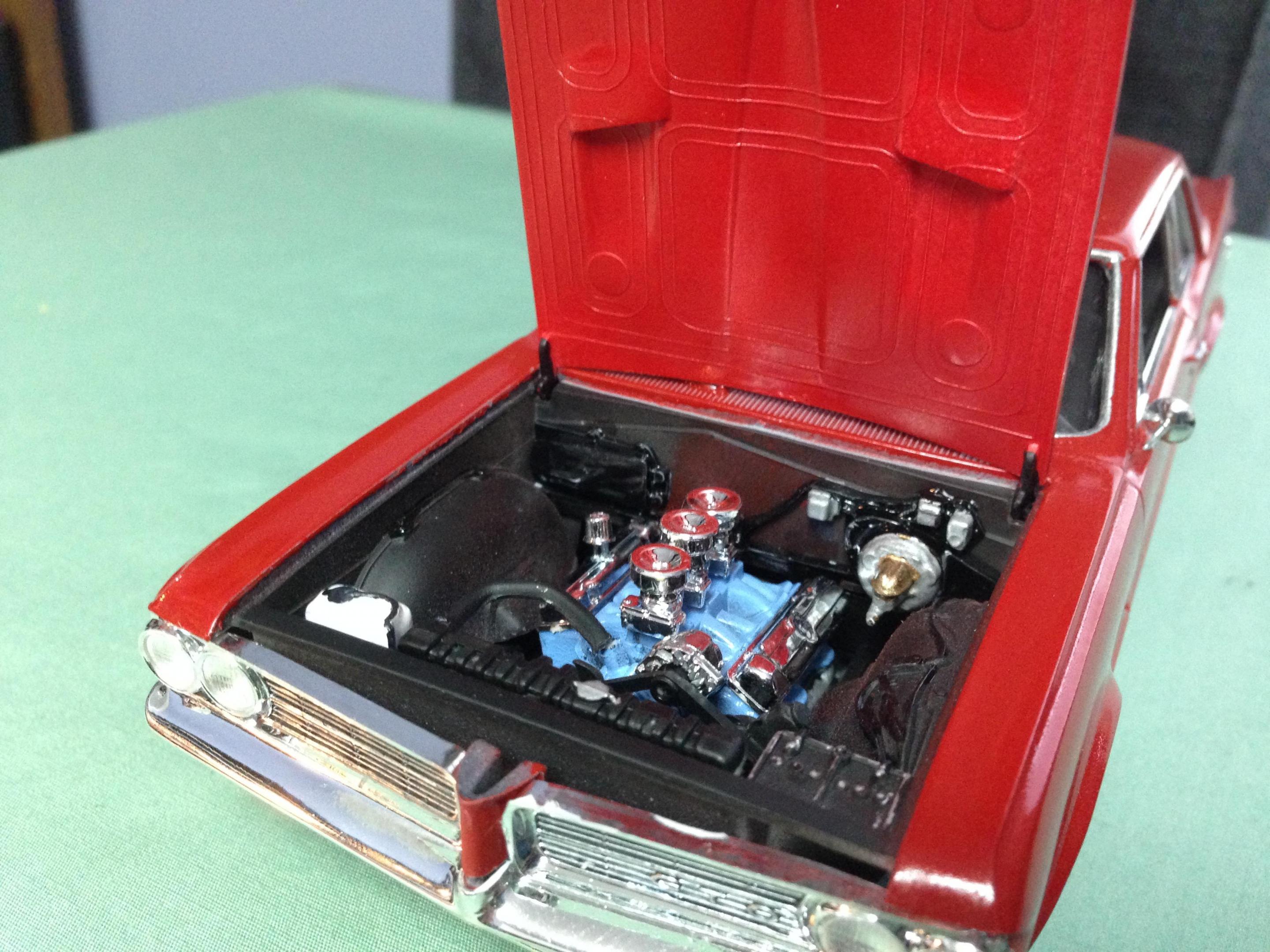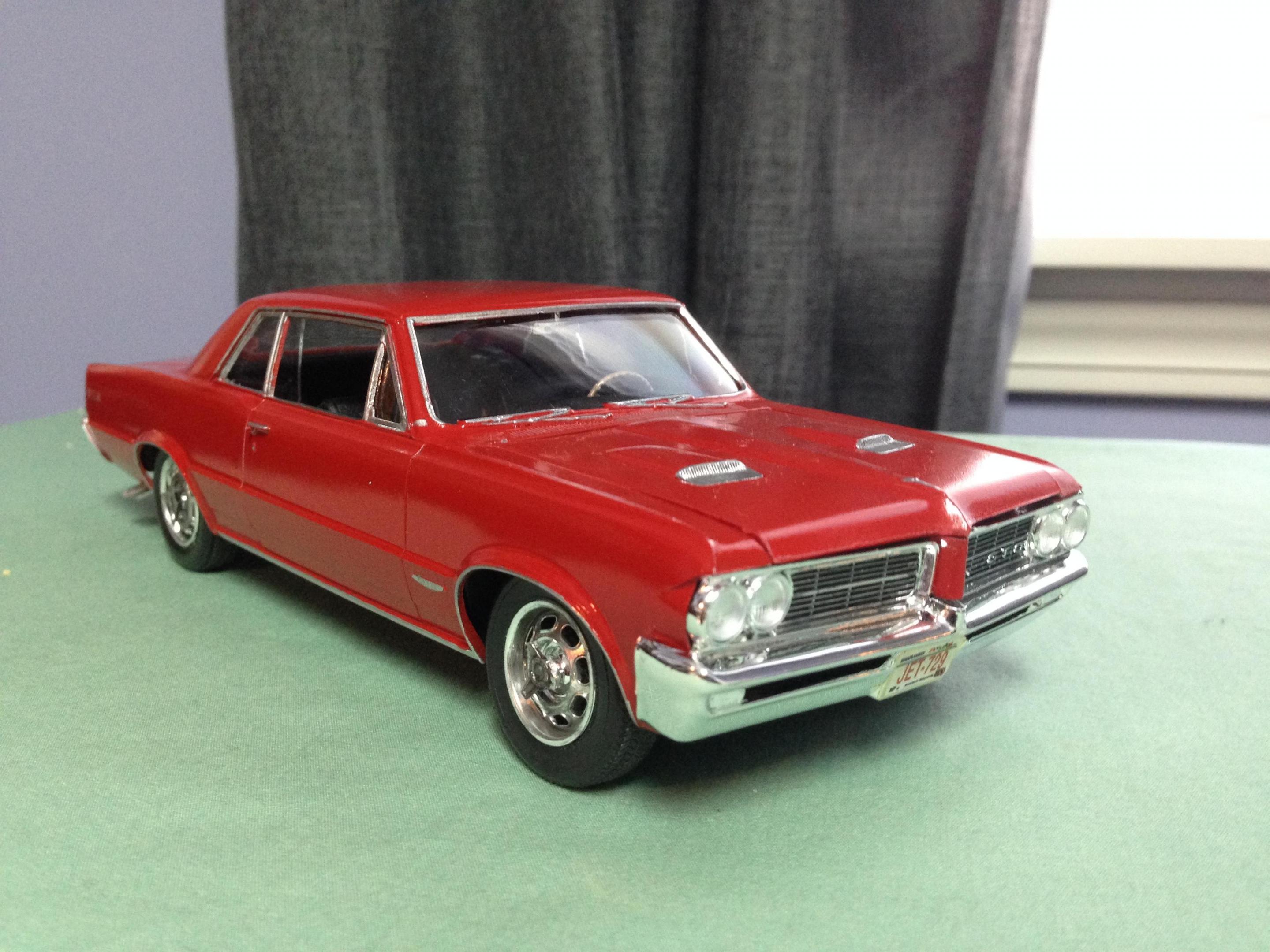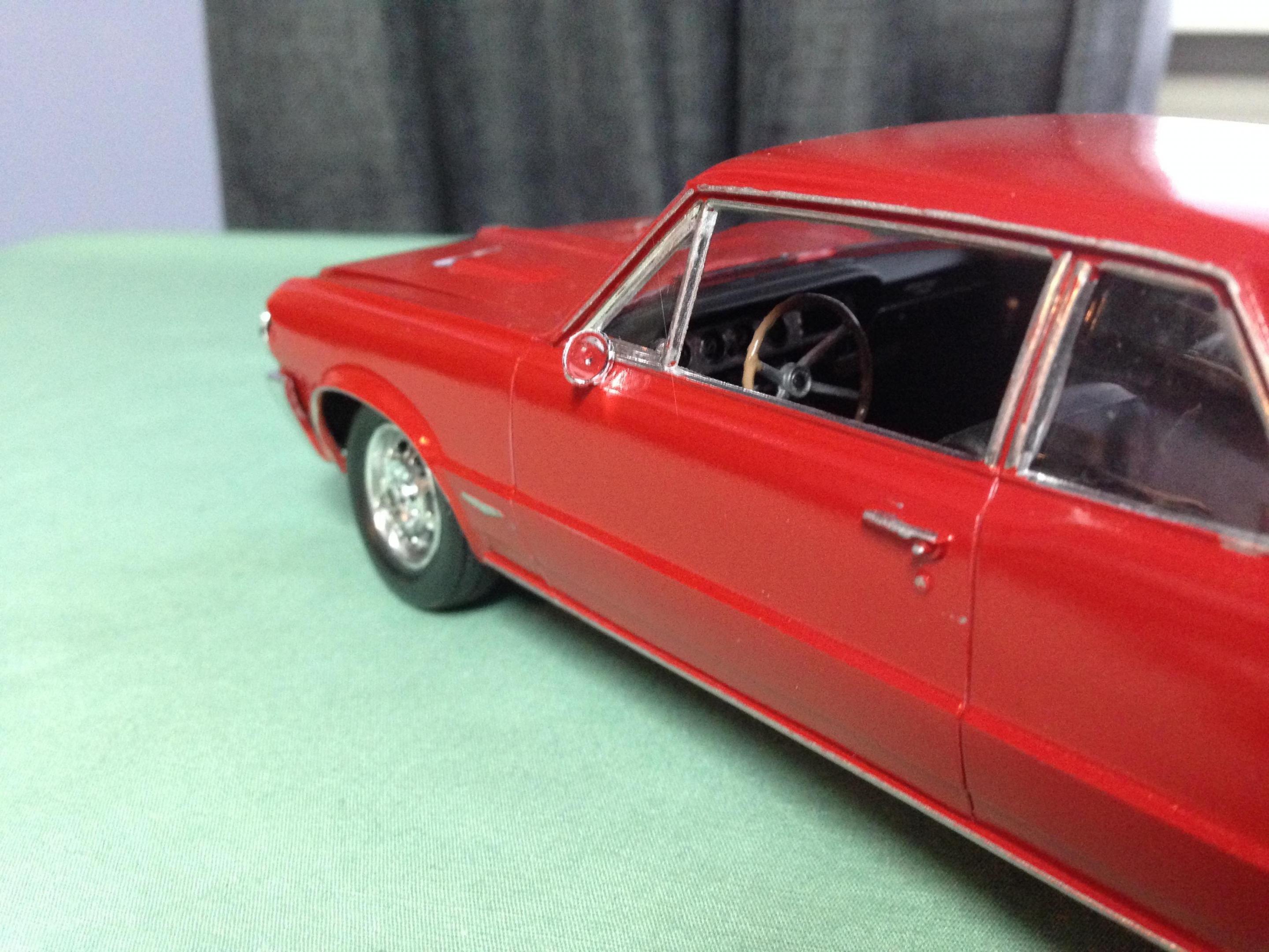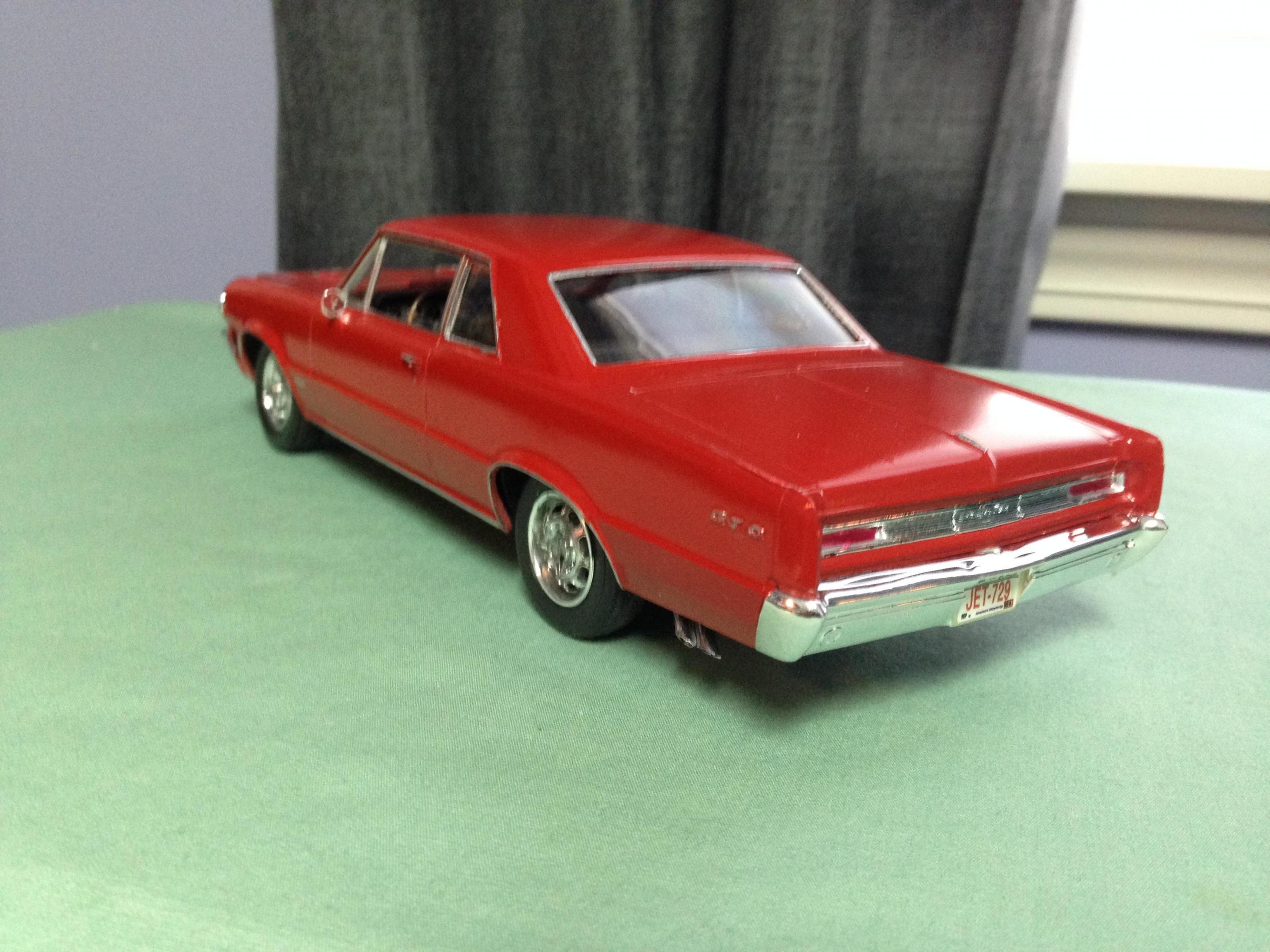 Happy Spring all,,its warming up here in motor City,,getting ready for the Autorama at cobo hall,,one of the best car shows in the nation,,along with the Woodward cruise in August. I just finished the MPC 67 ' GTO,,it turned out ok,,,warning about the front grill set. It dosent fit right. lol. not sure if its just the production lot I got my kit from Hobby lobby or what,,but man ,,had to file ..sand ect to get it this close. And as always I chopped,,cut,,modified quite a bit of it. I put some real tires on the back,,added some headrest to the seats,,added some side dump header pipes,,opened up the rear wheel wells to fit back tires,,installed a 409 mtr from the x-tras bx,,and 671 blower. Installed a replacement rear end from the x-tras bx. Rattle can sprayed red from the hardware store paint. hand painted everything else. Overall its a cool kit,,but it will test your fabrication+ modification skills. maybe if I had just left it stock it would have been easy,,but I hardly ever do that often. Build on!