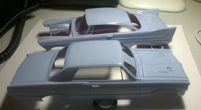 I always seem to putter away with two projects at once. In this shot, I've started in earnest on the infamous snap-GTO kit and the AMT Christine model, which I'm trying to turn into a plain '58 Belvedere. I used the same color paint for both, but as you can see the molded red of the AMT kit changed things just a bit. I'll try to post updates as I get time, but here's links to my reference (1:1) shots: GTO: https://www.pinterest.com/pin/358036239100312140/ Belvedere: http://www.classycars.org/Plymouth.1958.Belvedere.661.html