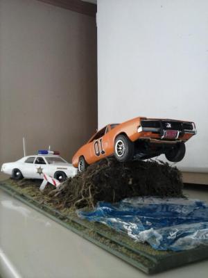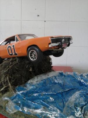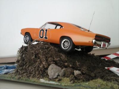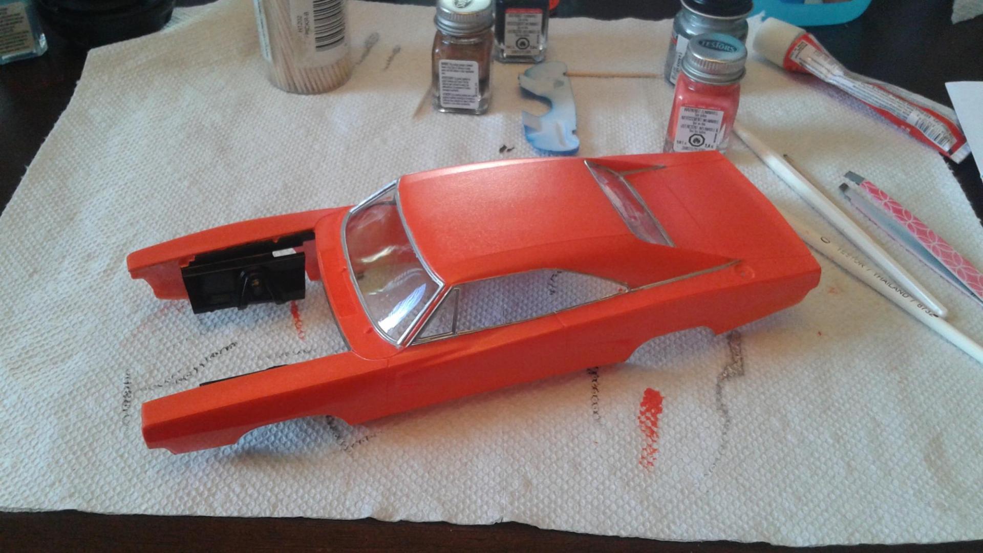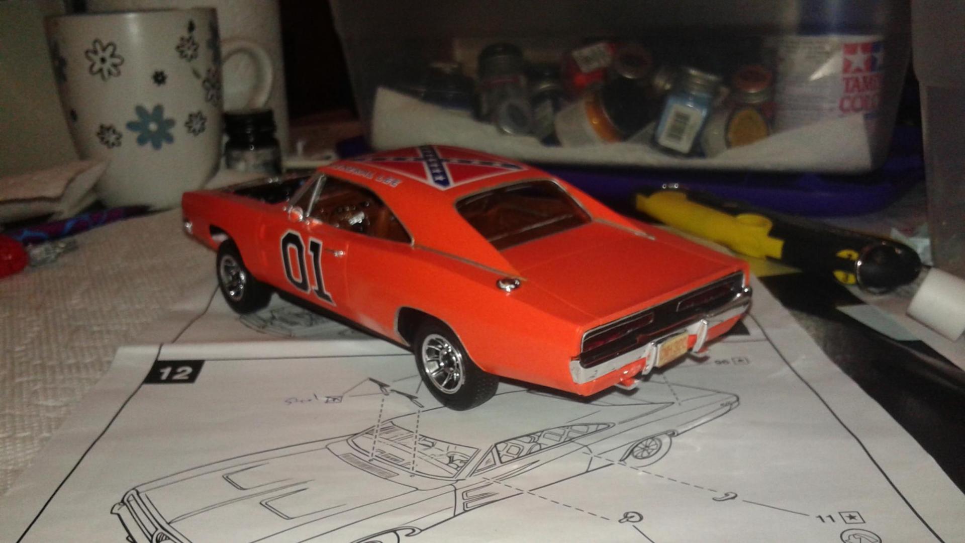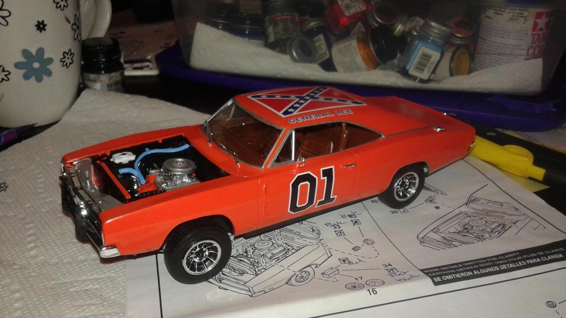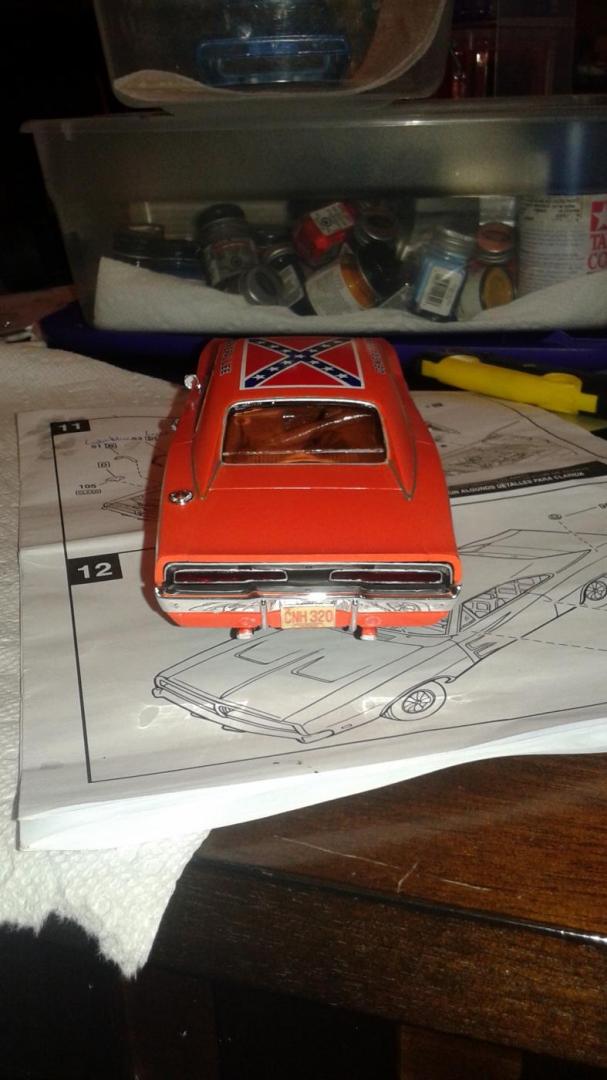 Hi everyone. I've just completed my newest build this year. I used an old General Lee kit that I had been given a long time ago. I never thought I would build this but I have to say I had a lot of fun. I can't tell you what year it is but I know that the back window is not like the regular General Lee's that I have seen. Also, I modified the car as I am going against my best friends in a build off! Things that went well include: Paint came out pretty good, my best yet I created the vinyl top using the masking tape (blue tape) method Staggered wheels overall color scheme Well, here it goes.