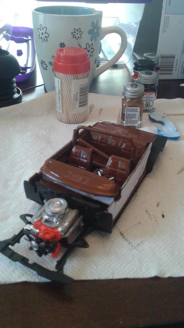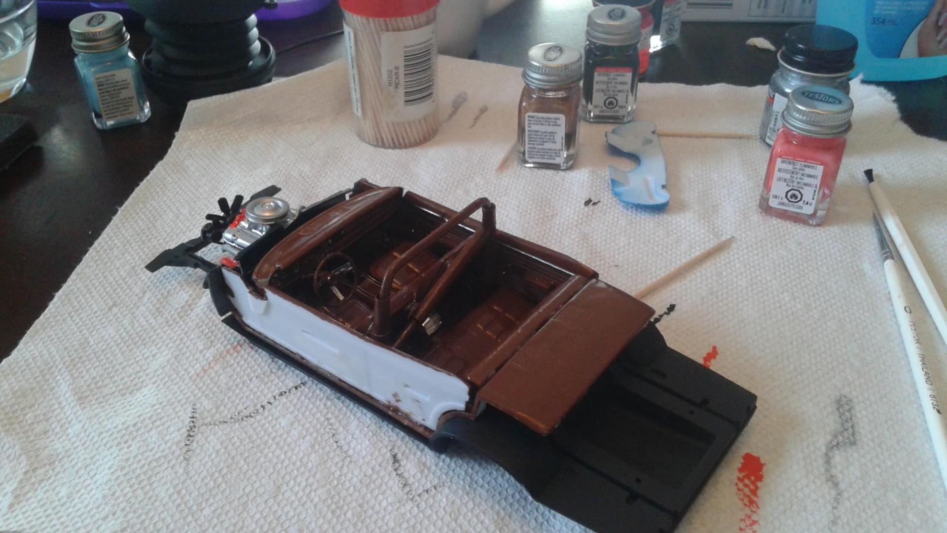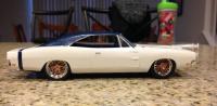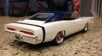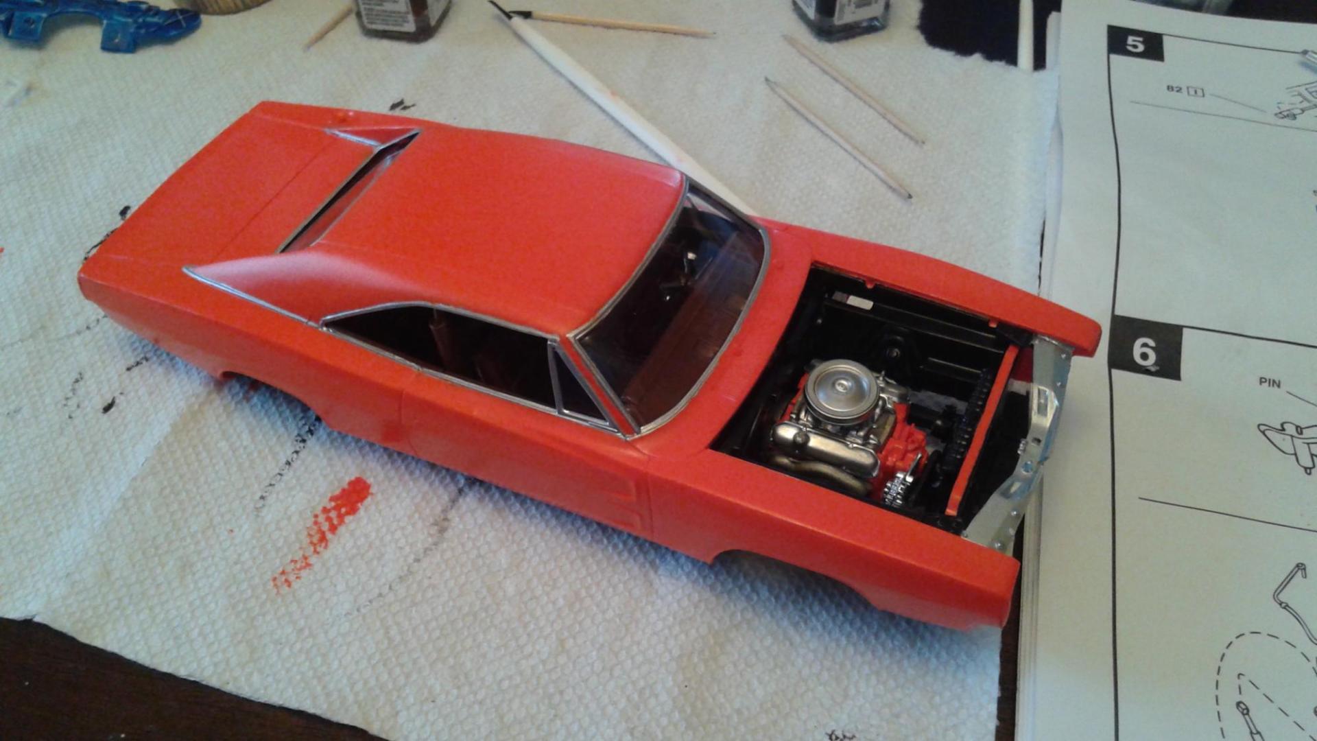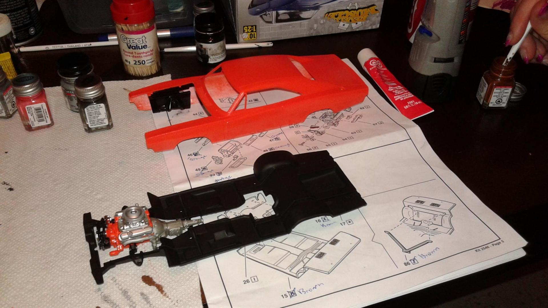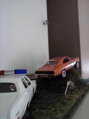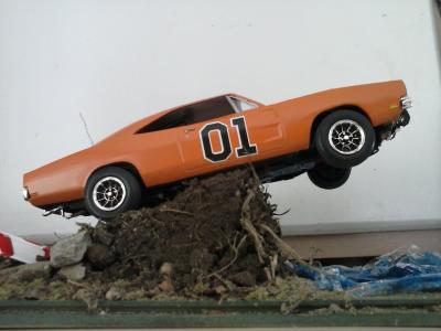 Hi everyone. I've just completed my newest build this year. I used an old General Lee kit that I had been given a long time ago. I never thought I would build this but I have to say I had a lot of fun. I can't tell you what year it is but I know that the back window is not like the regular General Lee's that I have seen. Also, I modified the car as I am going against my best friends in a build off! Things that went well include: Paint came out pretty good, my best yet I created the vinyl top using the masking tape (blue tape) method Staggered wheels overall color scheme Well, here it goes.