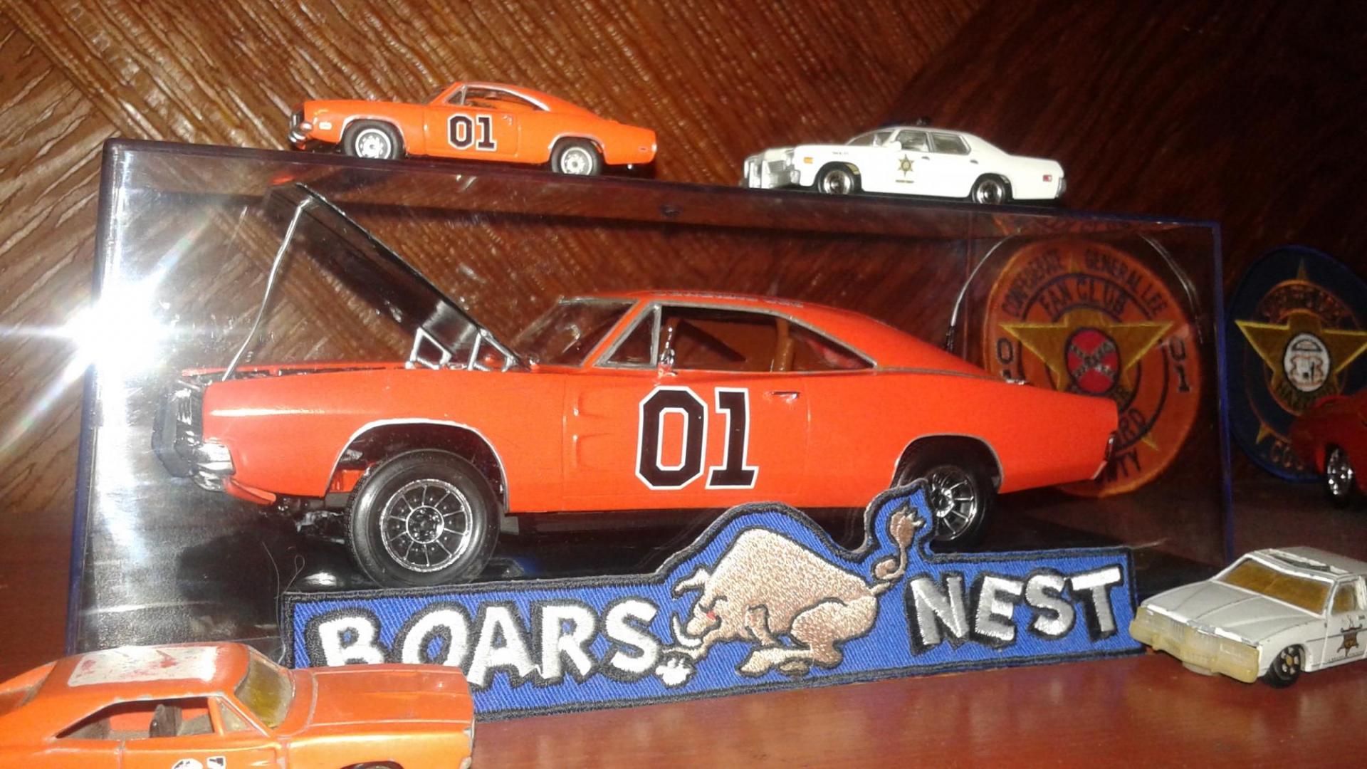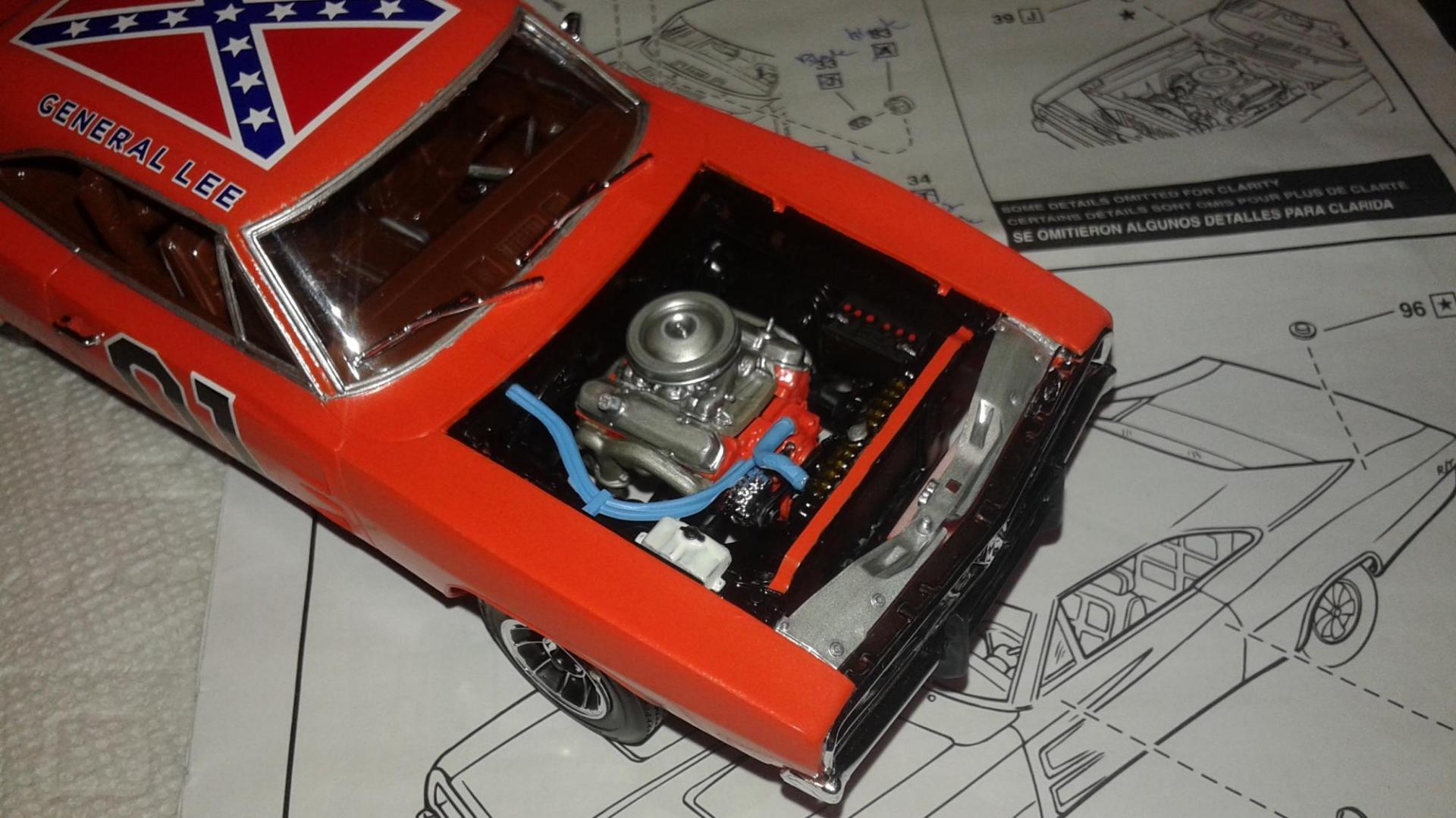 Hey guys just wanted to show off my model of the Dukes series close up car. I'm a huge Dukes fan so for those who don't know about this car here's some breif history. This General Lee has been traced as far back as the 2nd Season. During the TV series this car was titled "WGL 02". It was a close up car and would have only been used with the actors in the scene and not a stunt car. Nine out of ten times, if the hood was open, this was the car was used for the shot. This car had a black engine bay, smoothed and boxed firewall, chrome hood hinges, chrome upper grille/latch tray, and the engine was dressed up with chrome. Always loved the way this car looked under the hood. Went for the season 3 version specifically. If I ever own a G.L this is how it will look in the engine bay.