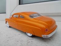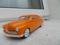 Finally, I have completed the 1954 Hudson Hornet custom coupe.........to recap the build : 1. I sectioned out about 6 scale inches from the sides, back and front of the car. 2. I chopped about 6 scale inches from the top by cutting a couple of wedges from the upper front and lower back of the A pillar, 6 inches from the B pillar and a 6 inch die-angled cut in the rear pillar, so that the top was "slid back and down" to the new lowered position and then secured with glue. The B pillar has a new top section filled in where the old pillar was moved to. I added a new chrome trim accent strip to the sides in a flowing pattern from the front, just back from the headlight, down to the rear fender back by the rear bumper. 3. The rear fender top line was raised 1 scale inch from the end of the rear quarter panel window to the new tail light fixture to give the fender line a very small fin as a fore-runner of the larger fins to come in the end of the 1950 ear with a sharp "C" look to it. The tail lights are a mix of epoxy and clear red paint dropped into the opening after the opening was painted reflective silver. 4 on the rear deck, I formed a faux- continental kit look into the rear deck to give the rear deck a little height because the nose tends to be a little high on this car. 5. the hood was smoothed out by removing the large flat area that was molded on the real car. 6. The headlights were frenched and filled with liquid mask so that the chrome finish was protected from the painting. 7. a black mesh inner grill was installed to the grill opening which was covered with a "Toothy" grill from my parts box. 8. I replaced the 6 banger stock engine with a Revell chrome Cadillac V8 with 6, 2 barrel carbs. 9. the engine bay firewall and inner fenders were smoothed and covered with bare metal foil, as was the inside top of the hood. 10. The hood was hinged on the left side to open sideways, just to be different. 11. The stock wheels and rear view mirrors were used. 12. Chrome "lake" pipes lifted from the Revell 1949 Mercury kit seemed to fit this car perfectly, so they were added. 13. The stock front and rear bumpers were installed 14. And finally the paint. The car was primed, sanded and re-primed. I mixed up a dark gold paint from Tamiya bottled paint which was sprayed on the hood, top and sides of the front fenders and doors. Once dry, I installed some custom flame masks that my brother designed on the computer and cut out of vinyl ( he is a custom sign maker) ....these were old masked that I used on a Plymouth street rod from about 8 years ago and were just rolled up on a shelf. I installed the masks on the hood and side fenders ( not an easy task I might add). Then the entire car was sprayed light gold. As the paint dried I removed the masks. Once dry, I lightly sanded the area to remove the ridge caused by the paint mask and the thickness of the paint. Once smooth I touched up a few spots and then painted the nose and front side fenders with Tamiya clear red. When just about dry, I painted the entire car Tamiya clear orange, I wanted to give the front end, which has the ghost flames a darker, more red glow, that is why the red is under the orange. Lastly, as the orange as about dry, I mixed a few small scoops of extremely fine gold metalflake into the clear orange so to give the candy blood red/orange a metal sparkle. In the sun, it really poops. And finally, when dry, the car was clear coated with 3 layers of clear, and once dry, it was waxed out and buffed 15. Once the body was dry, the Bare Metal Foil was applied to the side strip and the window trim. 16. OOPS, I forgot, the interior is made up mostly from the door panels, console and seats from an Infiniti G35 coupe with a modified Plymouth dashboard and the steering wheel from the Hornet kit. Thanks it, I hope you like it......I know I am very happy with the result.......I think the original car is chunky and too tall....I think the section and chop bring the car into the proper proportion, and the lowered stance make this into a great 50's lead sled. Here are the finished pictures. Thanks for looking...............