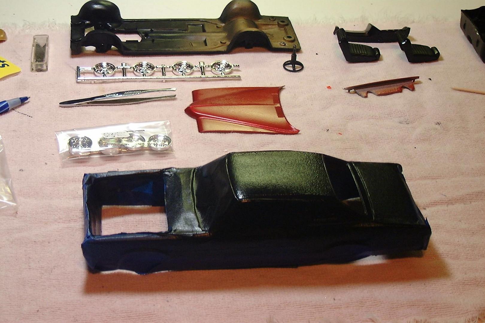 This model was built to loosely resemble a black over red 70 Grand Prix I owned for a number of years in the late 90's. It started out as a built-up glue bomb purchased on ebay. It was brush painted blue and looked pretty bad at first. After a dip in the "purple lake" I surveyed what was salvageable. The body, bumpers and interior were fair but the engine was a blob. Fortunately, I had a Revell Parts-Pack Pontiac 421. I soaked it in Westly's to dechrome it and sourced the stock air cleaner and other items from the parts bin. I actually made my own wired distributor from supplies picked up at Radio Shack and Hobbytown USA. I used a technique I learned on Drastics about BMFing emblems BEFORE painting and then scraping off the paint on the raised areas to expose the letters. It actually worked quite well. Especially since the "Grand Prix" emblems are separate block letters. It did a fair job on the front fender louvers as well. The interior is pretty basic, with just some minor detailing. The underside being an old MPC offering with chassis screws, is nothing to write home about. I did do my signature red mufflers (a throw back to the Cherry Bomb glass pack days). The engine compartment is anatomically all wrong compared to a real GP. Especially in the fan shroud/radiator areas. I did not have the parts to correct it though, so it is what it is. The mags are Modelhaus Keystone Klassics which have been painstakingly detailed. I performed my signature rear tire widening technique to fill in the rear wheel wells. The tires have been lettered with a "Gelly Roll" pen from a local stationary store. The windows were boogered up but, using progressively finer grit polishing cloths, finished off with a coat of Future, they look as good as new. Sharpie markers applied here and there round out the small details. I am pretty pleased at how my first restoration turned out.