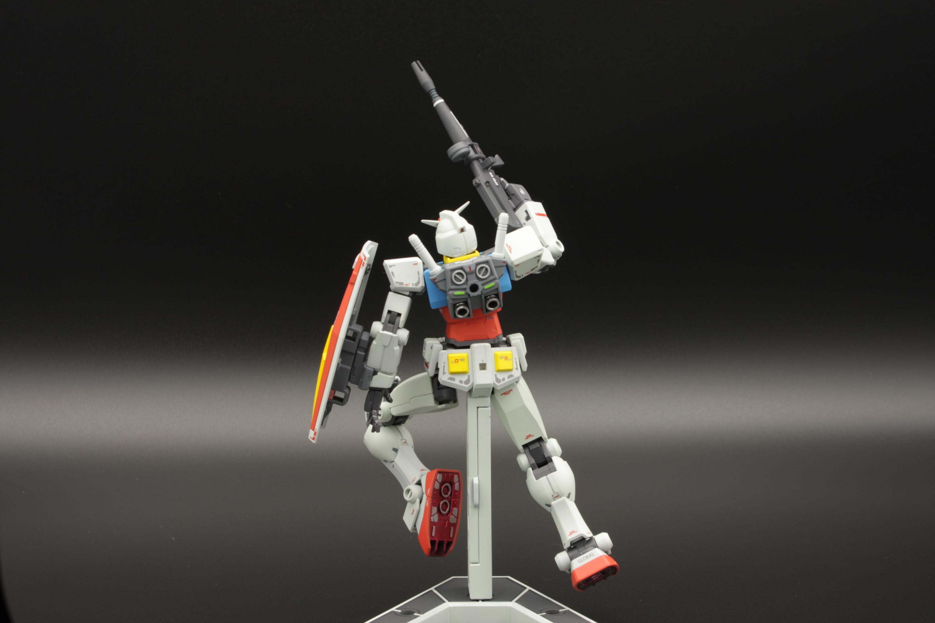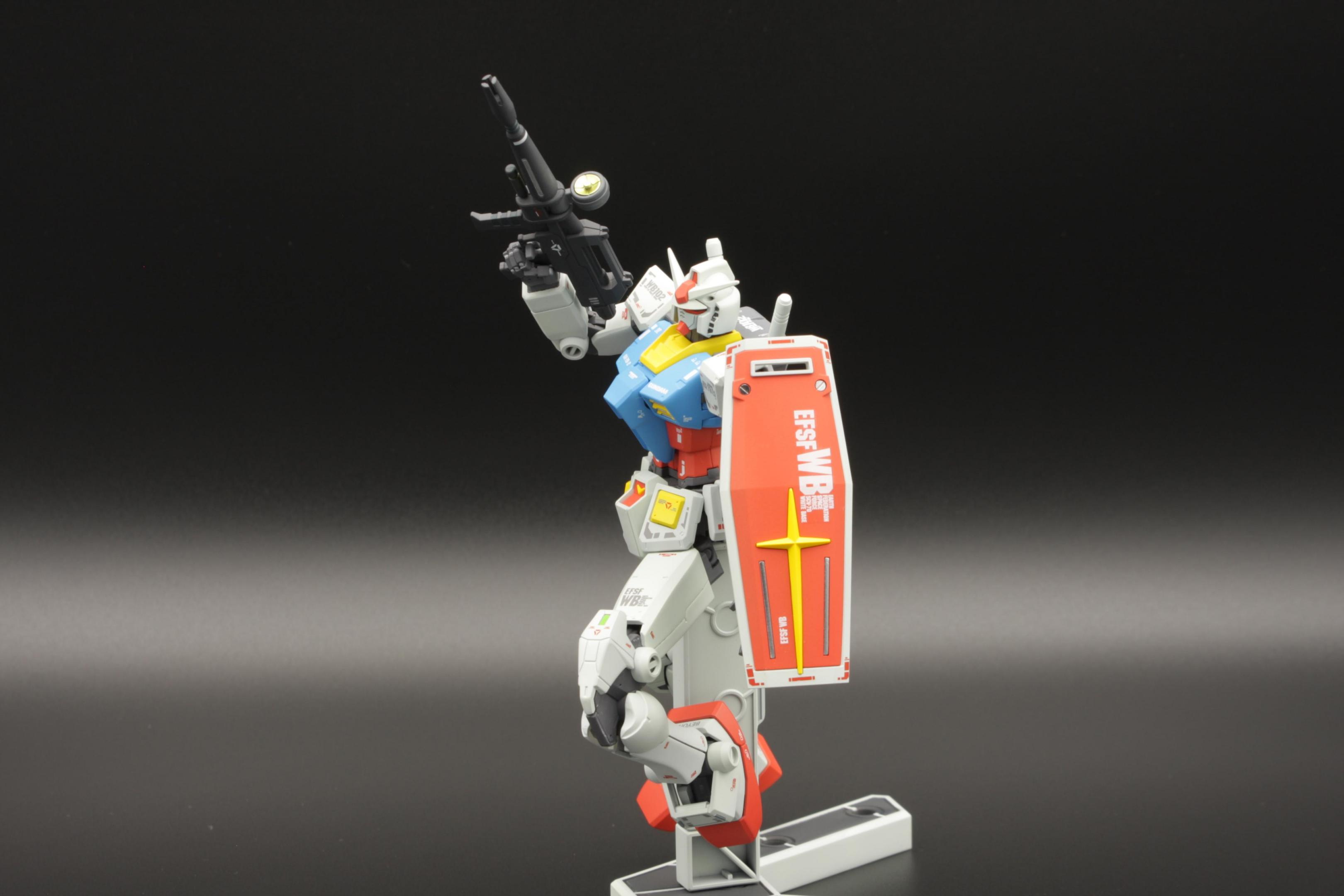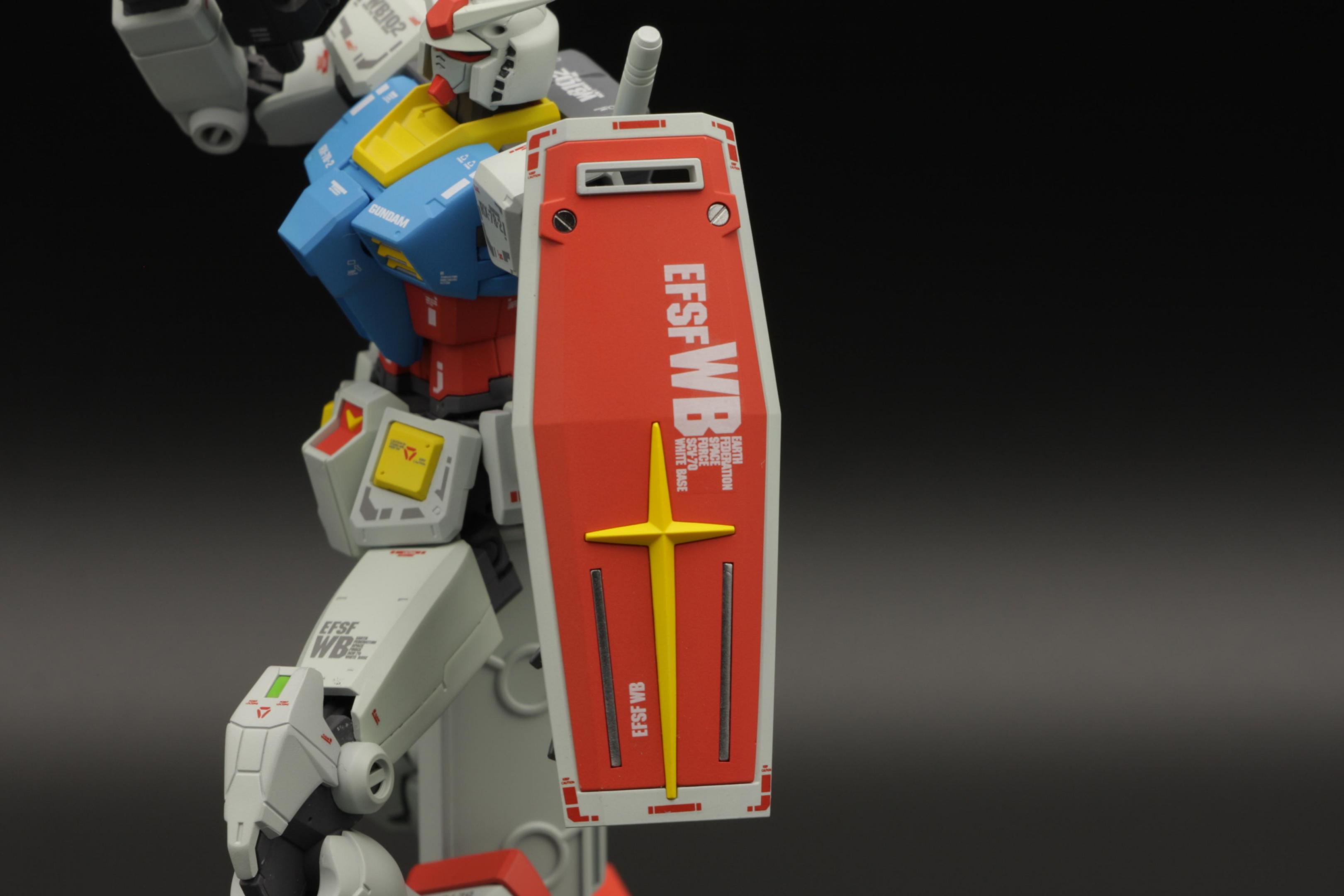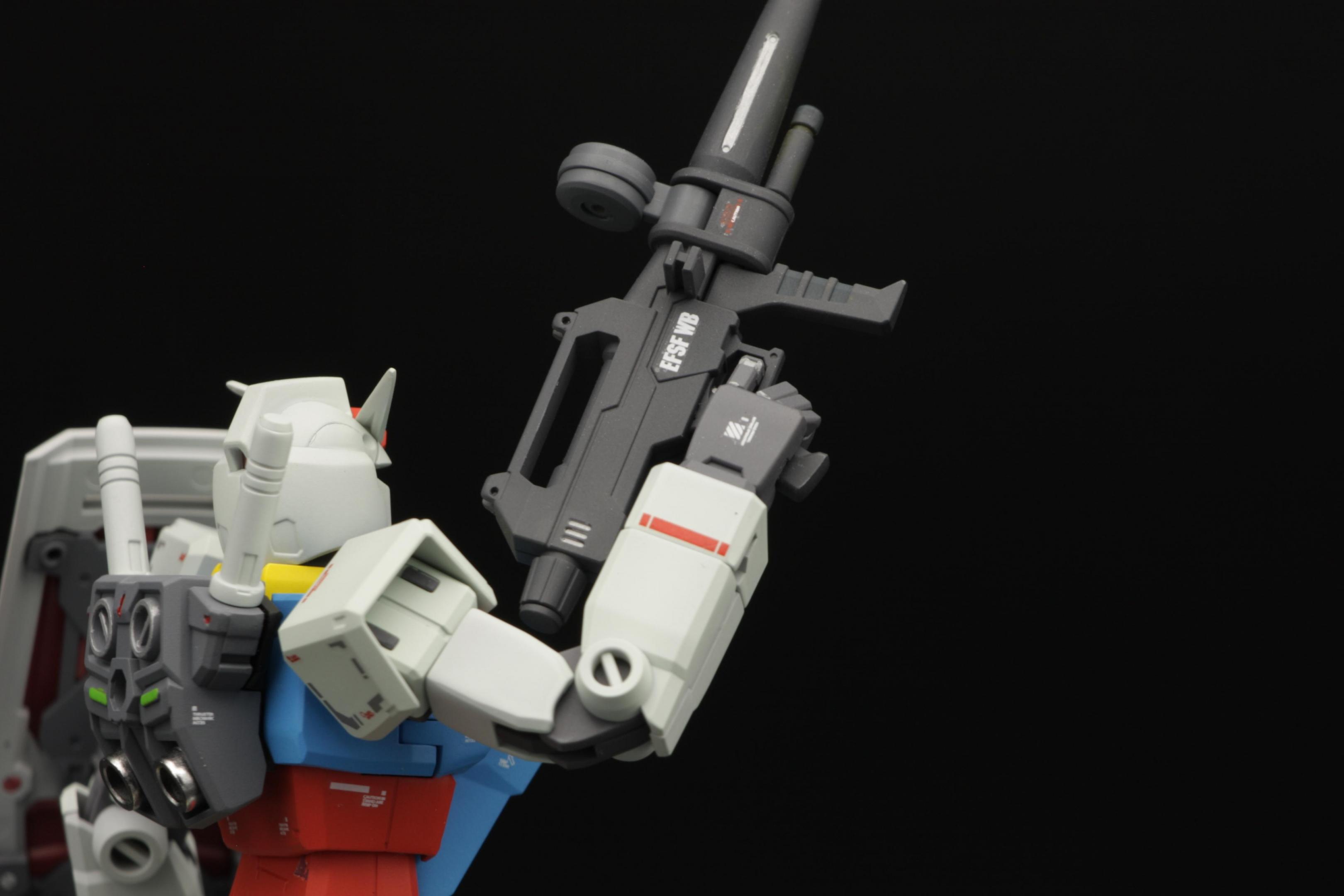 These photos were taken by Gamera Baenre at the 2010 NY Comic Con and Anime Festival, at the Bandai model contest booth. This model won 1st place in the 1/144 scale category. I opened all the molded holes in the armor. I beefed up the chest side thrusters with Kotobukiya vernier parts. The visor was made with aurora film applied over a shiny Metallizer to make it more reflective. I replaced one of the shoulder cannons with a Kotobukiya MSG Weapon Unit missile launcher, and devised a way to make it posable. The joint is not pretty, but it is not visible under the guard-piece on the backpack. The hand-held gun is another MSG part, and the shield came from an Armored Core weapon set. I modified a piece from my bits-box as a handle for the shield. I hacked at the shield with a rotary tool to make battle damage. There are a couple of small bullet-holes on other areas of the suit, but I concentrated the damage on the shield in an attempt to show the pilot is skilled with parrying attacks before they can do any damage. The model is painted in custom colors. Paints are Model Master, with Metallizer Titanium for all of the frame and joint parts. The wash is thinned out Tamiya German Grey, and I weathered with Tamiya Weathering Master. The flat coat is Micro-Scale flat acrylic. The number decals came from a Maschinen Krieger kit produced by wave. The "nose art" decal on the shoulder is by Starship Modeler.