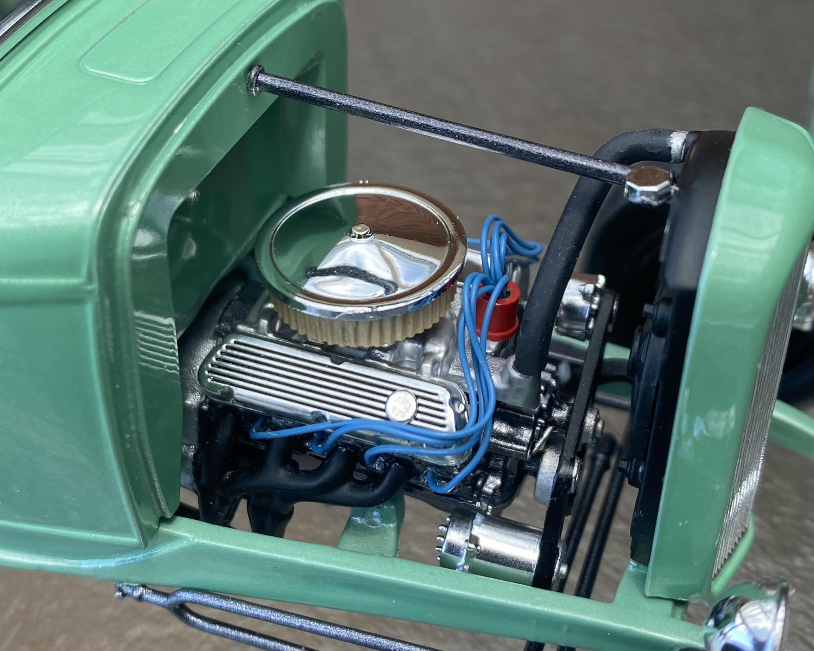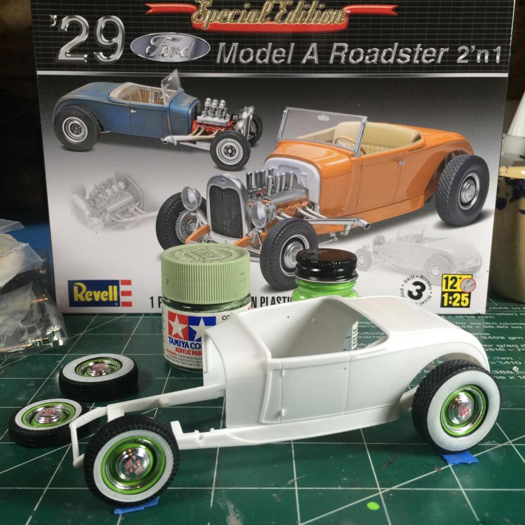 Because of the amount of kits I have in progress and the fact I'll be working out of town for awhile, I have been resisting the start of one of two 29's I have in my head. But with the amount of talented builders working on this great kit and the knowledge being shared. I believe it's important to strike while the iron is hot. This being the first build will be box stock, adding nothing but the allowable paint. It will be a "Highboy" and should be a good way to gain insight for the next 29, which won't be a Highboy! I decided to do the wheels and tires first. Model Master Sublime Green for accent, Tamiya Cockpit Green is the main color. I would like to take a moment to thank everyone who is building this kit right now. Your knowledge and skills are the best in the hobby. Thanks...