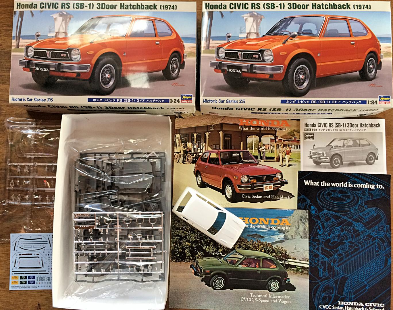 The 1:24 scale Hasagawa kit of the first generation Honda Civic hatchback. Since my first car was a 1977 Civic CVCC, I *had to* get two of these kits. I still have dealer brochures, great for reference (cutaway picture). I have not opened up the bags yet, if that's required for a proper review, I will do so. It's a curbside, decent engine bottom detail, but there is proper shock tower detail, as if there will be a chance for an engine kit. I'm wanting to build a US version, which will require scratch-building the front turn signals, door mirror, side lights, and the most demanding part of converting the dash to LHD, and I would need to modify the hood. I do see a CVCC chrome badge for the back, which is greyed out on the instruction sheet, but still need to do the grill and side badges. Decal sheet has lots of tiny things, but I have never seen window trim which is sort of silver done like this, all Japan market badges. Makes me think I should hold out for a US version of the CVCC?