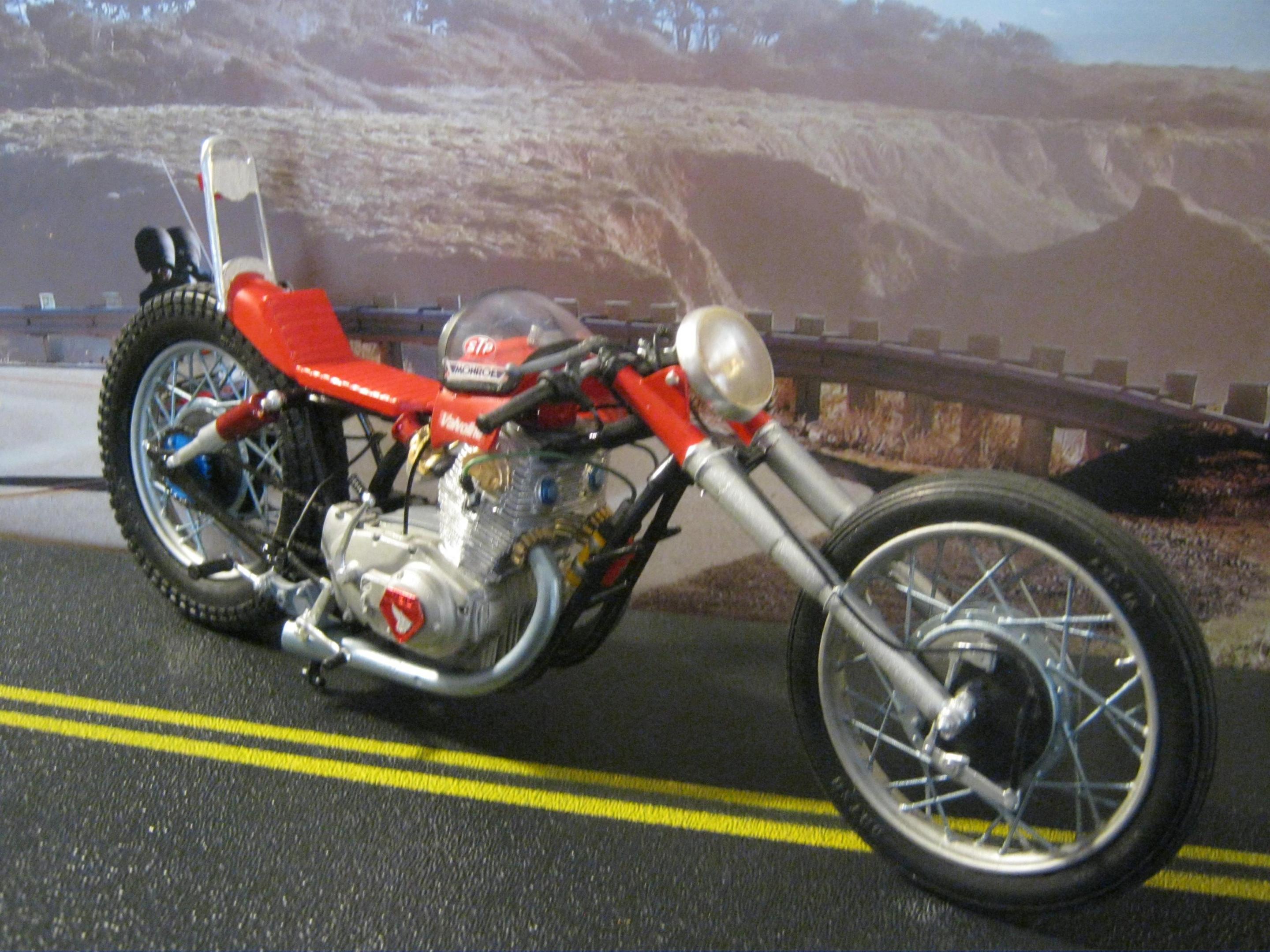Hey folks,,here a a bizzare creature in styrene,,got this at a swap meet last year for 7$,,it was a glue blob in a ziplock bag,,1/2 built. Complete teardown,,striped all paint+ plating. And with only pics of it on the web,,I didnt have an instruction sheet ,,set out to rebuild. Used Truevalue red hardware store paint,,and same BLK for chassis. Hand painted everything else. It came with a bullit style fairing,,that as Steve Perry stated when we looked at it in the bag,,he found the fairing "disturbing" LOL ,,Steves awsome. And I agreed,,so Ididnt even use most if it,,I trimmed w/a dremmel all of it except the back 1/4 section of it,added gauge decals and,,it looks better ,,we can see that 350 twin honda motor better. Used steel blue duplicolor for spokes+rims+ exsaust. Had to use a different,,larger back tire. The kit supplied tire was a front tire profile,,it looked too small. So now..gonna Look for another kit to start for my social distancing edict.
