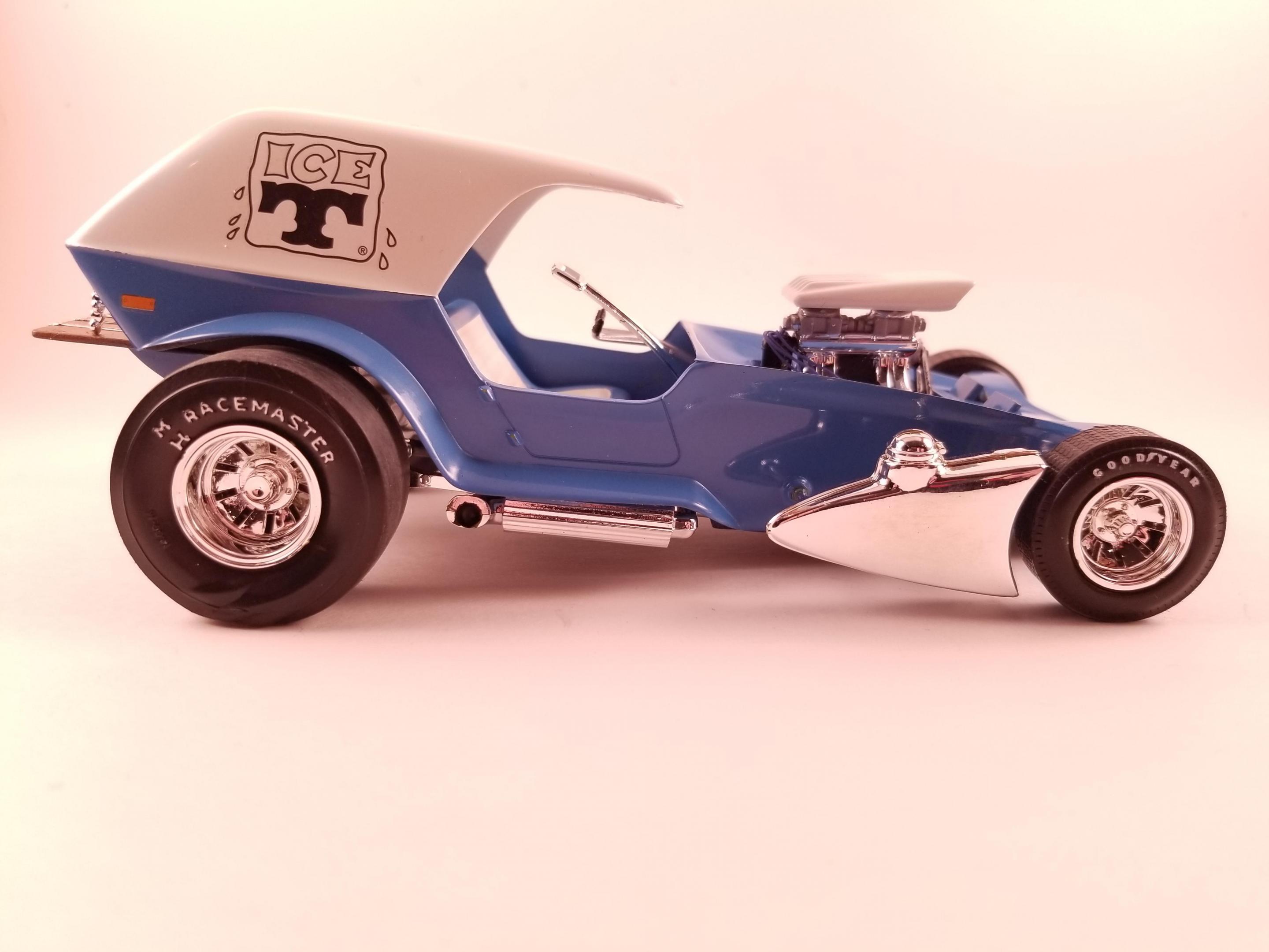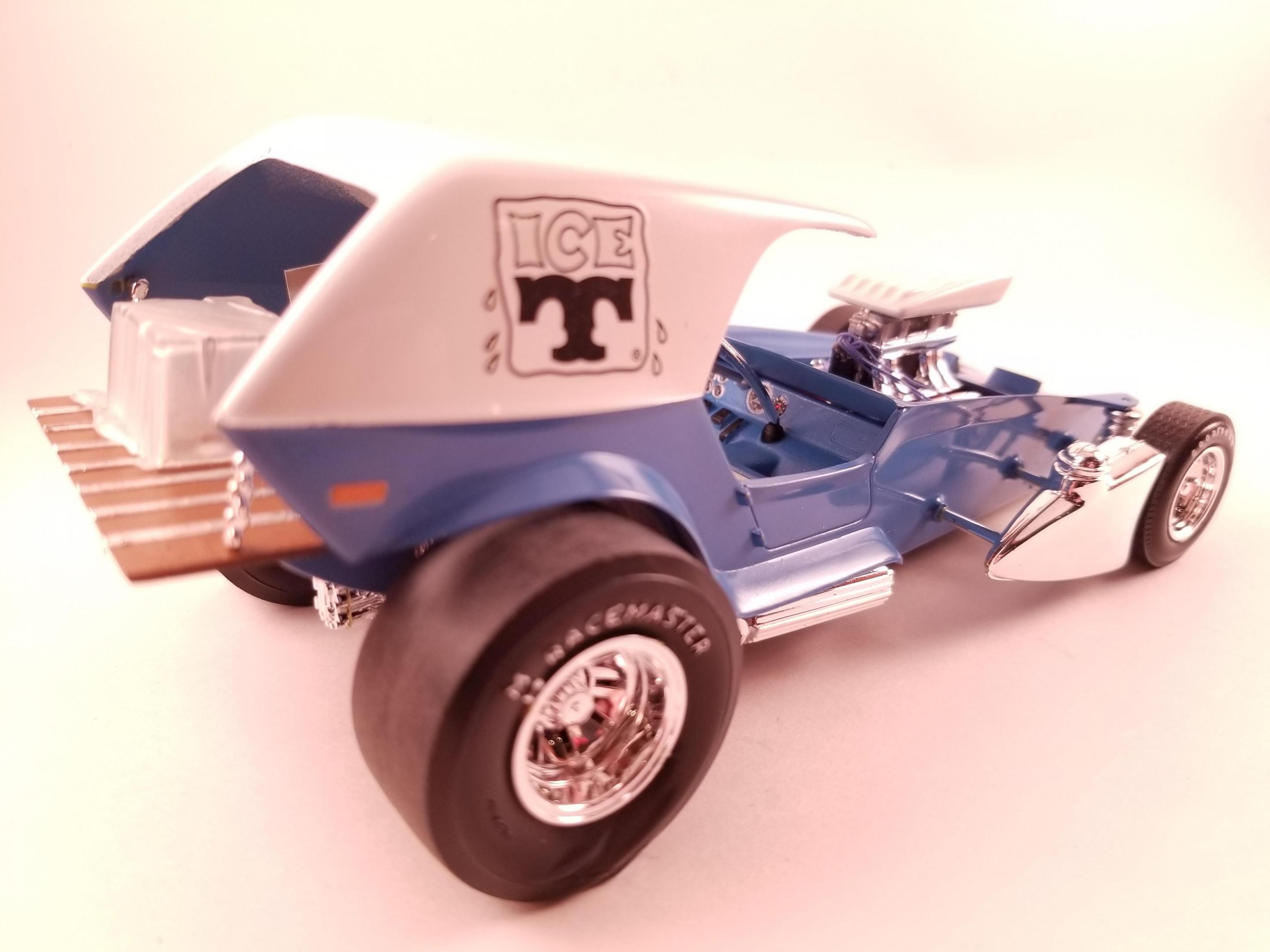 Who doesn't love late '60's/early '70's, totally off the wall, OTT show rods? Well... I'm kind of lukewarm about them myself, but there are some pretty cool ones out there. The designs of Ed Roth and Tom Daniel are among my favorites, and the Ice T... well, I can't say it's one of my faves.But as a chronic kitbasher, I can say it has some really cool parts that could make their way into other models. As you can see, in typical early Monogram fashion, there isn't too much to it. The big bonus is the parts are nicely molded, and the chrome looks good. The wheels resemble the ones found in the old Monogram Paddy Wagon kit, and you get a pair of those big, wrinkled, 'non -directional' , slicks. I'm also really fond of the twin, side mount, crescent-shaped fuel tanks, which mount just aft of the front tires. The bummer is you'll ruin the plating joining the two halves together and eliminating the seam on the fuel cap. And the kit has lots of other little doodads I find very tasty... the quick change rear diff, the ladder bars, the aformentioned slicks, and I'm really thinking of grafting that roof onto something! I've seen these built up, and they do look cool (oh, jeez...) if you like the style. Mine won't end up looking anything like the box art model, though.