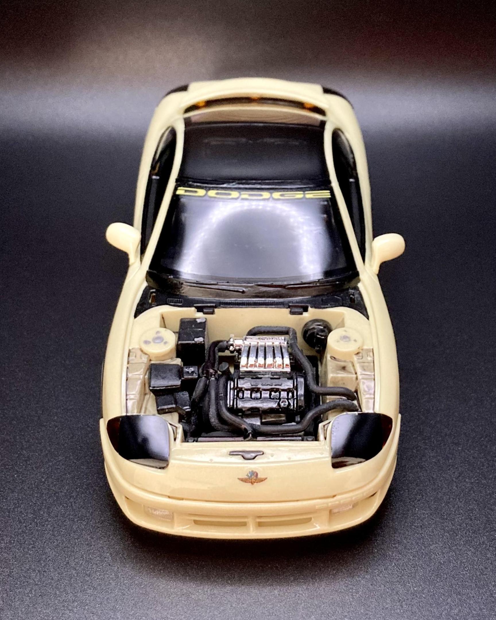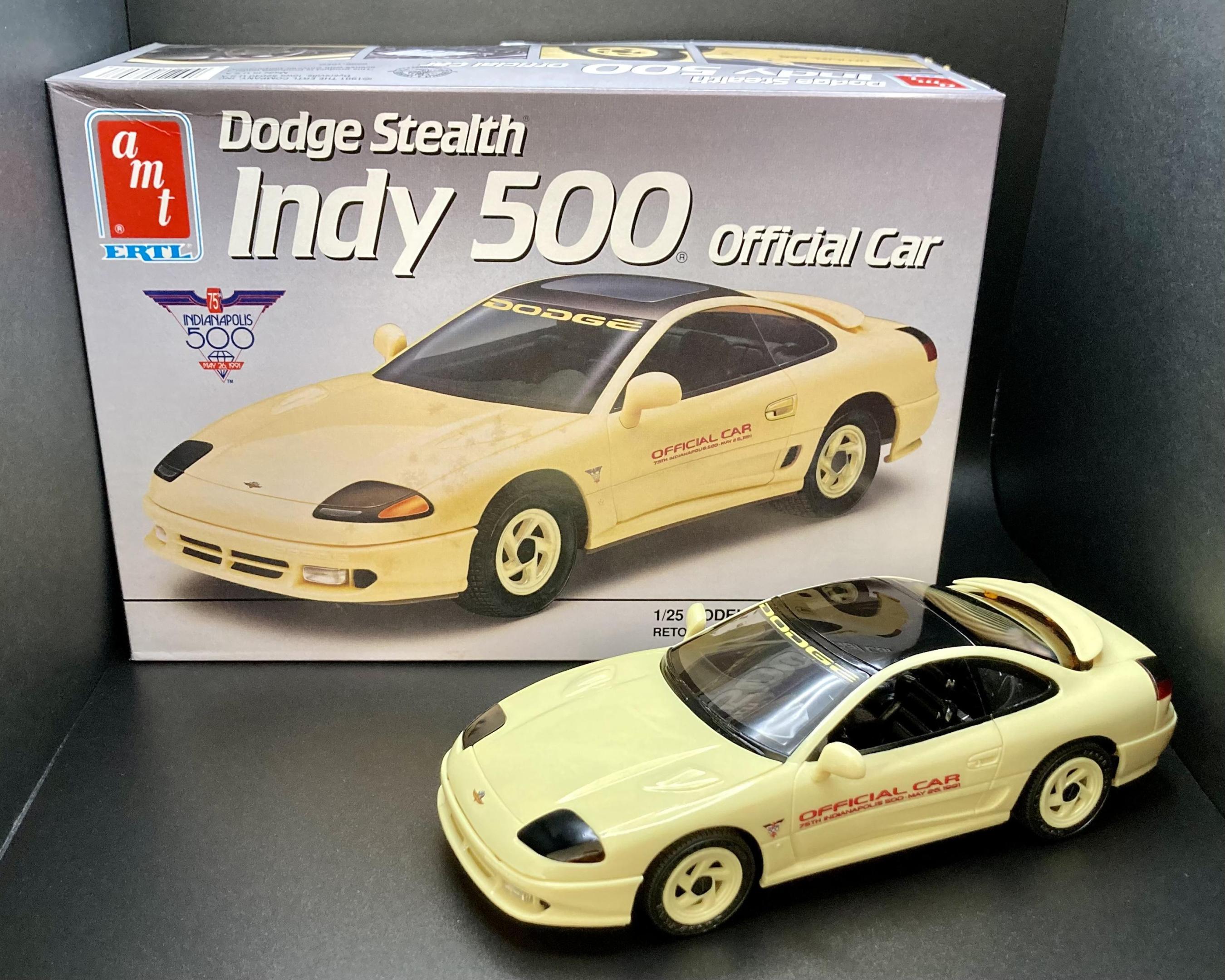 Here’s my build of AMT’s Indy 500 Dodge Stealth! This kit was molded in a pale metallic yellow to match the custom painted real “official” cars. Whenever I get a molded-in-color kit, I try to use the bare plastic body, polished with a coat or three of Pledge gloss, assuming there aren’t any flow lines in the cured plastic. This rarely happens with metallic plastic (or solid colors for that matter), but this particular kit looked perfect! Kit goes together pretty well, but the under hood hoses are a bit tedious. Despite being a glue kit, there are a lot of vestigial promo/snap kit features in the assembly which was kind of interesting. Overall a nice kit to build of a cool looking car, so I’m surprised they still sell so cheaply on eBay. I actually bought a two pack of this kit for $16!