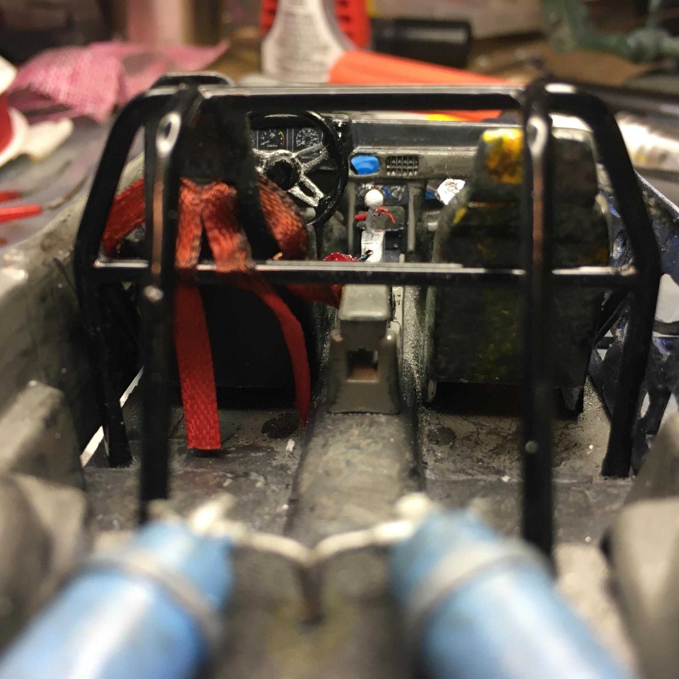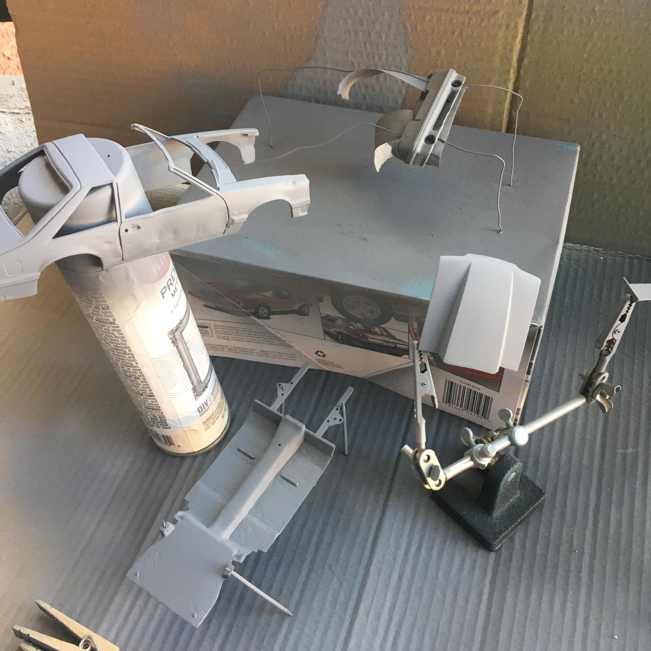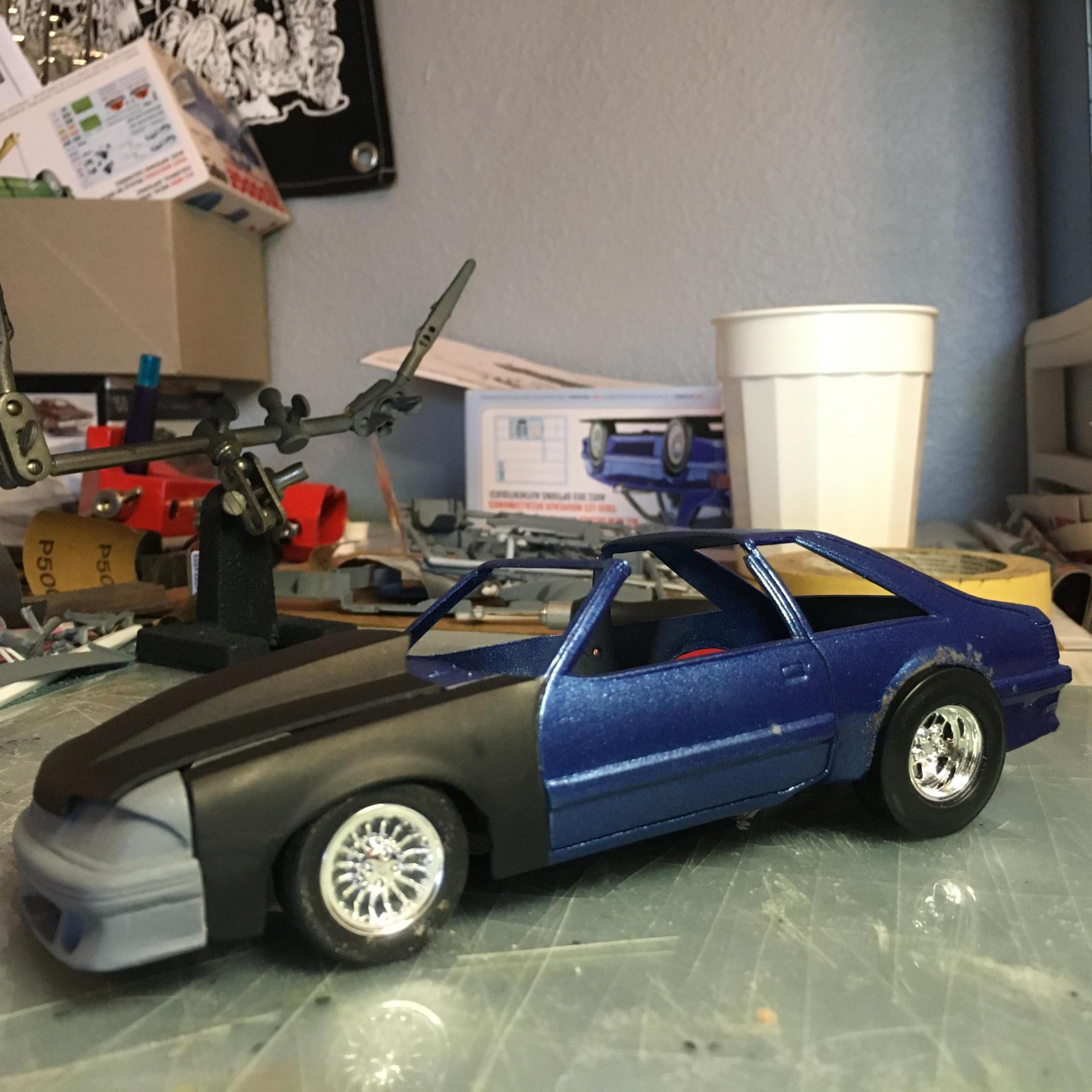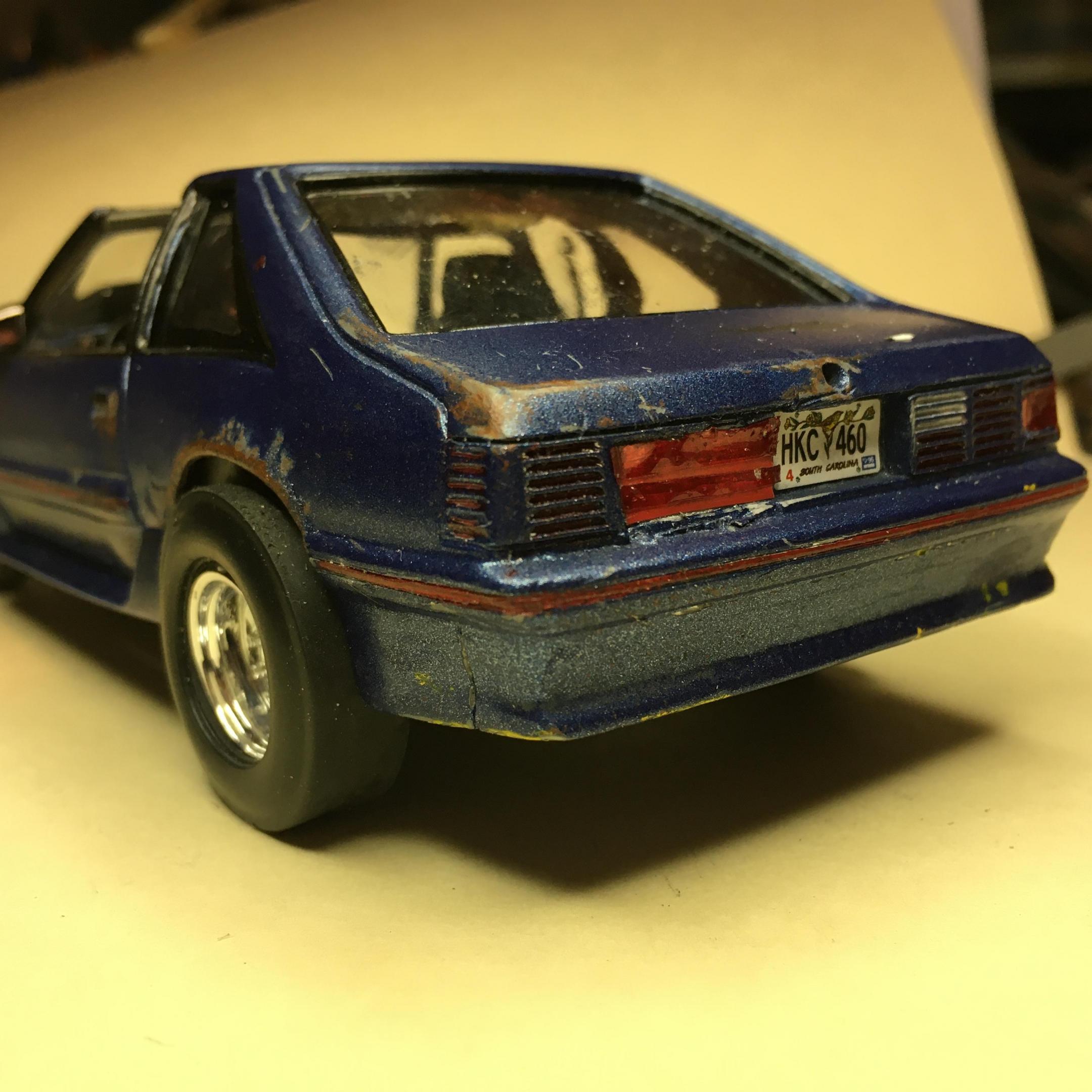 My goal is to build the worst Foxbody I can imagine. I'm starting with AMT's 88 GT kit. I am using a few unused bits from a 90LX that Revell released, I recently built as well. I will be scratching out whatever I need to complete the vision. Enjoy... Went into primer... I am going with a targa roof instead of T-Tops. I was having trouble getting the lower front valance so i cut the whole clip off and worked these pieces together. This is how the real car is built, so I figured nothing would look funny once it's all together. The fog lights have beaten out of their housings and the airdam is far from aerodynamic. This thing will be several colors, so perfection isn't my aim here. Scribed the panel lines, worked the dents into the body with candle heat. I'm giving this hog beast the big cowl hood to clear what I believe to be a stroked, nitrous huffing Chevy motor. This heap will be a fully neglected death trap, complete with improper safety equipment and unsafe components. Peep these bald 4 lug OEM front wheels... Sure it does 11's but the only thing holding it together is a thick coat of grime and rust... I've seen 1 foxbody in my whole life that had a stereo in it. The glovebox latch is broken and the passenger door panel is long gone. Got some color laid out and I am going to keep the patina for now. Focusing on interior, I found a grant style aftermarket wheel that was screaming for a trip back to the 80's. Scratched out a ratchet shifter and some nitrous tanks. Color and Style... With the tall valve covers I believe this to be a stroker setup on a 350 cast. Wired and plumed all the bits as best as I can tell. Manual brakes, no A/C, no power steering, cut the heater lines, so not much needed under the hood... I scratched out the harmonic balancer, alt bracket, serp belt, plug wires, wet shot intake and brake lines. It's running shorty headers, and I had to reverse the oil pan instead of modifying the K member ? But it all tucks in nicely. It's going to have electric fans, but I'm having trouble with the core support fitting properly. Can you spot the coolant leak? This is where I am now. 7 months and counting...