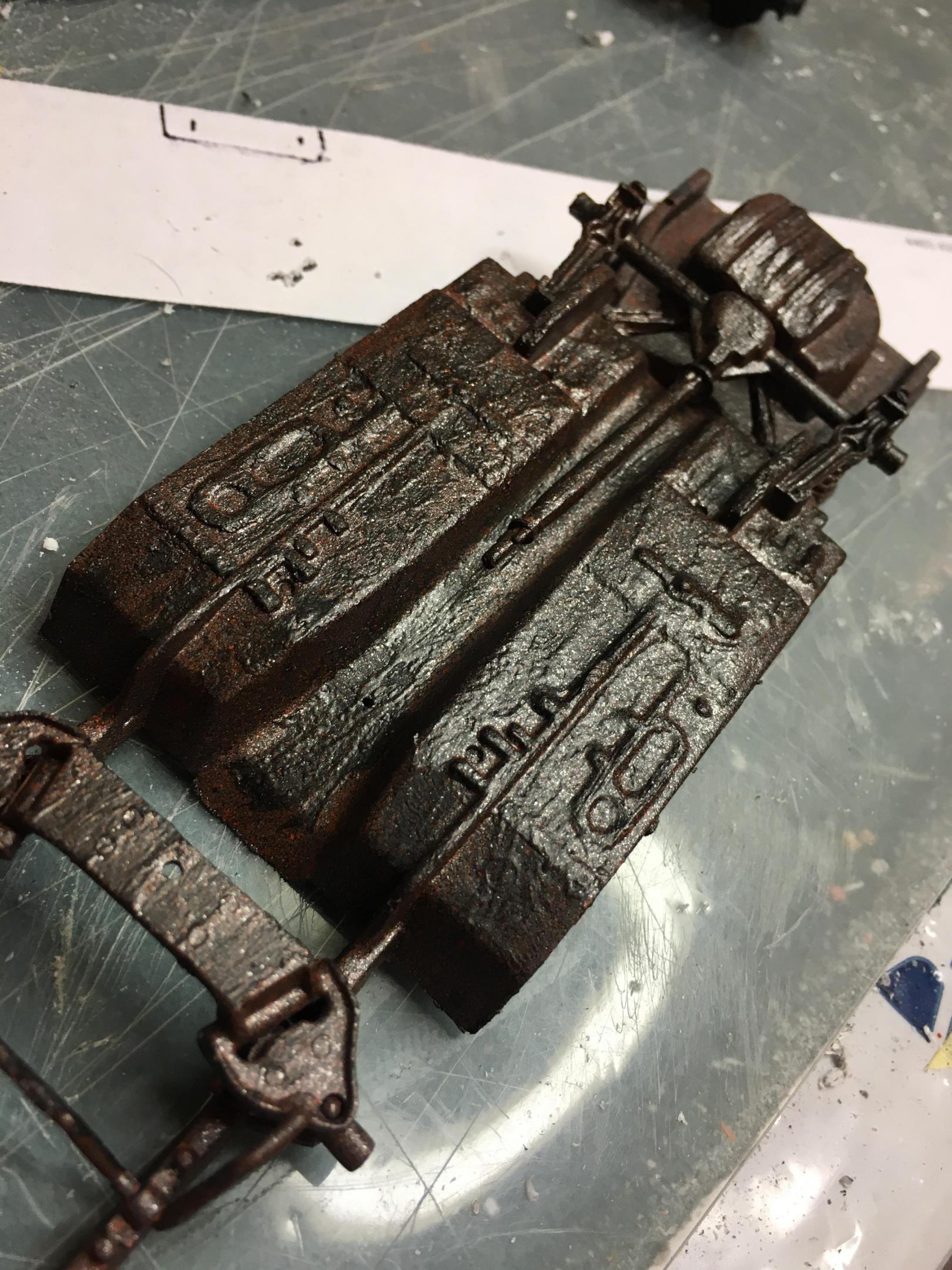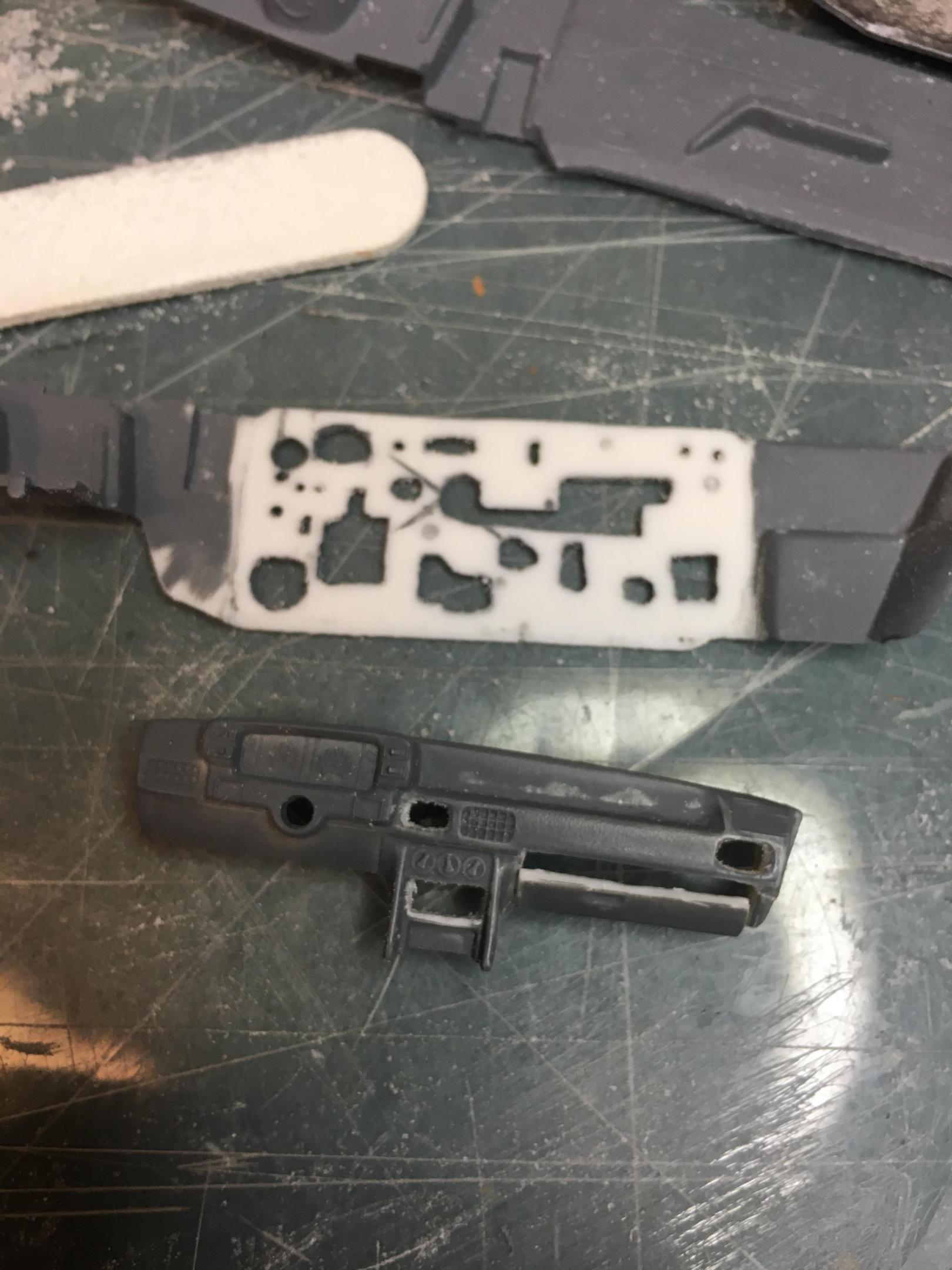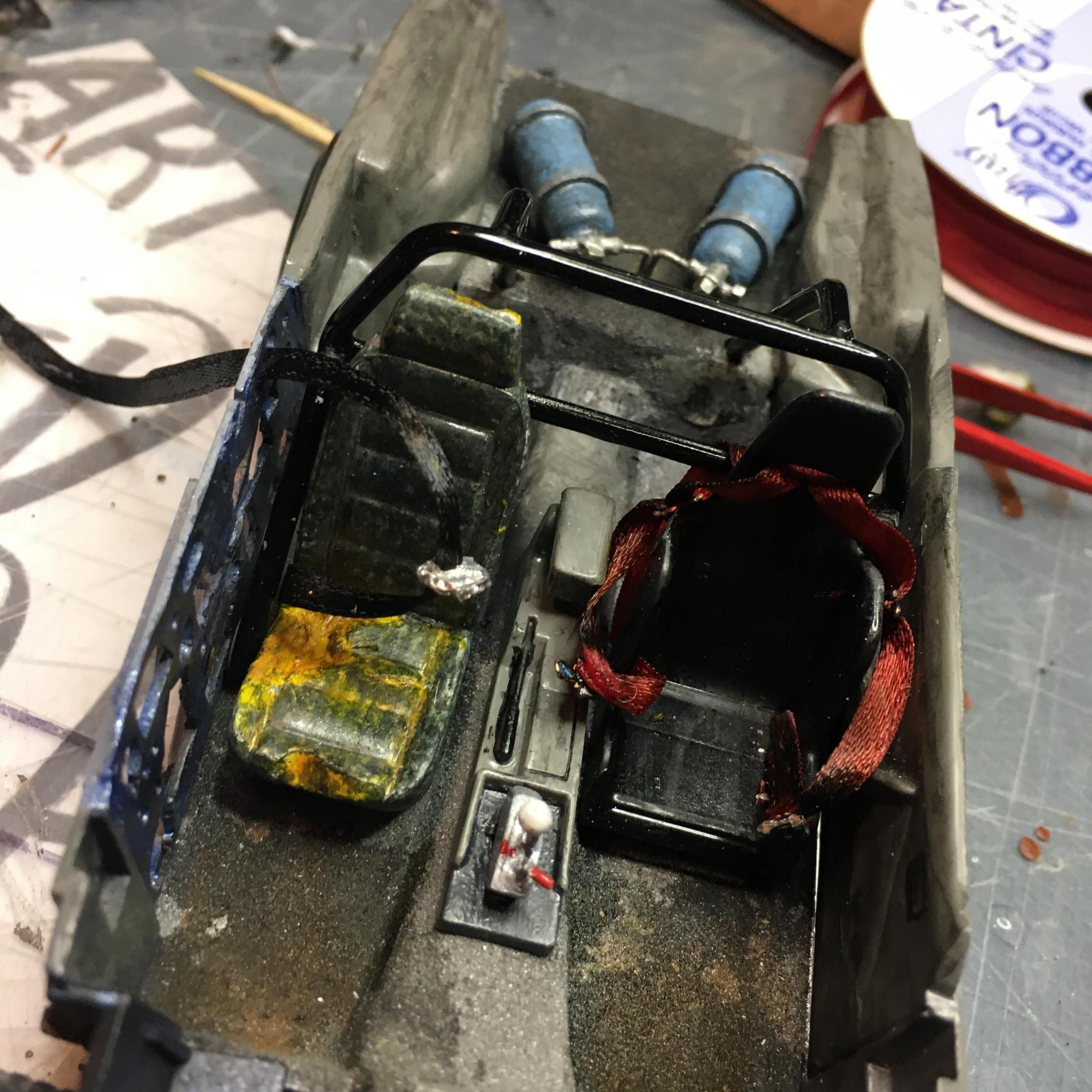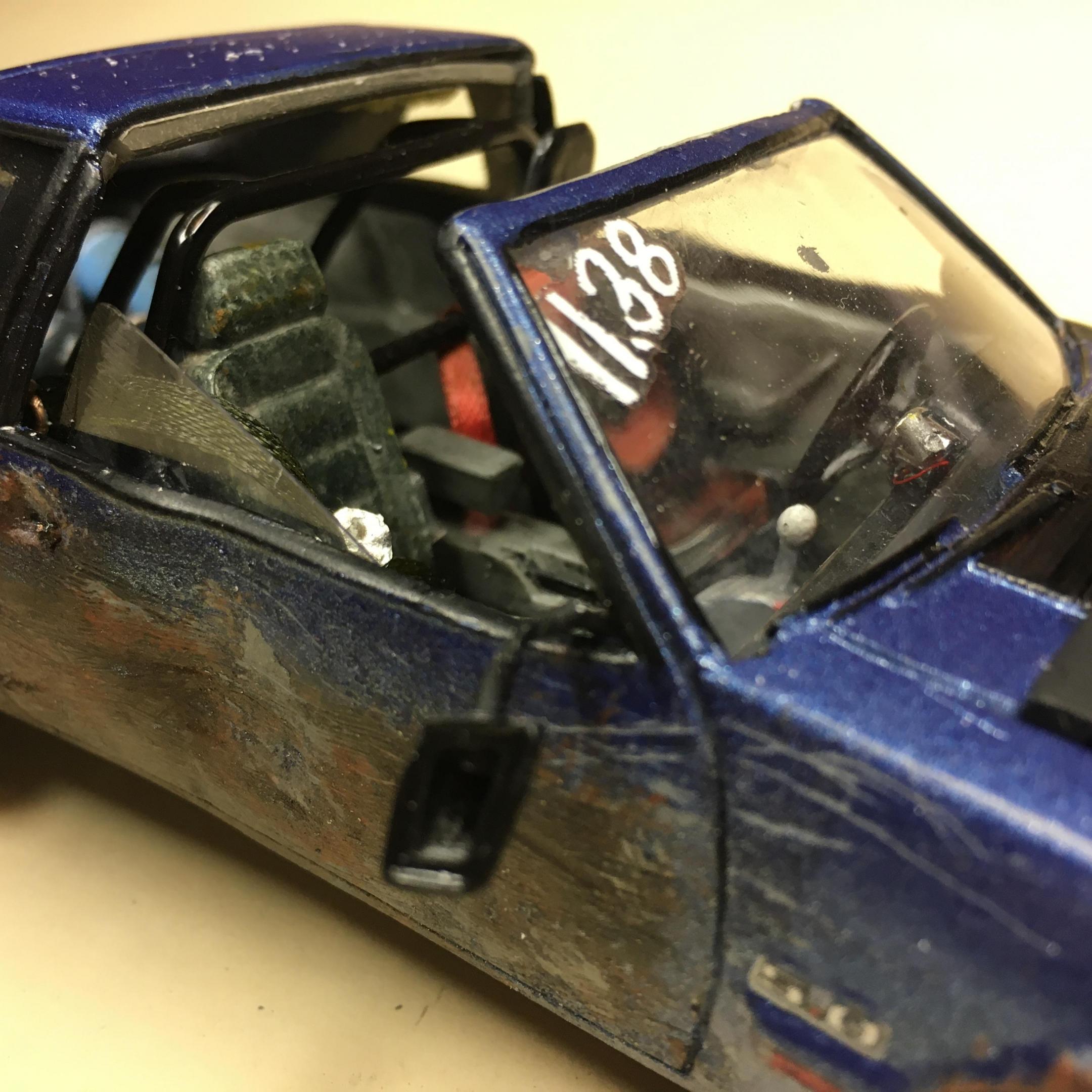 My goal is to build the worst Foxbody I can imagine. I'm starting with AMT's 88 GT kit. I am using a few unused bits from a 90LX that Revell released, I recently built as well. I will be scratching out whatever I need to complete the vision. Enjoy... Went into primer... I am going with a targa roof instead of T-Tops. I was having trouble getting the lower front valance so i cut the whole clip off and worked these pieces together. This is how the real car is built, so I figured nothing would look funny once it's all together. The fog lights have beaten out of their housings and the airdam is far from aerodynamic. This thing will be several colors, so perfection isn't my aim here. Scribed the panel lines, worked the dents into the body with candle heat. I'm giving this hog beast the big cowl hood to clear what I believe to be a stroked, nitrous huffing Chevy motor. This heap will be a fully neglected death trap, complete with improper safety equipment and unsafe components. Peep these bald 4 lug OEM front wheels... Sure it does 11's but the only thing holding it together is a thick coat of grime and rust... I've seen 1 foxbody in my whole life that had a stereo in it. The glovebox latch is broken and the passenger door panel is long gone. Got some color laid out and I am going to keep the patina for now. Focusing on interior, I found a grant style aftermarket wheel that was screaming for a trip back to the 80's. Scratched out a ratchet shifter and some nitrous tanks. Color and Style... With the tall valve covers I believe this to be a stroker setup on a 350 cast. Wired and plumed all the bits as best as I can tell. Manual brakes, no A/C, no power steering, cut the heater lines, so not much needed under the hood... I scratched out the harmonic balancer, alt bracket, serp belt, plug wires, wet shot intake and brake lines. It's running shorty headers, and I had to reverse the oil pan instead of modifying the K member ? But it all tucks in nicely. It's going to have electric fans, but I'm having trouble with the core support fitting properly. Can you spot the coolant leak? This is where I am now. 7 months and counting...
