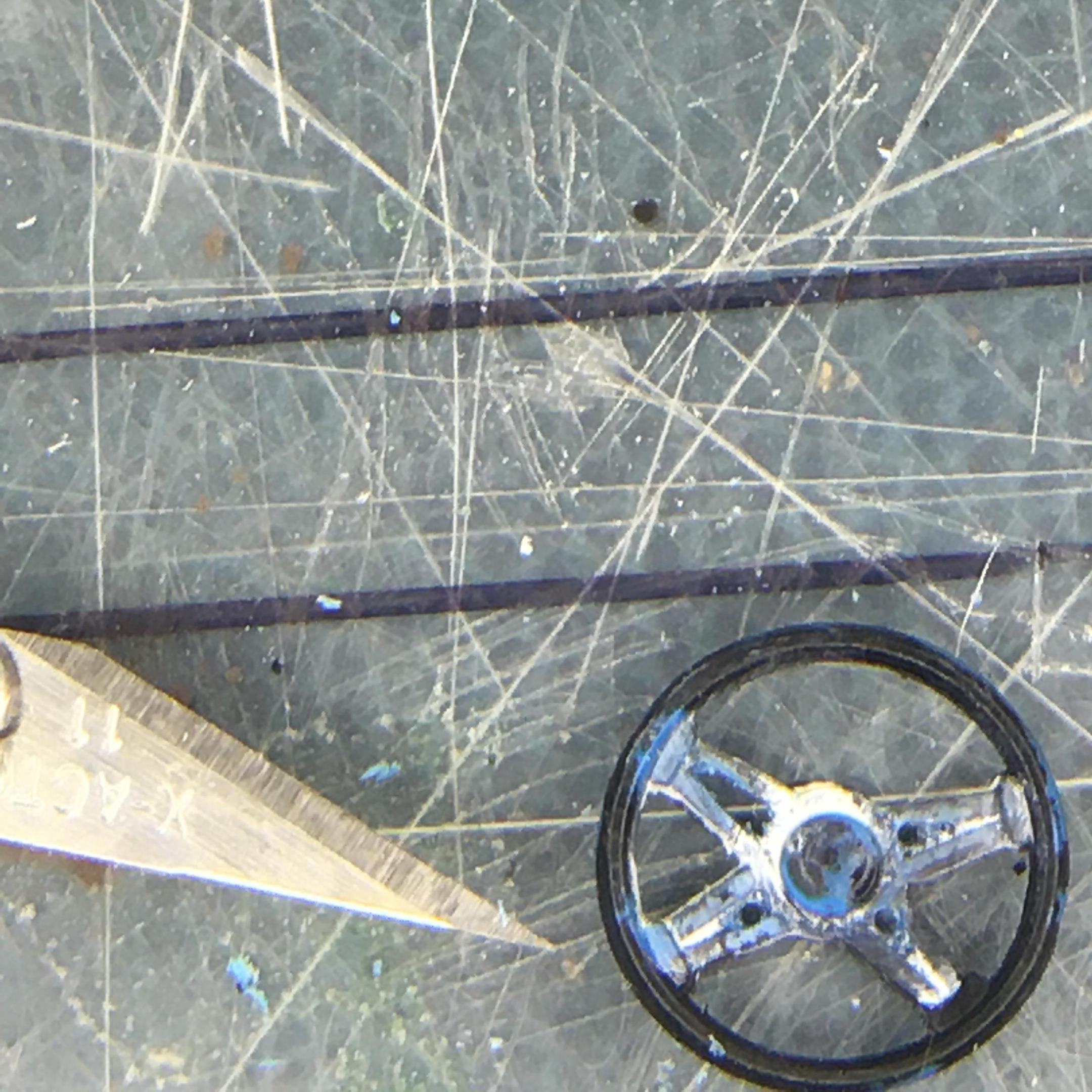 After a year of trying this and that, I finished this crazy kitbash project. Based around the Monogram 1/48 scale P=40 Warhawk, AMT Model T frame, suspension parts from Airfix's 1/32 Omnibus, and a mish-mash of other bits I either grabbed from the parts pile, or built myself. Drive system drops from behind the prop spinner to a shaft running under the engine to the rear axle. After these photos were taken, I added hexnuts to cap the front hubs. Figure is a 1/43 '50s sports car driver in resin.