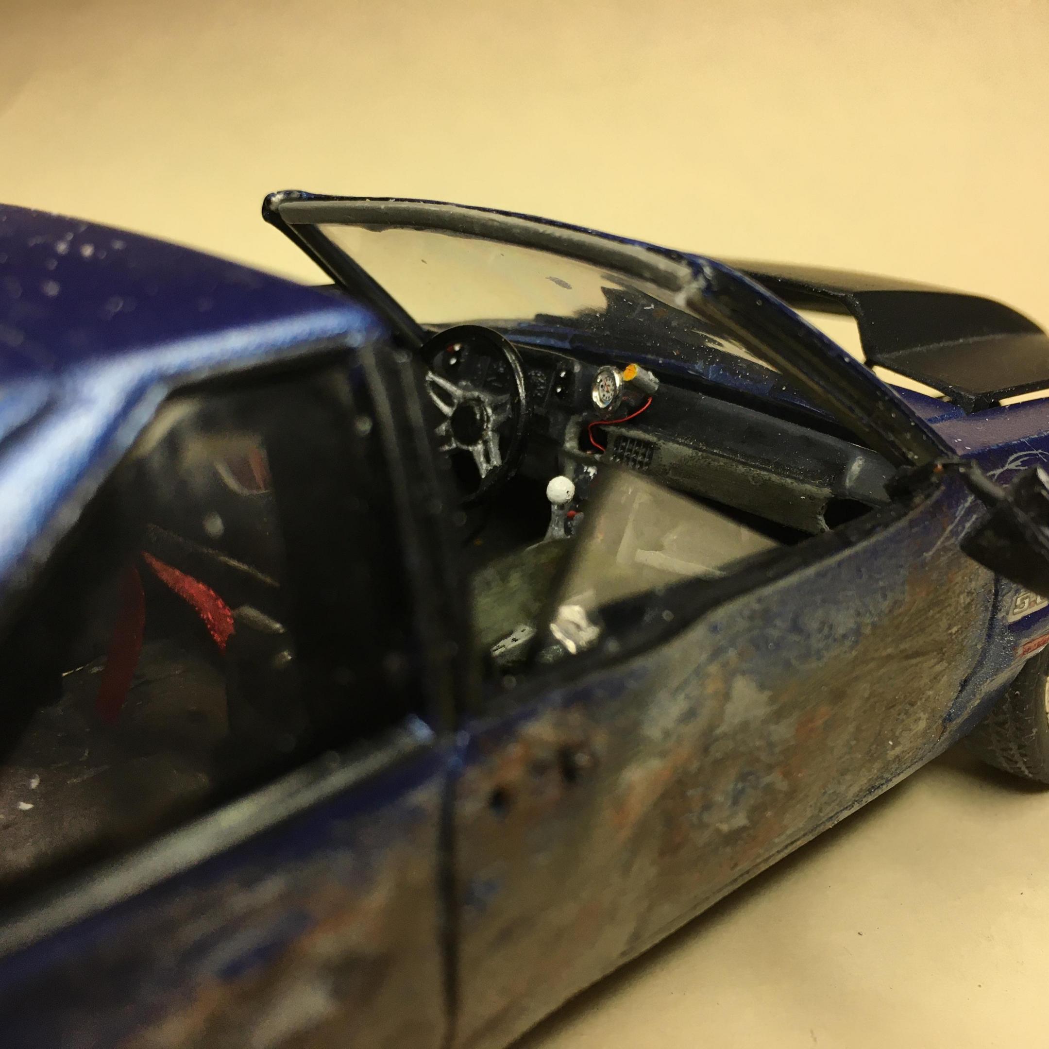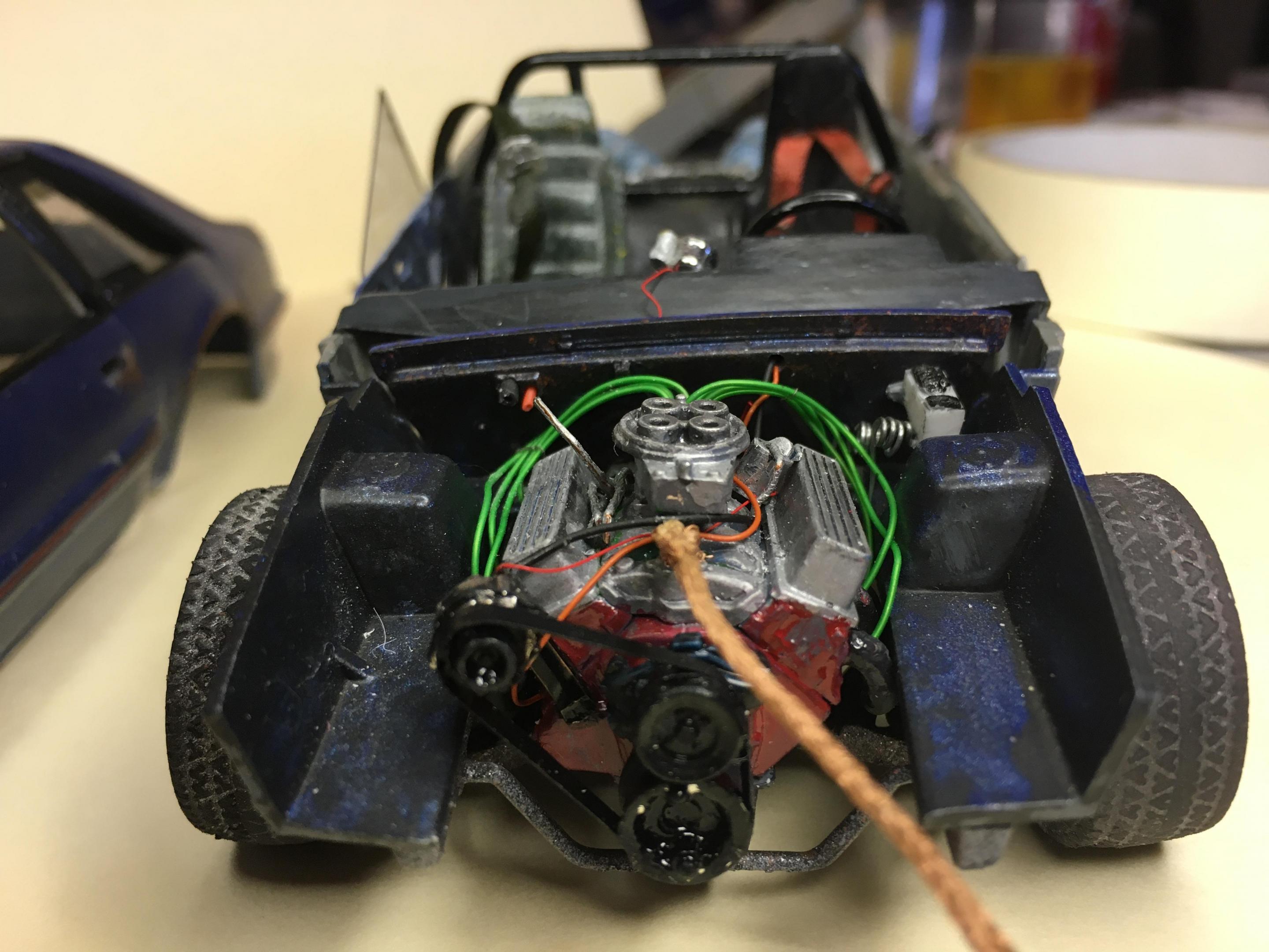 This build is a replica of the 72 Demon I owned for about 15 years. It was born a 340, 4 speed, B5 Blue car. That did not last as seen. It was custom painted black with Candy Tangerine panels with ghost stripes / images with blue, red, yellow designs. The original 340 went bye bye, in its place was a .030 over 68 340 with higher compression pistons, professionally balanced, custom wild ported X heads, Comp cams 292 duration cam, Edelbrock Victor, NOS nitrous system, tweaked 750 double pumper fed by 1/2” aluminum fuel line with twin black Carter pumps through a Fram HPG1 fuel filter. A Lakewood scatter shield, slick shift modified 833 trans, 4:10 sure grip. The springs were Superstock and moved inboard 3” and had an adjustable pinion snubber. All interior panels were aluminum, rear seat removed, 6 point cage. The seats were from a Fiero GT. On to the build: I started with a resin body I bought on EBay many years ago. The chassis is from the AMT 71 Duster. The engine, trans, carb, nitrous bottle are VCG Resins. The seats are from a Fiero kit I found on EBay. The shifter is from Harts Parts. The hood scoop is from the Monogram Camaro. Much of this kit was scratch built using styrene sheet, rod, aluminum sheet, tubing. All the braided stuff is from Ted’s Modeling Marketplace. I cut out the trunk to make access to battery, nitrous, cage. Designing the hinges drove me nuts, as there was no solid place to mount them. The paint was another story all together, as I had a Candy Tangerine disaster the first time. I still have to paint the marker lights, the Moroso air cleaner once it gets here, and do the rear hood pins on the hood. Edit, second set of pictures are with mirrors, hood pins, marker lights installed. It is also pictured with the strip tires and rims I forgot, grille and marker lights are the new Few Sprues Loose items.