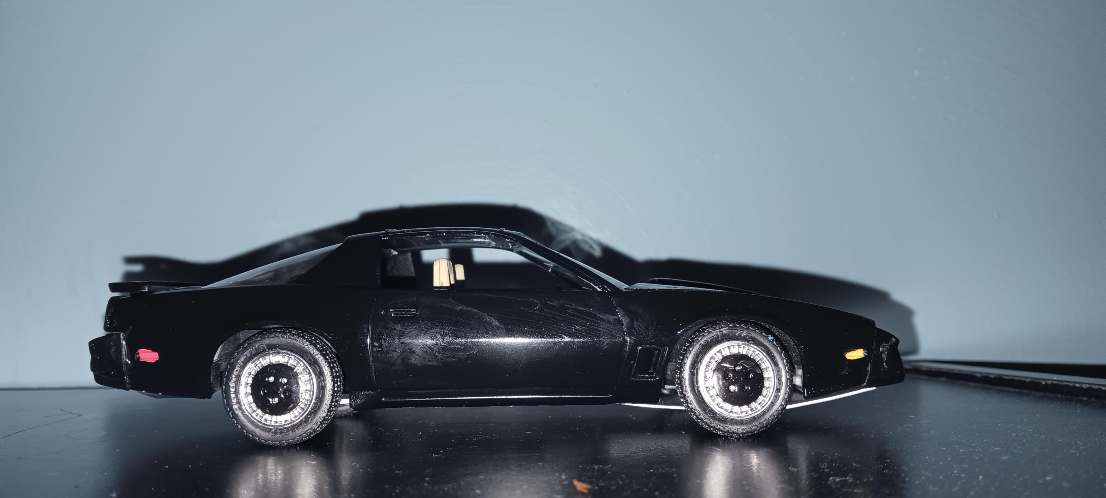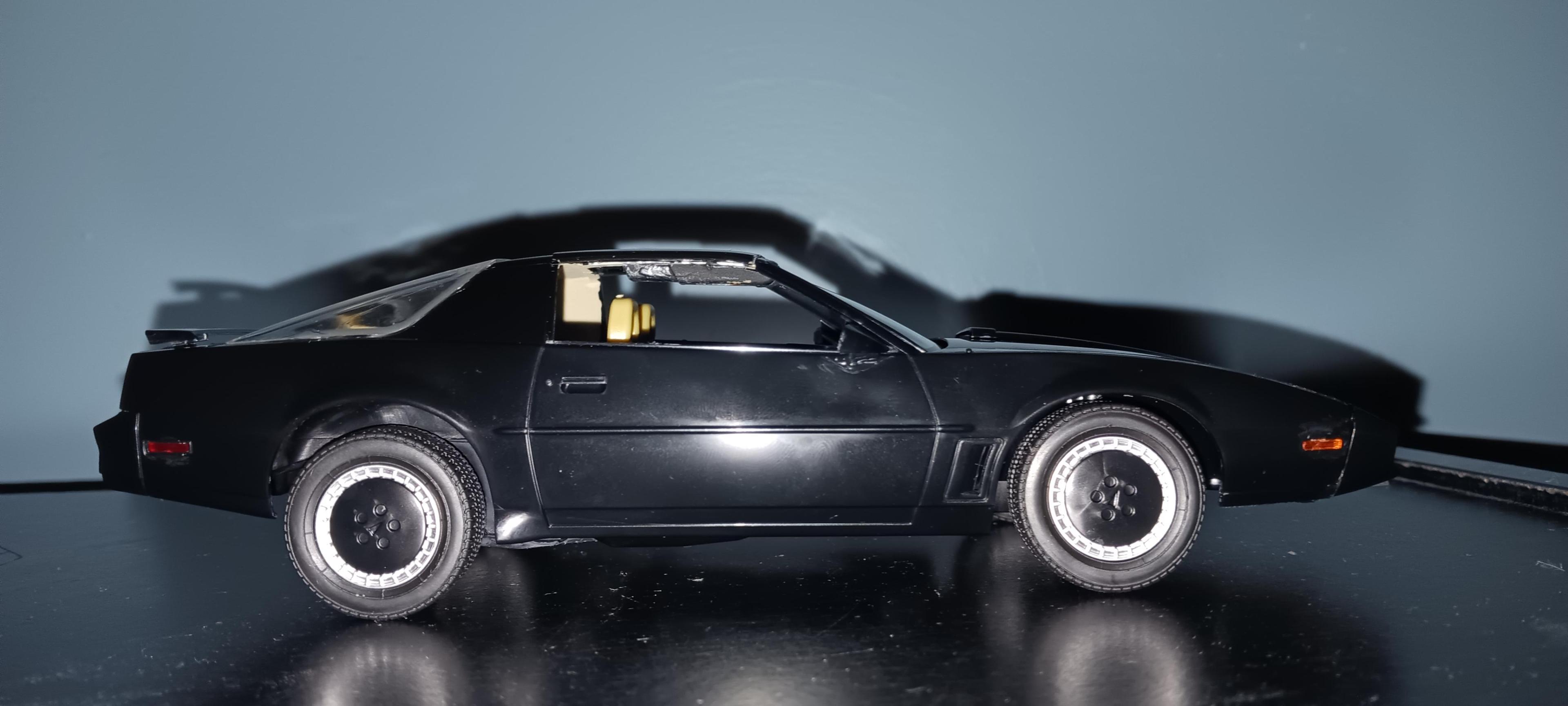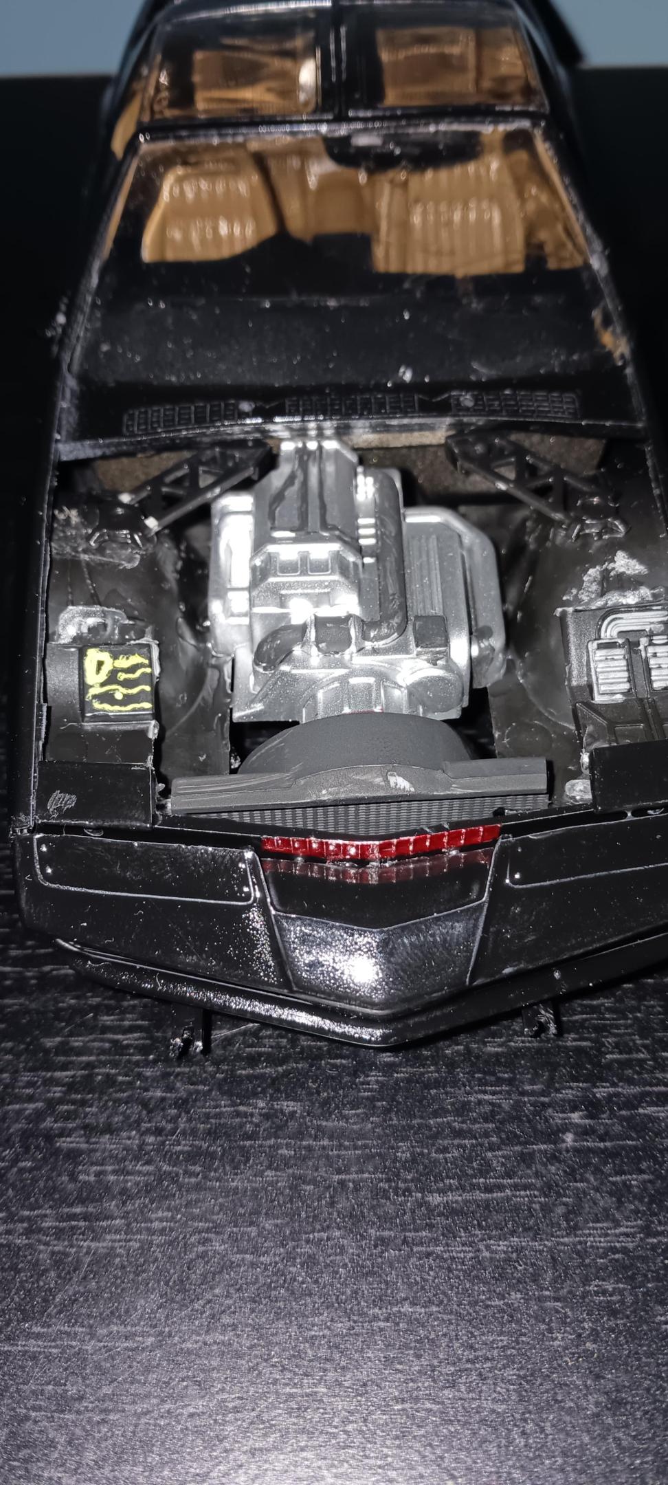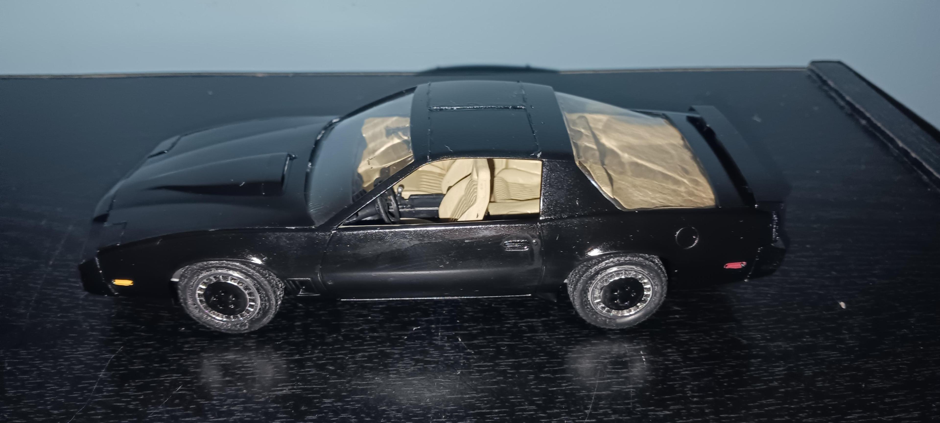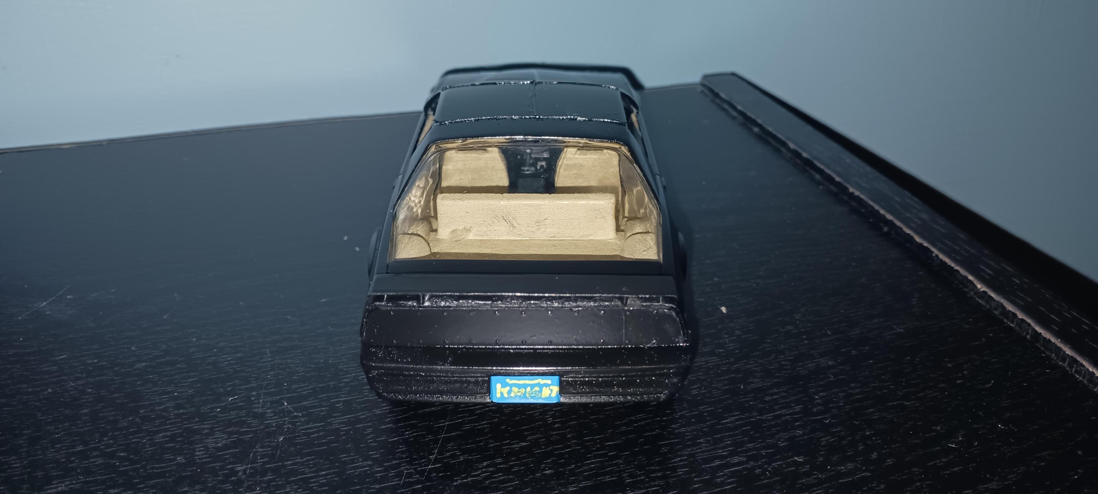 this is a replica of the hero car used in season 1 and 2 I made this using two different original 1/25 scale mpc knight rider models one was almost complete kit that had some parts melted to the tires and a partial glue bomb built up I basically just swaped the body hood and glass from the glue bomb built up with the ones from the almost complete kit the some of the engine bay parts and turbo jet engine came from spare Jada 1/24 scale die-cast KITT I also used the dash decals from it also I scratch built the tow bar receiver that allowed both the hero car the insert car and the back up to the hero car to be attached to a Camera truck so they could film out on the actual roads with the either just David or David and someone else in the car doing driving scenes it is also how you can tell if the car on screen is one of the 3 cars mentioned above or one the stunt cars which did not have the tow bar receiver