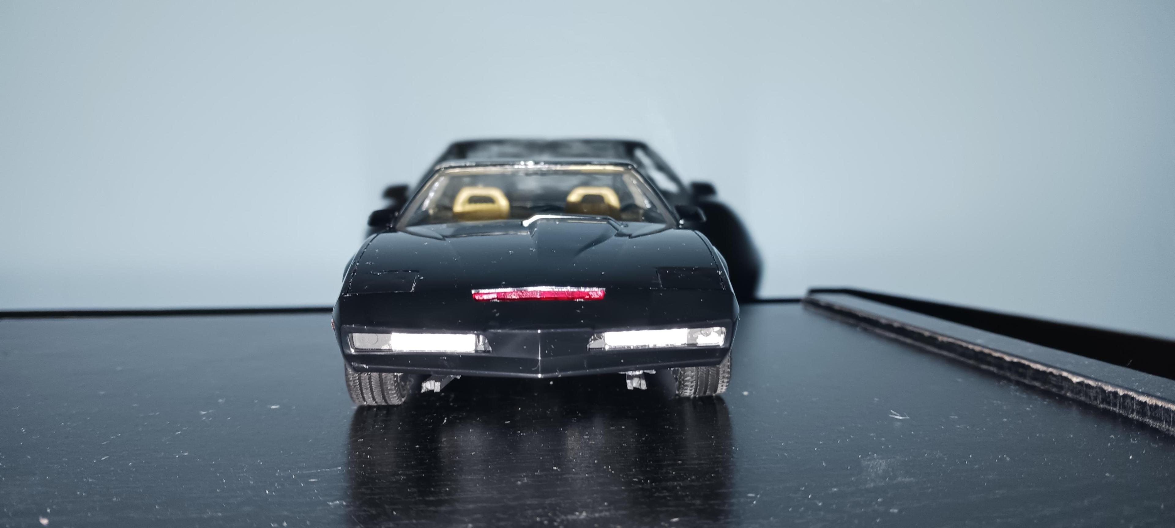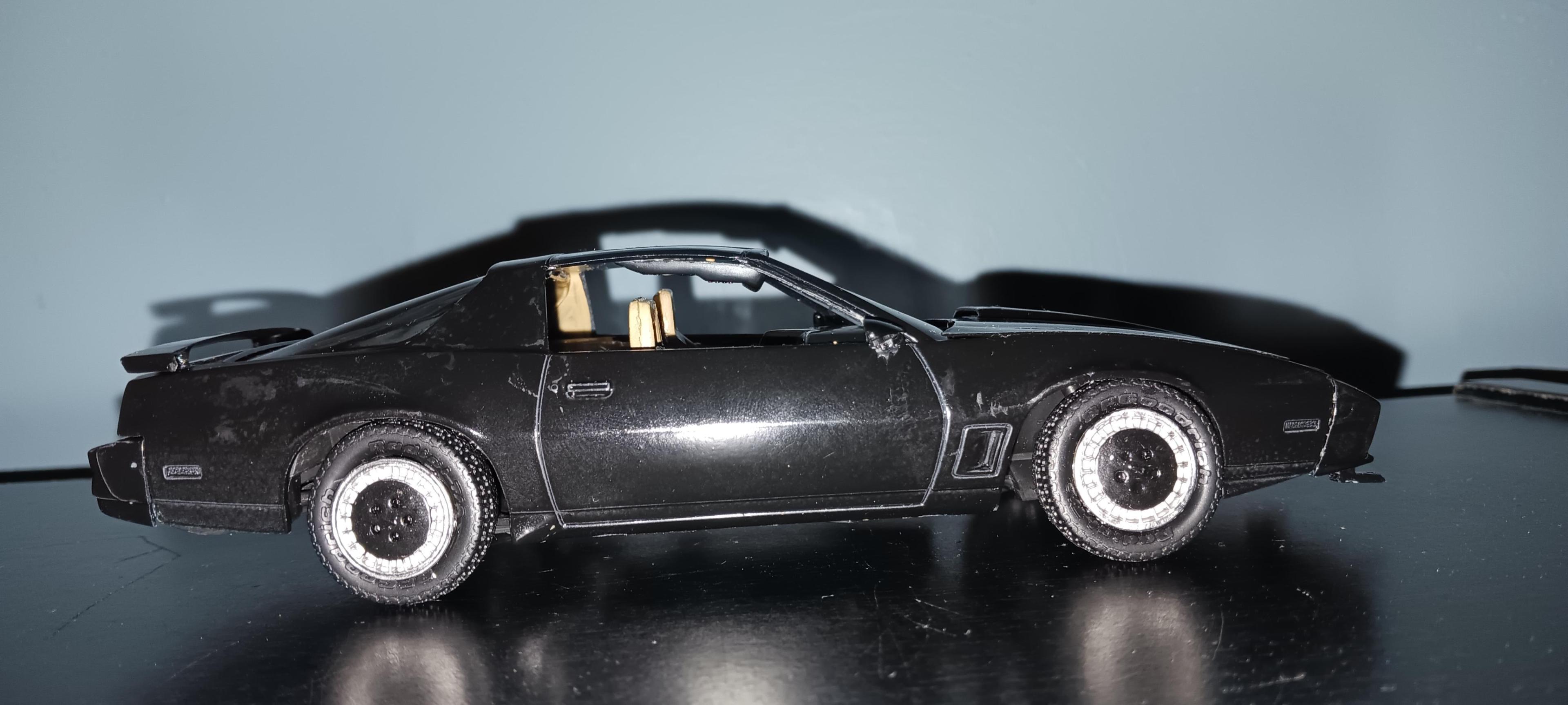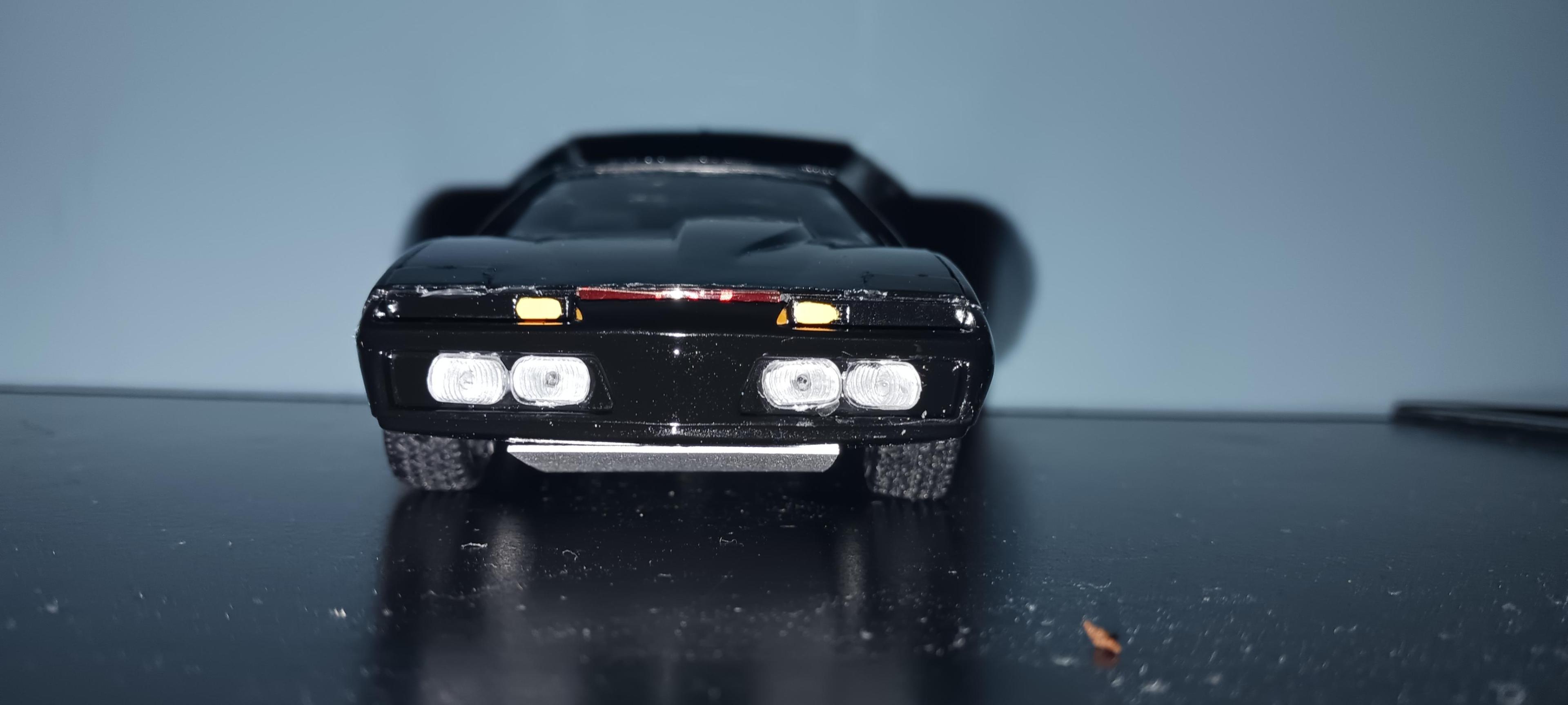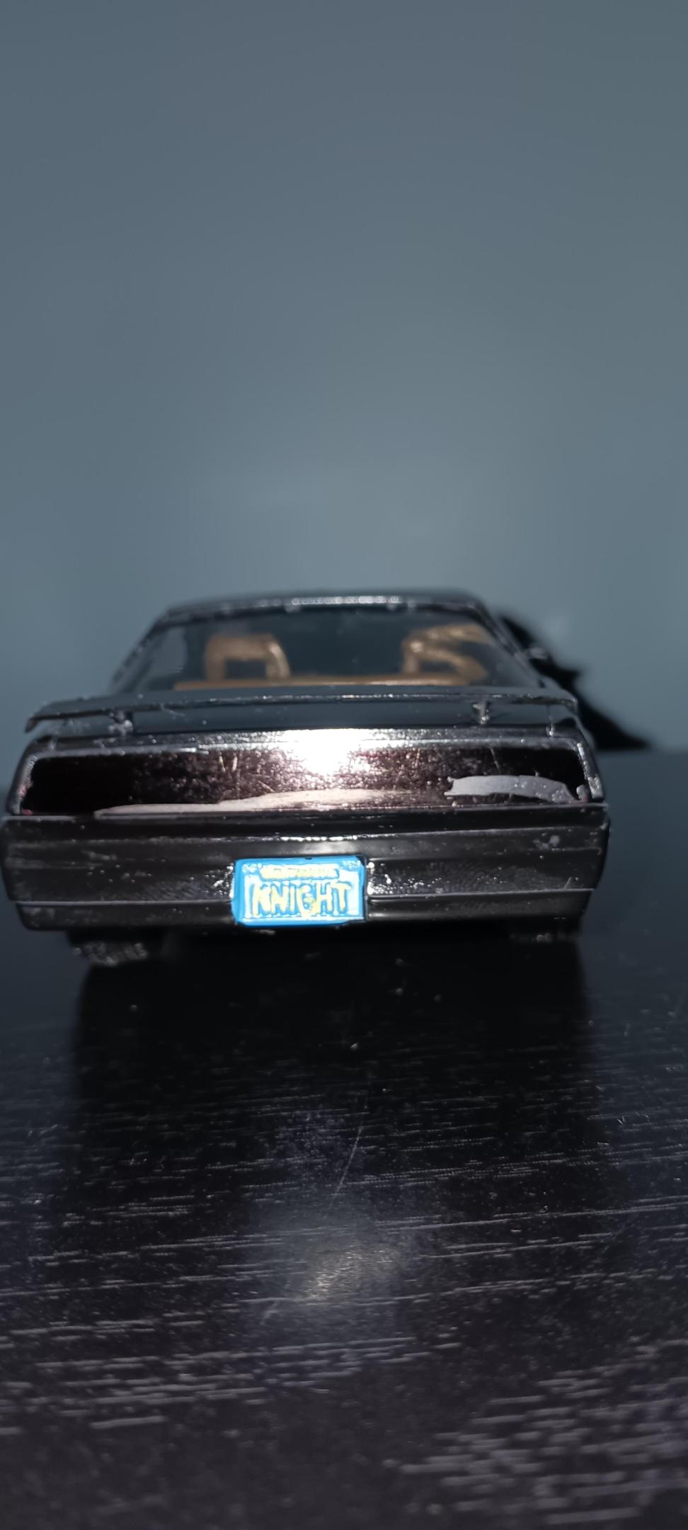 this is a replica of the hero car used in season 1 and 2 I made this using two different original 1/25 scale mpc knight rider models one was almost complete kit that had some parts melted to the tires and a partial glue bomb built up I basically just swaped the body hood and glass from the glue bomb built up with the ones from the almost complete kit the some of the engine bay parts and turbo jet engine came from spare Jada 1/24 scale die-cast KITT I also used the dash decals from it also I scratch built the tow bar receiver that allowed both the hero car the insert car and the back up to the hero car to be attached to a Camera truck so they could film out on the actual roads with the either just David or David and someone else in the car doing driving scenes it is also how you can tell if the car on screen is one of the 3 cars mentioned above or one the stunt cars which did not have the tow bar receiver