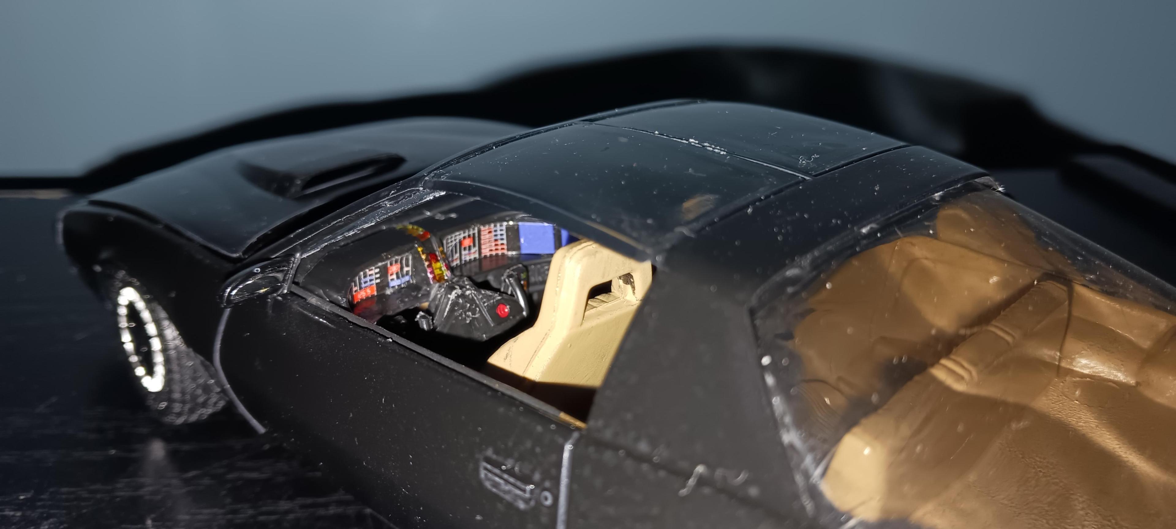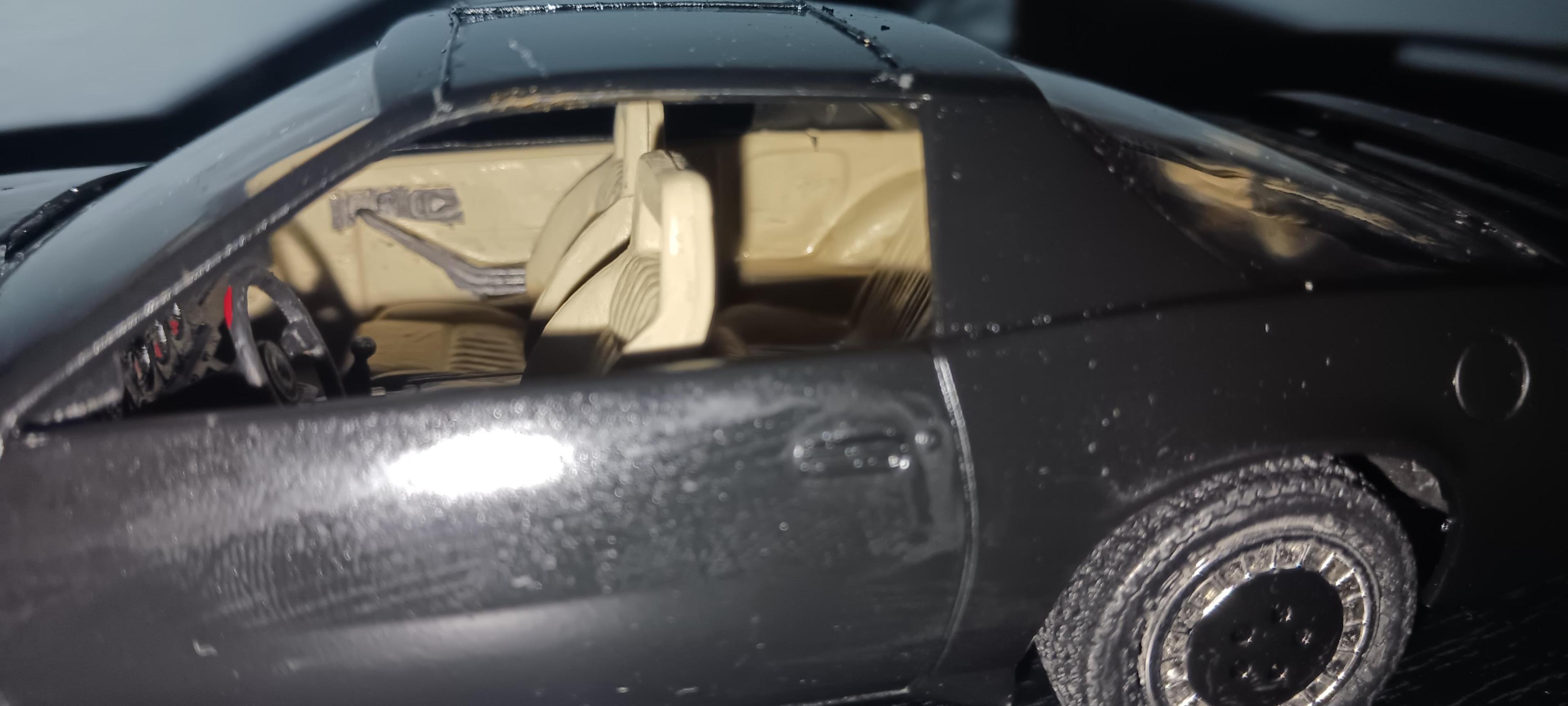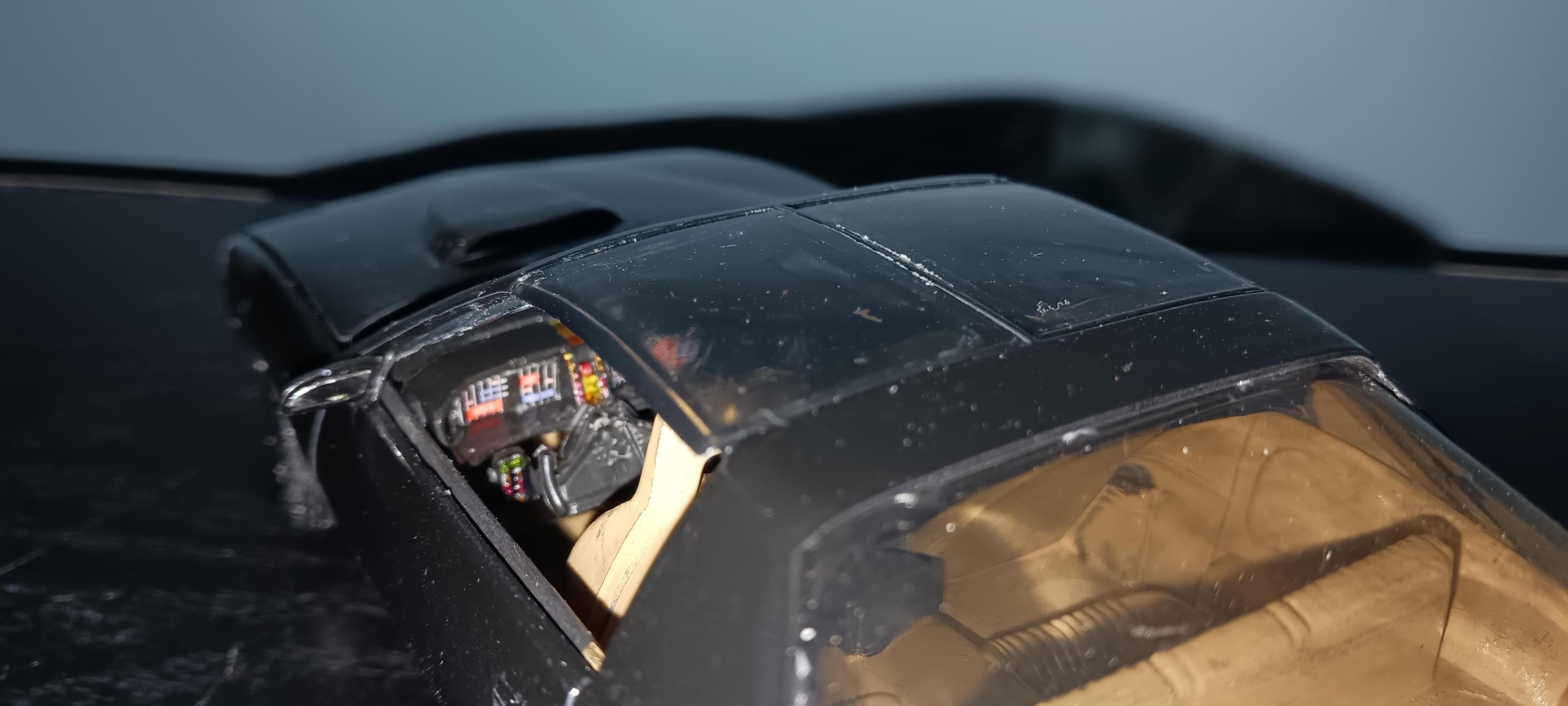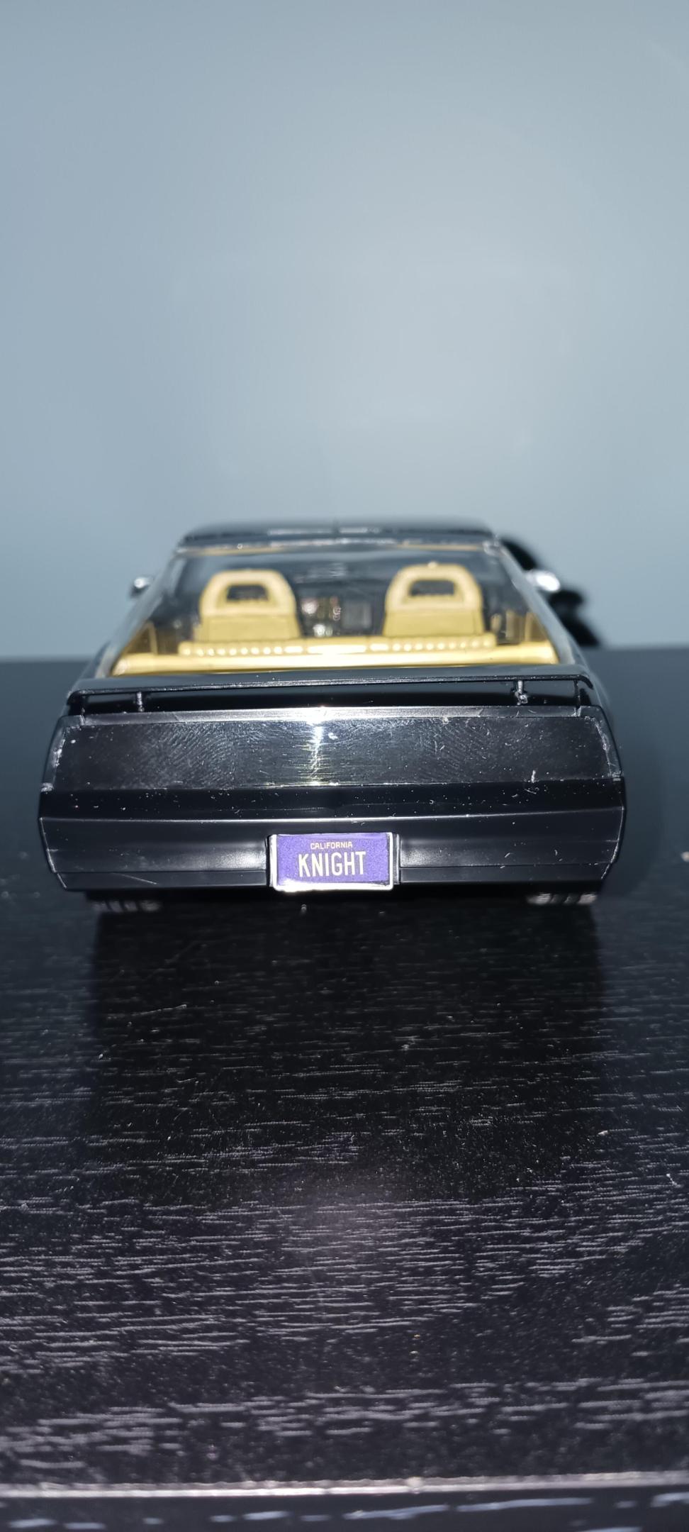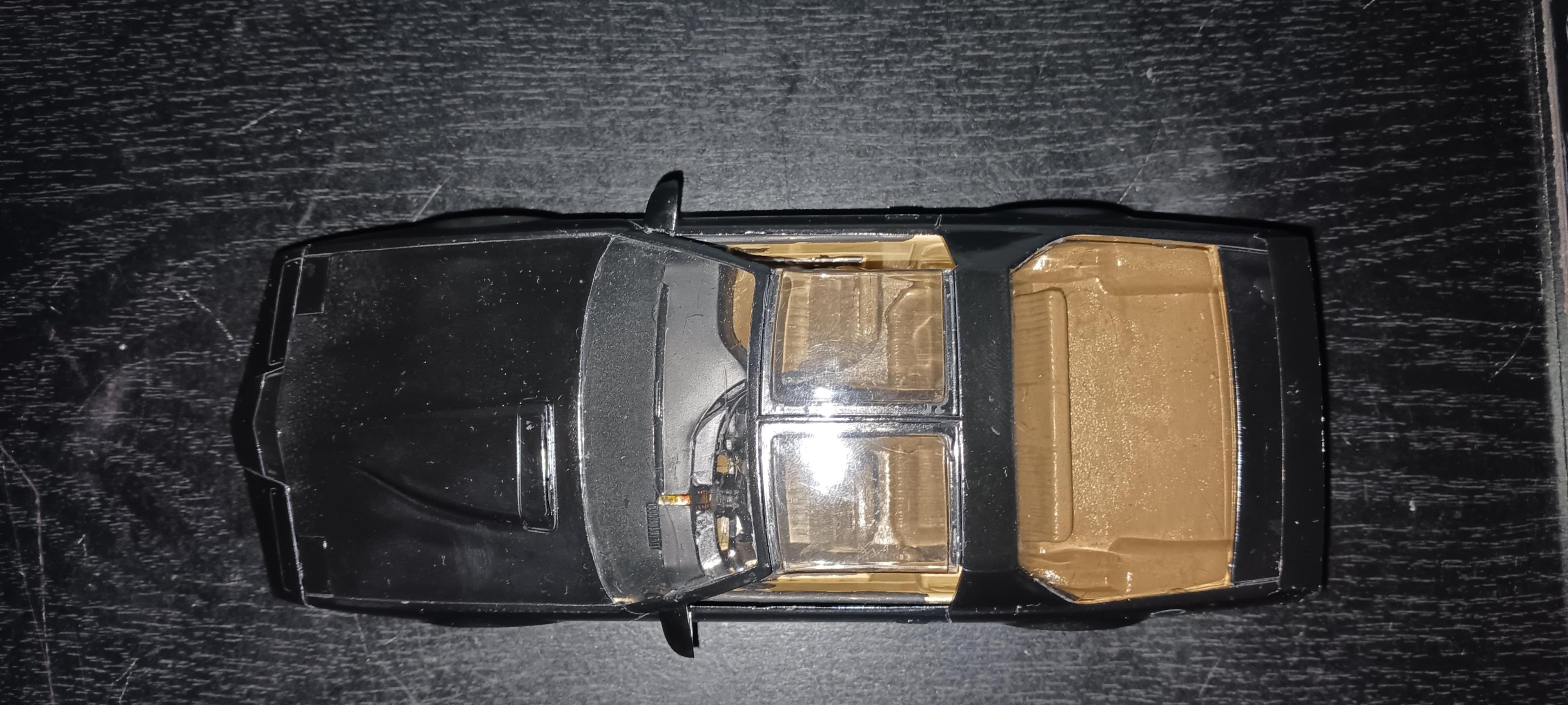 this is a replica of the hero car used in season 1 and 2 I made this using two different original 1/25 scale mpc knight rider models one was almost complete kit that had some parts melted to the tires and a partial glue bomb built up I basically just swaped the body hood and glass from the glue bomb built up with the ones from the almost complete kit the some of the engine bay parts and turbo jet engine came from spare Jada 1/24 scale die-cast KITT I also used the dash decals from it also I scratch built the tow bar receiver that allowed both the hero car the insert car and the back up to the hero car to be attached to a Camera truck so they could film out on the actual roads with the either just David or David and someone else in the car doing driving scenes it is also how you can tell if the car on screen is one of the 3 cars mentioned above or one the stunt cars which did not have the tow bar receiver