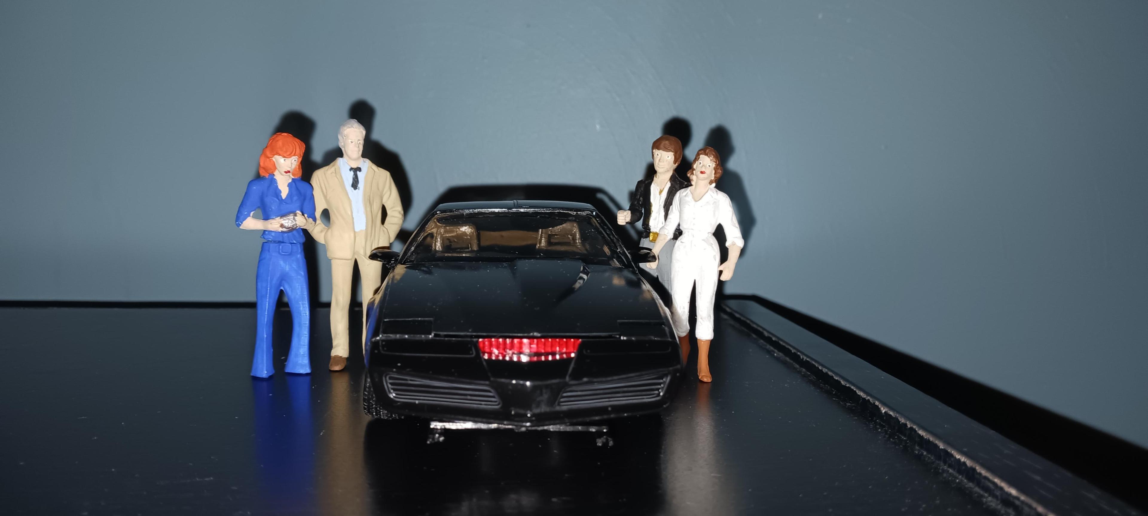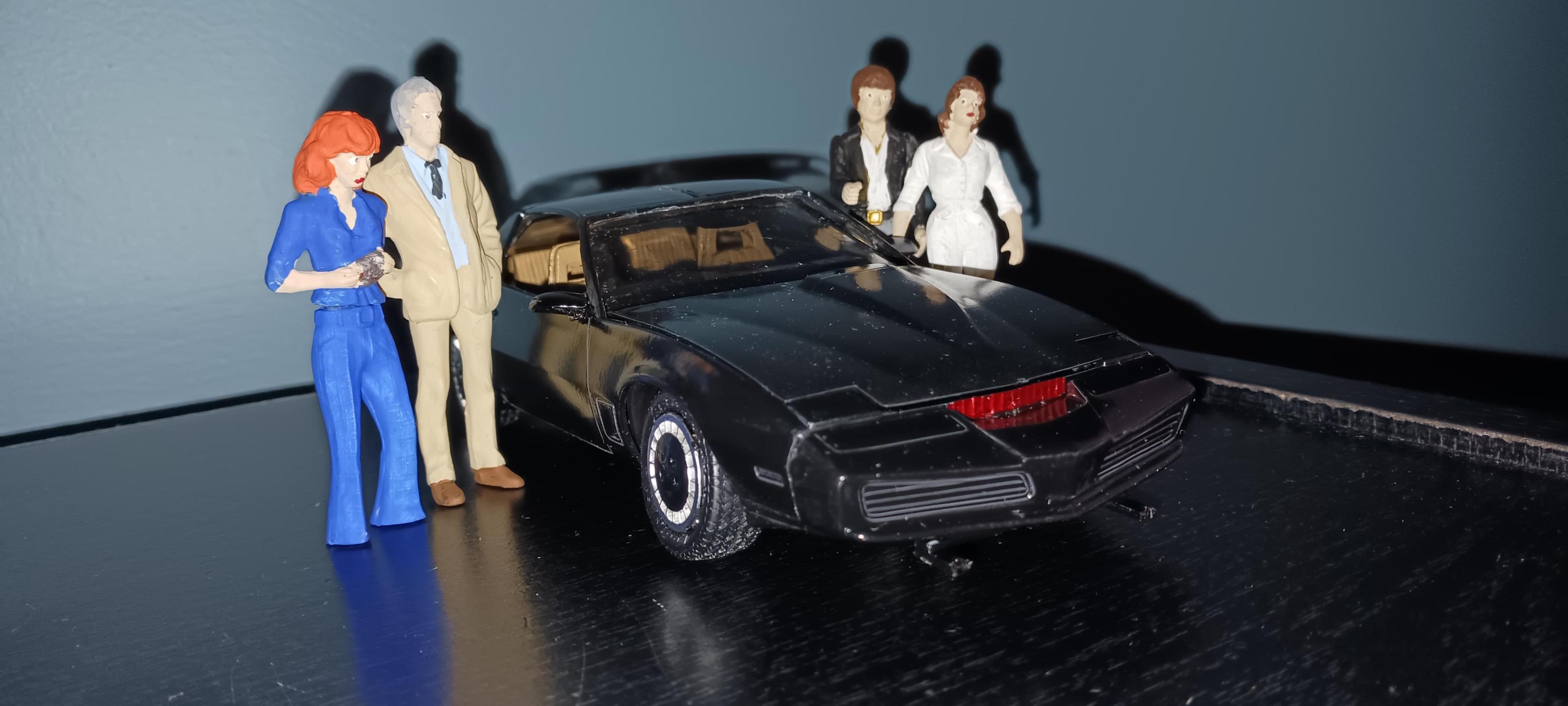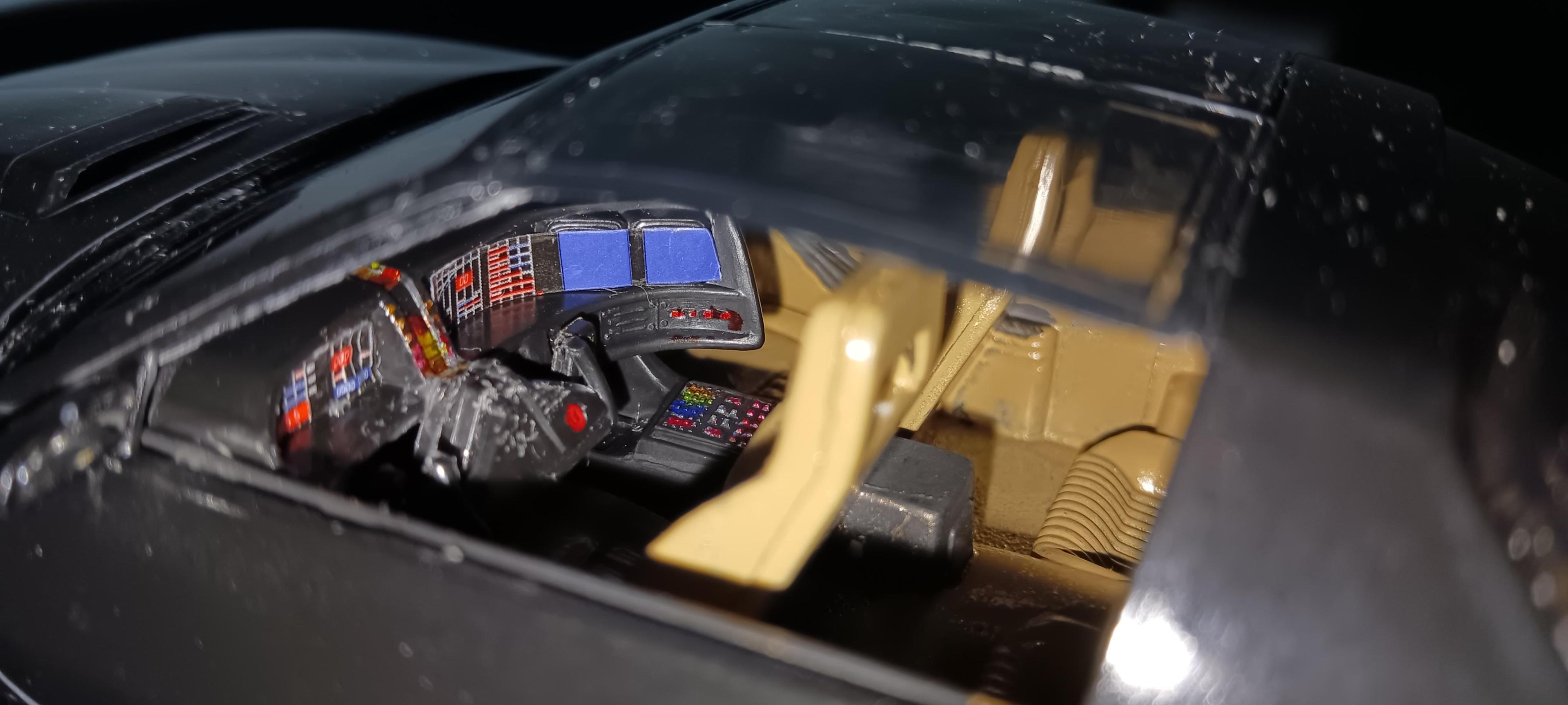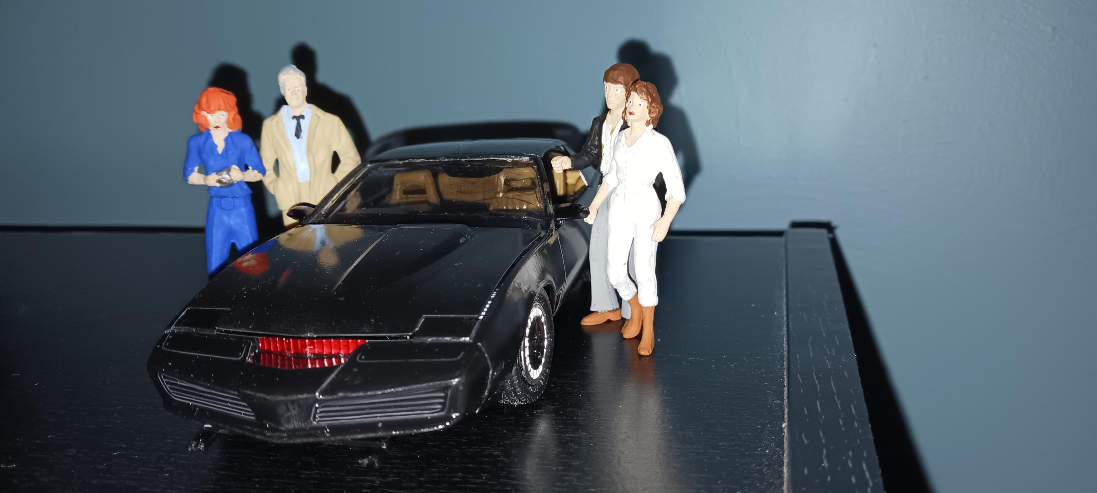 this is a replica of the hero car used in season 1 and 2 I made this using two different original 1/25 scale mpc knight rider models one was almost complete kit that had some parts melted to the tires and a partial glue bomb built up I basically just swaped the body hood and glass from the glue bomb built up with the ones from the almost complete kit the some of the engine bay parts and turbo jet engine came from spare Jada 1/24 scale die-cast KITT I also used the dash decals from it also I scratch built the tow bar receiver that allowed both the hero car the insert car and the back up to the hero car to be attached to a Camera truck so they could film out on the actual roads with the either just David or David and someone else in the car doing driving scenes it is also how you can tell if the car on screen is one of the 3 cars mentioned above or one the stunt cars which did not have the tow bar receiver