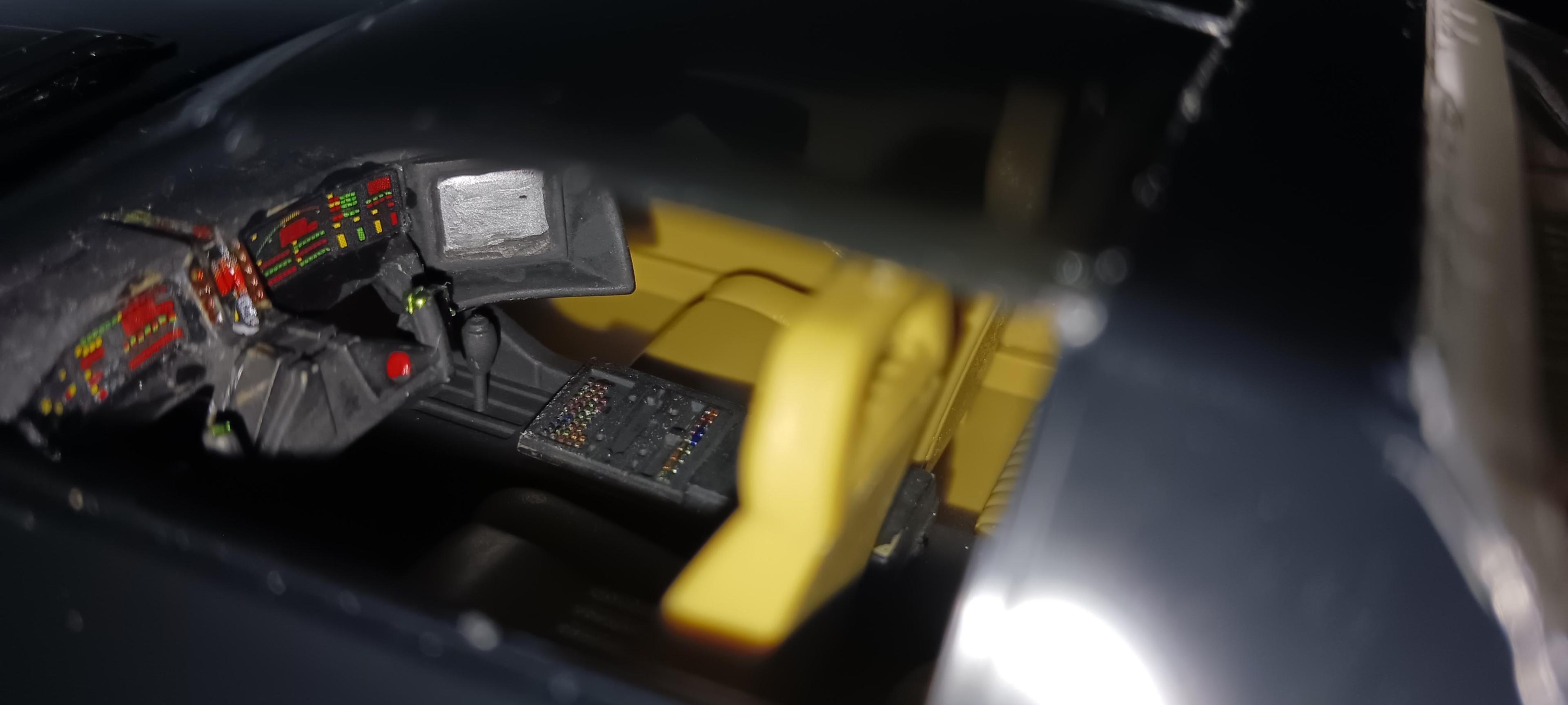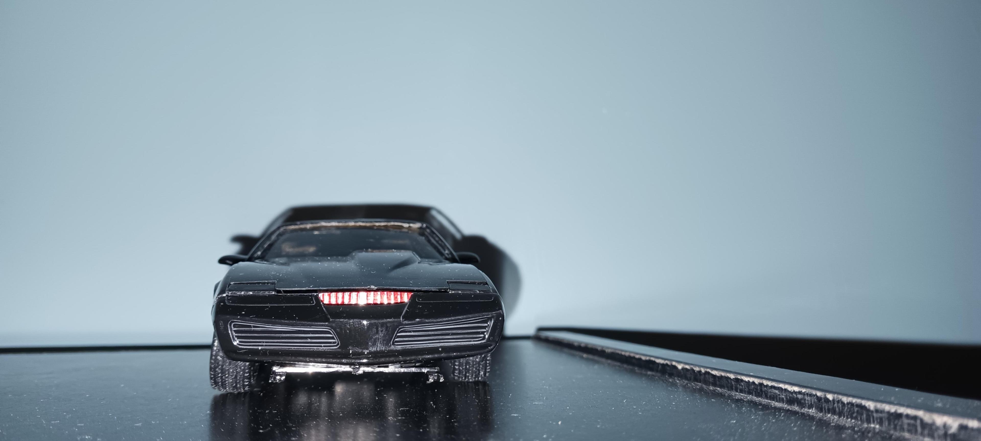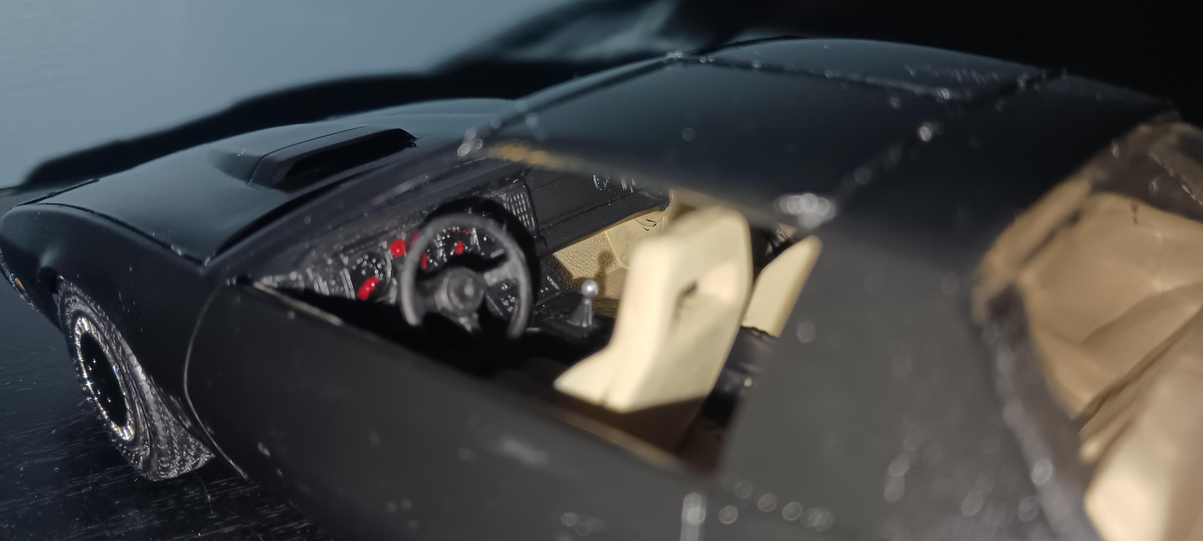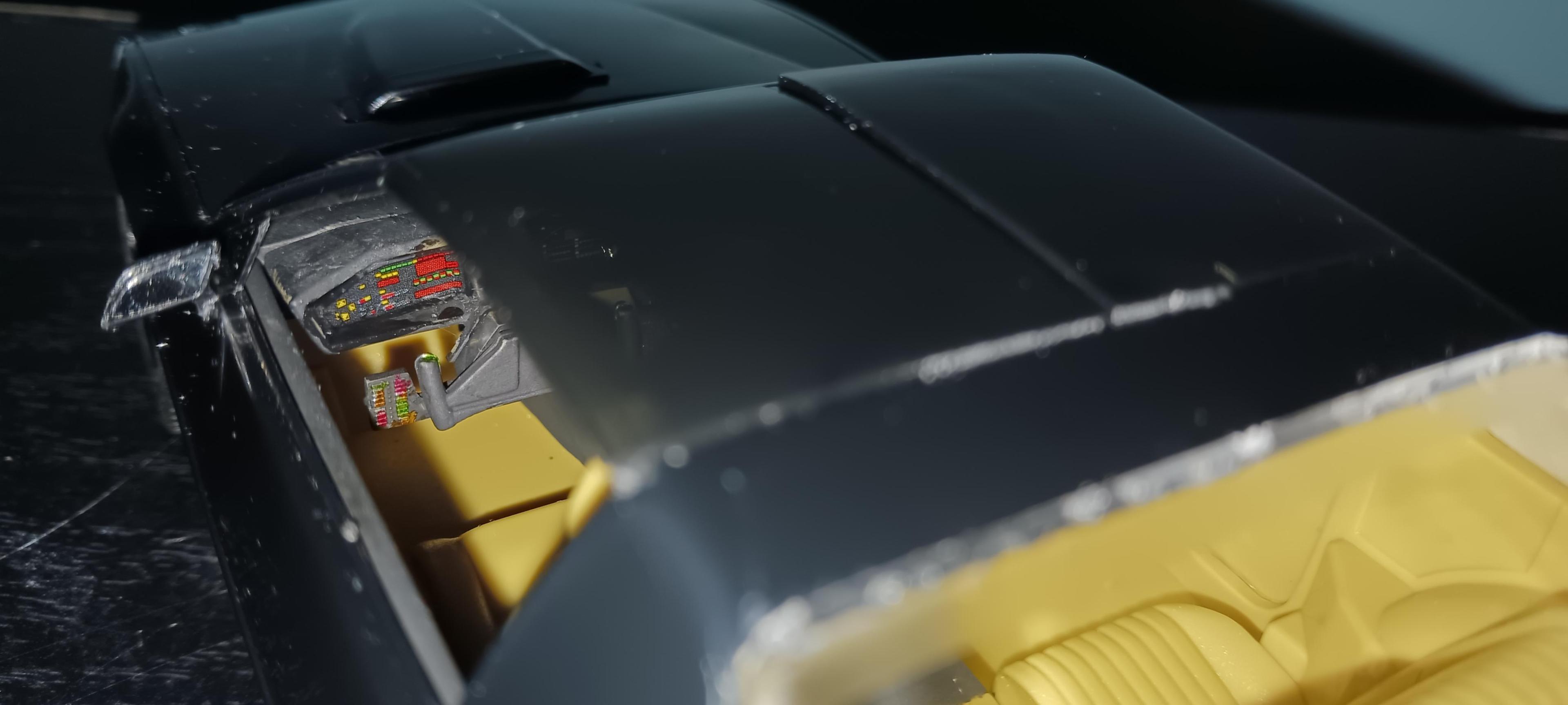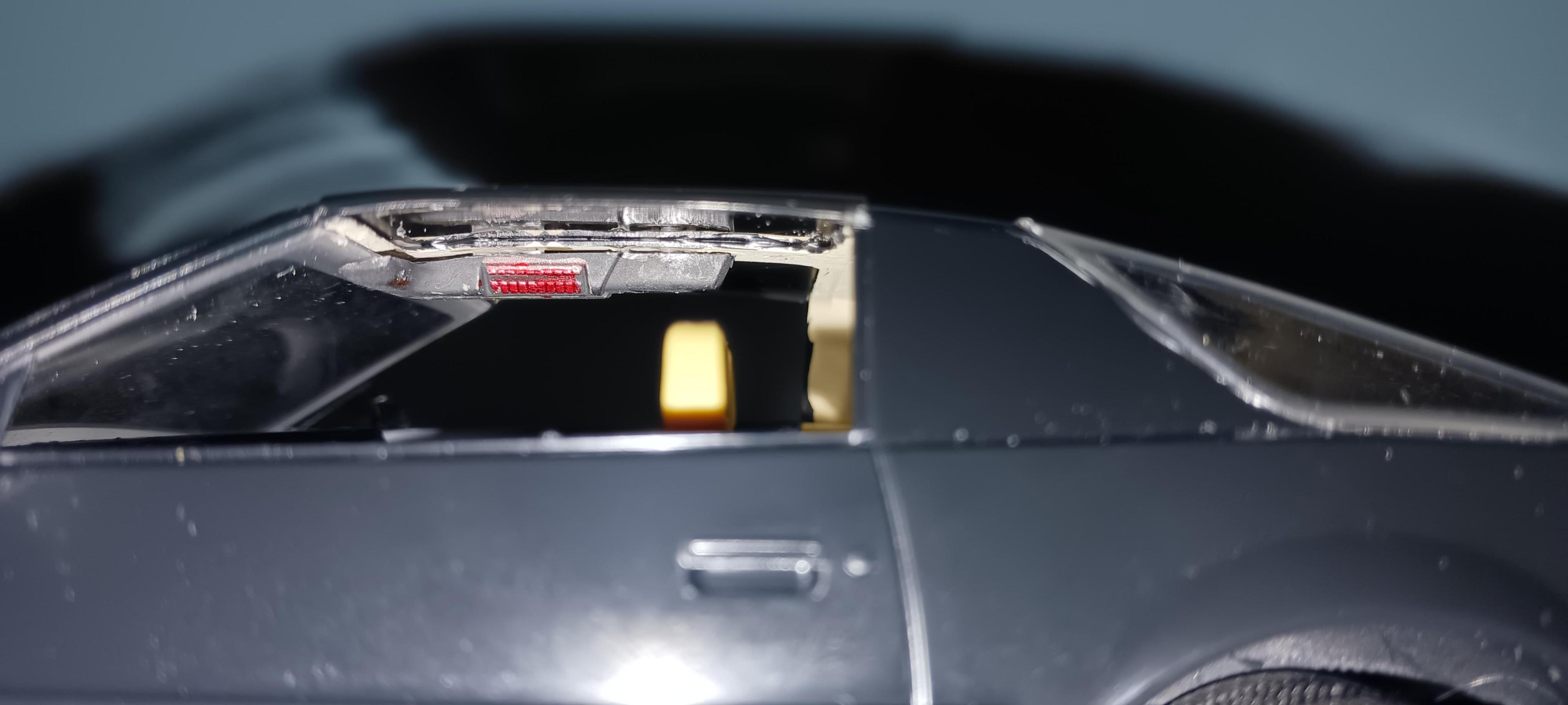 this is a replica of the hero car used in season 1 and 2 I made this using two different original 1/25 scale mpc knight rider models one was almost complete kit that had some parts melted to the tires and a partial glue bomb built up I basically just swaped the body hood and glass from the glue bomb built up with the ones from the almost complete kit the some of the engine bay parts and turbo jet engine came from spare Jada 1/24 scale die-cast KITT I also used the dash decals from it also I scratch built the tow bar receiver that allowed both the hero car the insert car and the back up to the hero car to be attached to a Camera truck so they could film out on the actual roads with the either just David or David and someone else in the car doing driving scenes it is also how you can tell if the car on screen is one of the 3 cars mentioned above or one the stunt cars which did not have the tow bar receiver