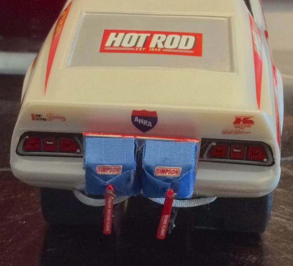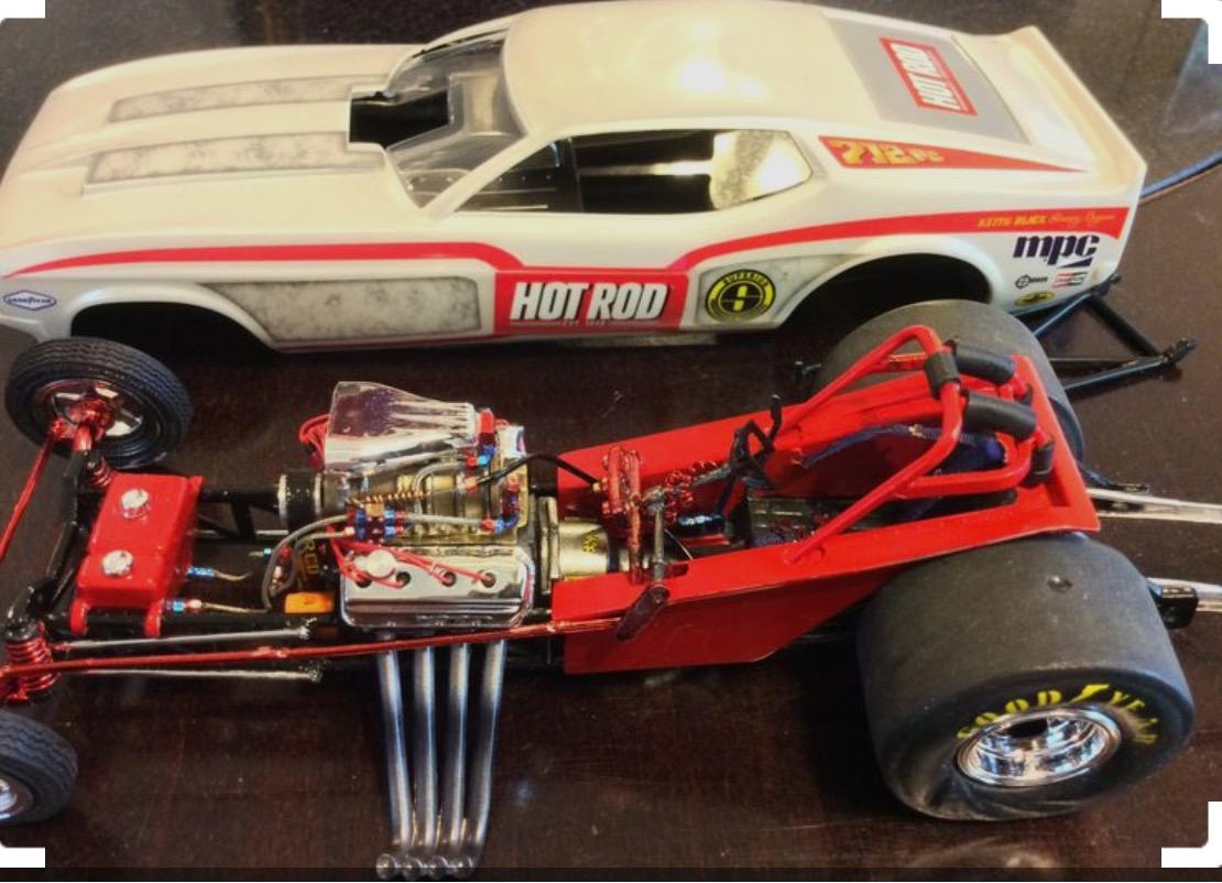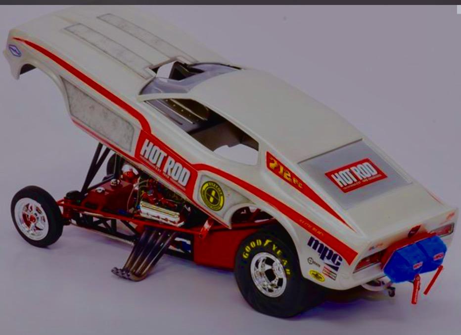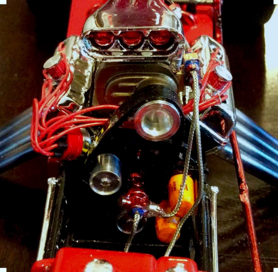 This is constructed from a mix of parts starting with the AMT T body parts pack. The frame is a combination of the double dragster fiat for the back half with front half of the single engine dragster frame. The front axle and spring are left overs from the Atlantis fiat. The roll bar hoop is made of 0.80 styrene rod. The 392 hemi is from the MPC bantam blast kit the headers are actually the hemi injector tubes from a couple of double dragster kits. The rear wheels are some left overs from the AMT 40 Willy’s kit with AMT pie crust slicks. The front wheels are from the MPC Winged Express warped with some spare AMT hollow Firestone supremes . The red paint on the bucket is Testors red enamel with wet look clear. The Tuanna cover is painted with a Krylon red to get a slight contrast. The decals are available from Chris Walsh . I did add the NHRA , and the welded strokers crankshaft decals from a random Slixx sheet. The reference photo is from an early 70’s issue of DRAG RACING USA. Until next time thanks for looking. Mike