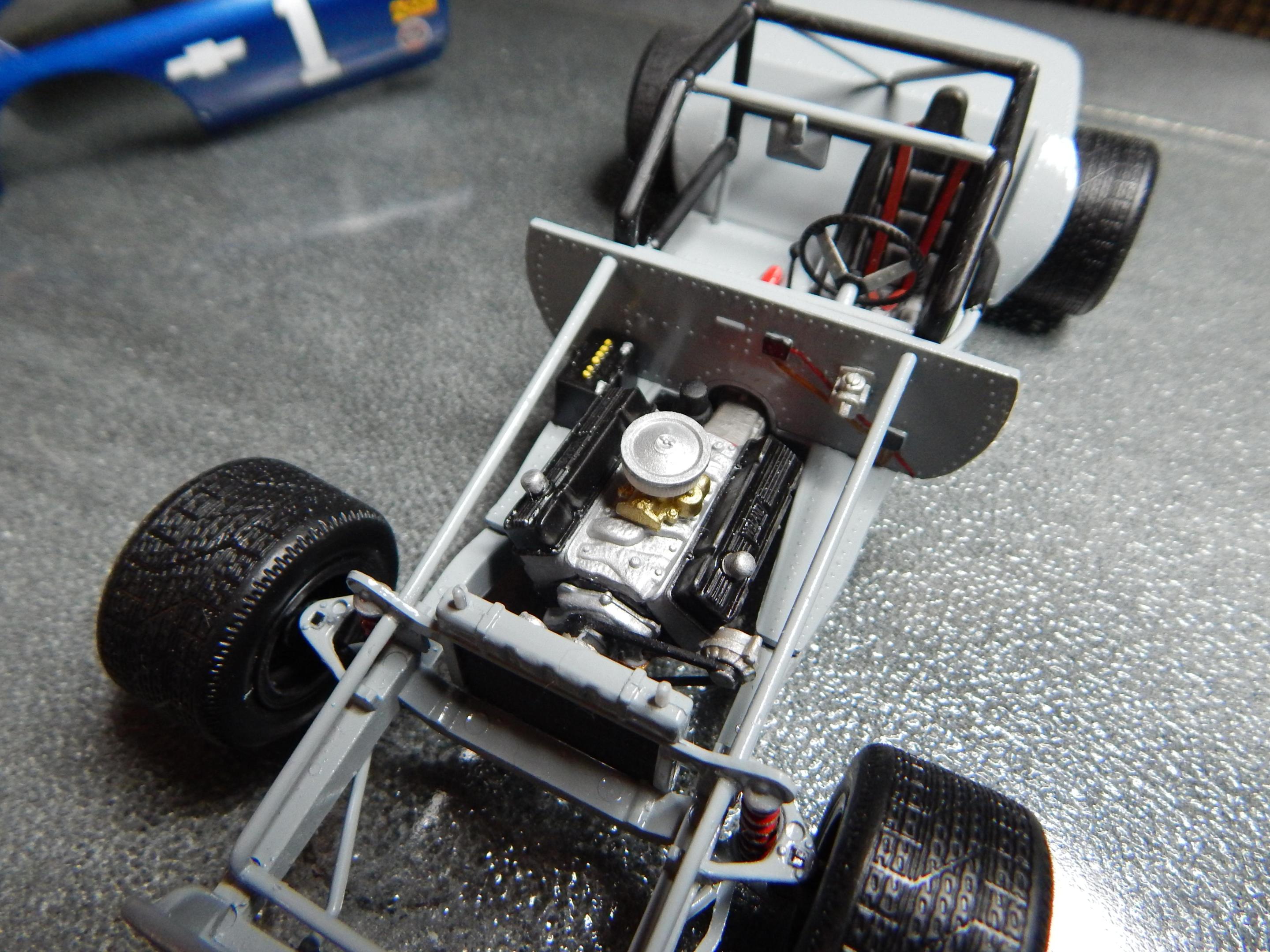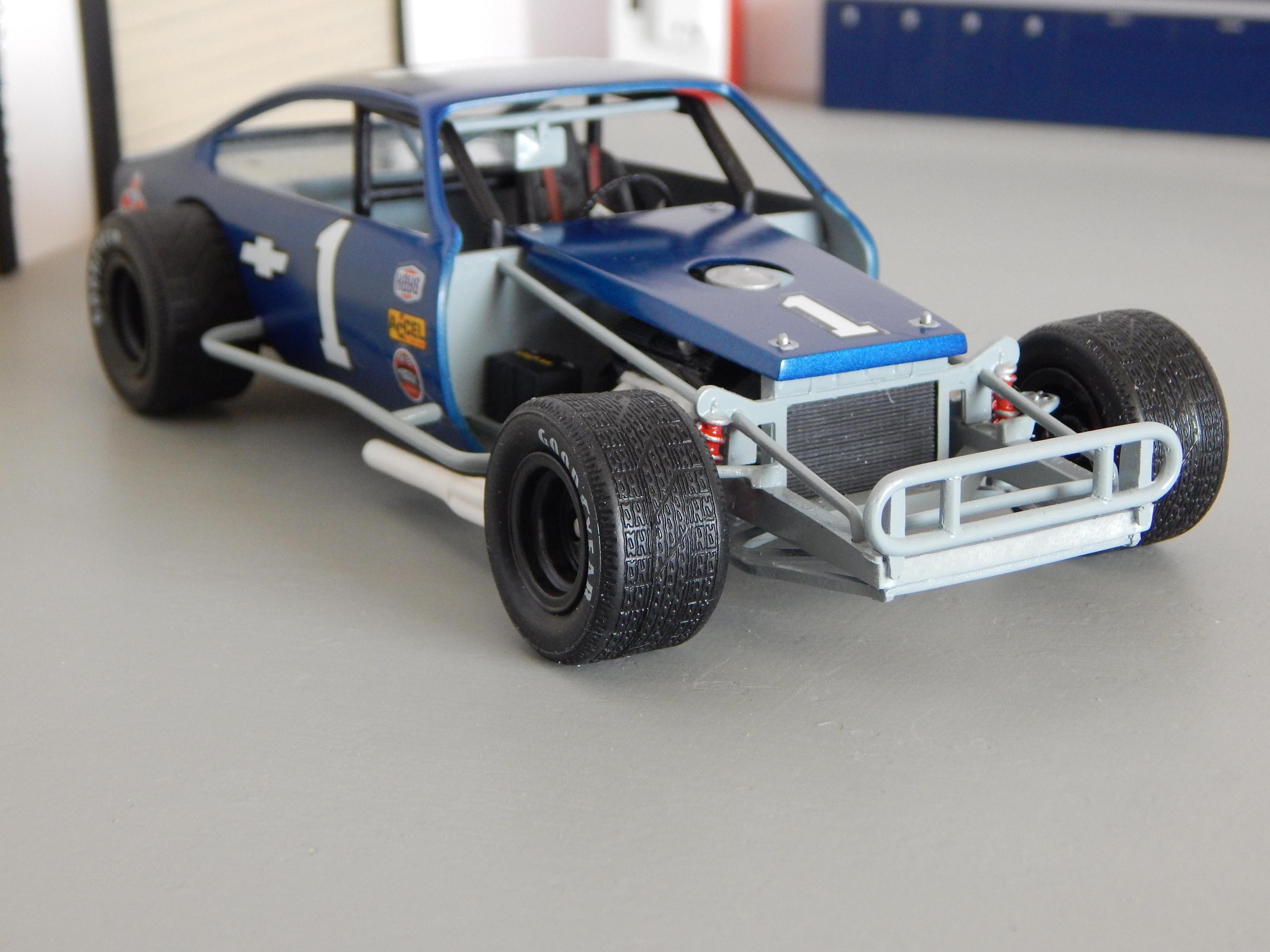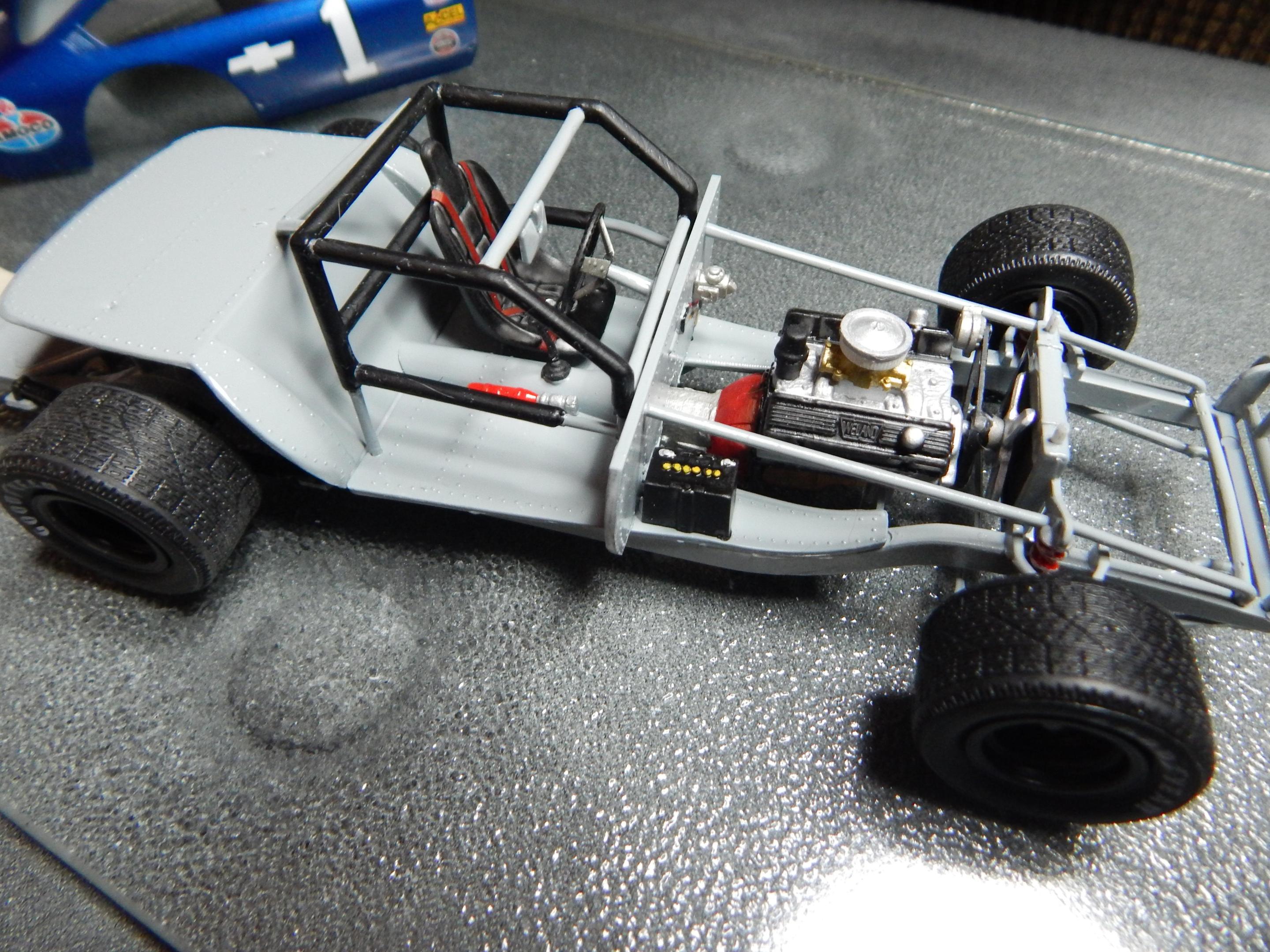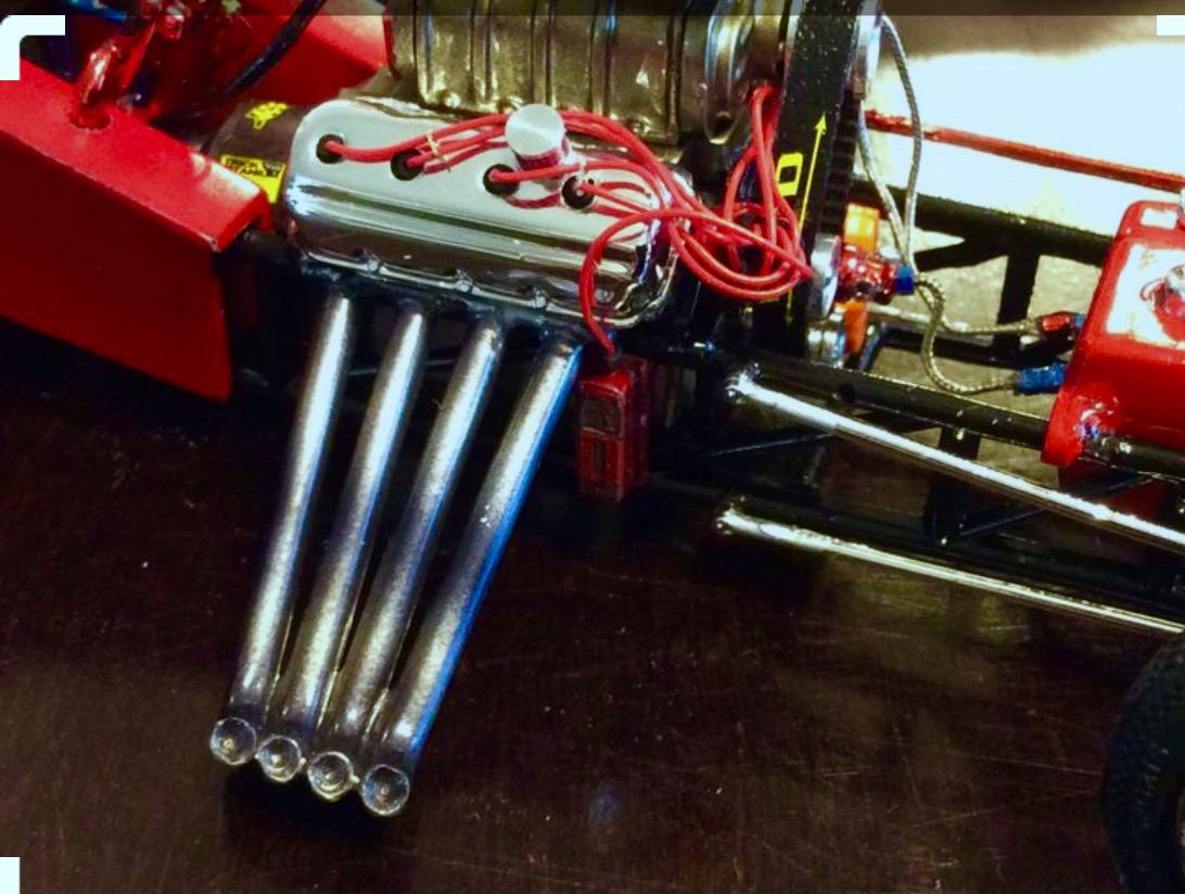 I built this from a combination of the monogram of snap kit that I found on eBay for real cheap. I used the interior and the chassis plate along with the wheels and tires from the grumpy’s toy pro stock Vega . I cobbled together a small block mopar engine from my parts box I also used the tunnel ram and carburetors from the grumpy Vega the headers are fabricated from sauder and aluminum tubing.The only body modifications made were cutting out the side window panels that were behind the door windows and adding a hood scoop also from the grumpy Vega donor kit .the chassis plate also had to be cut and shortened I made the window net from some old window screen.At some point it the future I will have to go back and add the radiator . I gave it a testors paint job of white and red enamel with star spangled blue lacquer all topped off with wet look clear. The decals came from slixx. Overall this was a very easy kit bash project Until next time thanks for looking, Mike