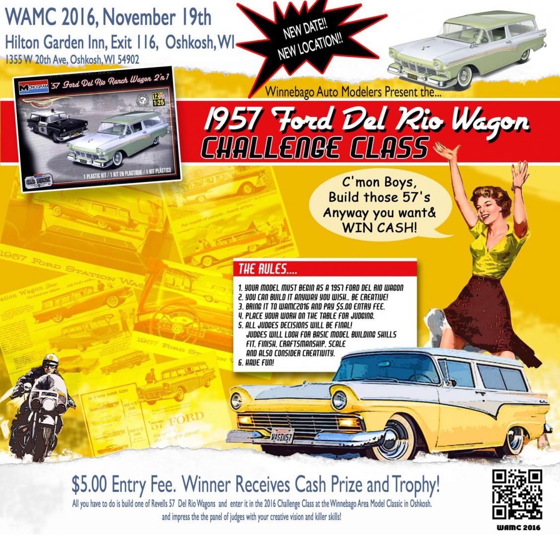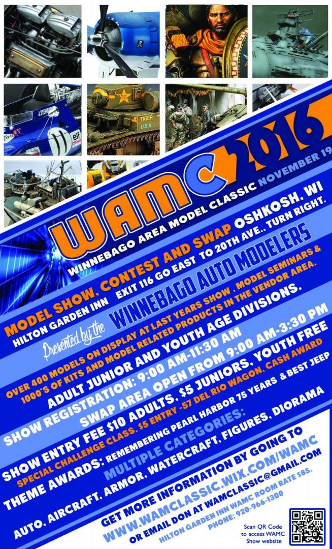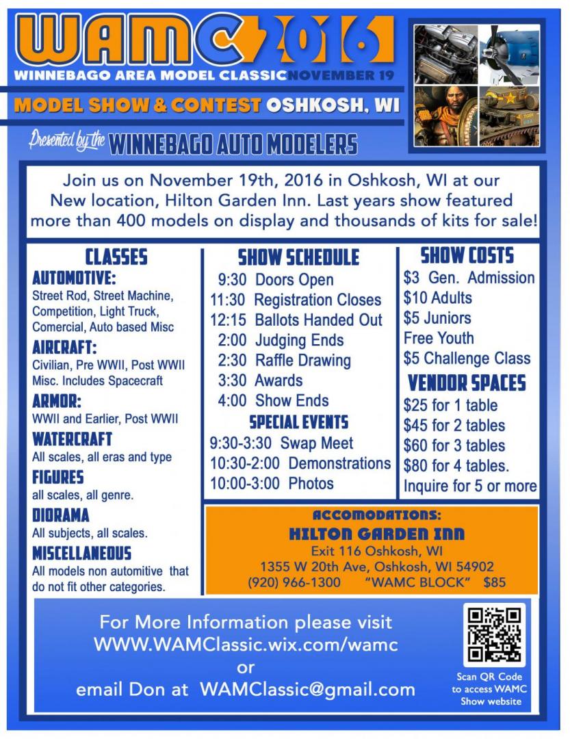 November 19th, Oshkosh, Wisconsin Winnebago Area Model Classic (WAMC) 19th year presented by Winnebago Auto Modelers Oshkosh, Hilton Garden Inn, 1355 W 20th Ave, Oshkosh, WI 54902 For more information, contact Don Molitor by email at wamclassic@gmail.com or visit our website. http://wamclassic.wixsite.com/wamc We accept all genres of models. This year we have special Custom Designed awards Best Jeep (75 years) and Best Pearl Harbor Subject (remembering 75 years) Best Paint (sponsored by Bob's Paint) Top Seven We also have our Challenge Class for the 1957 Ford Del Rio which has a cash prize for the winner! We also have a swap meet going on at the show, please join us.