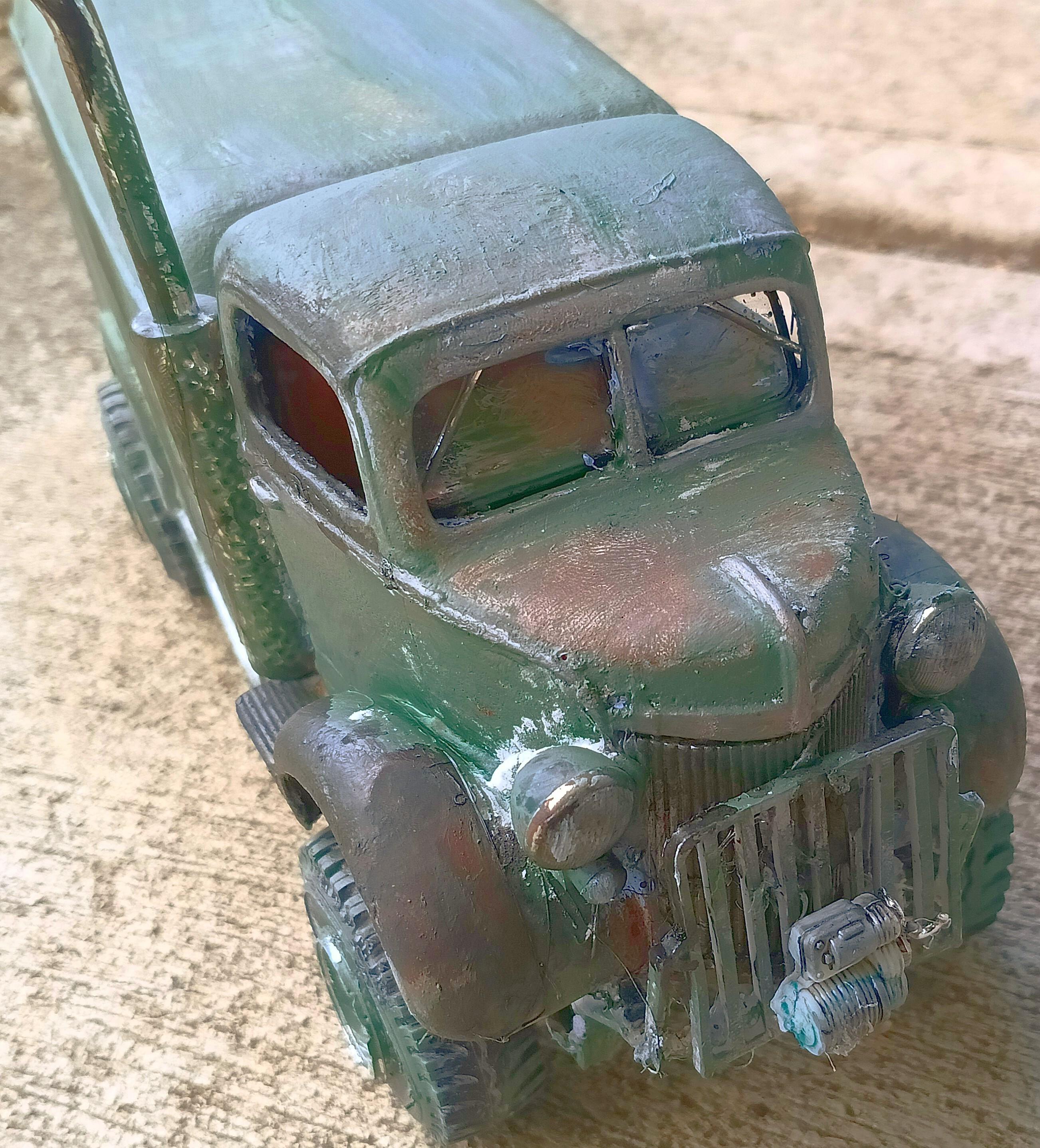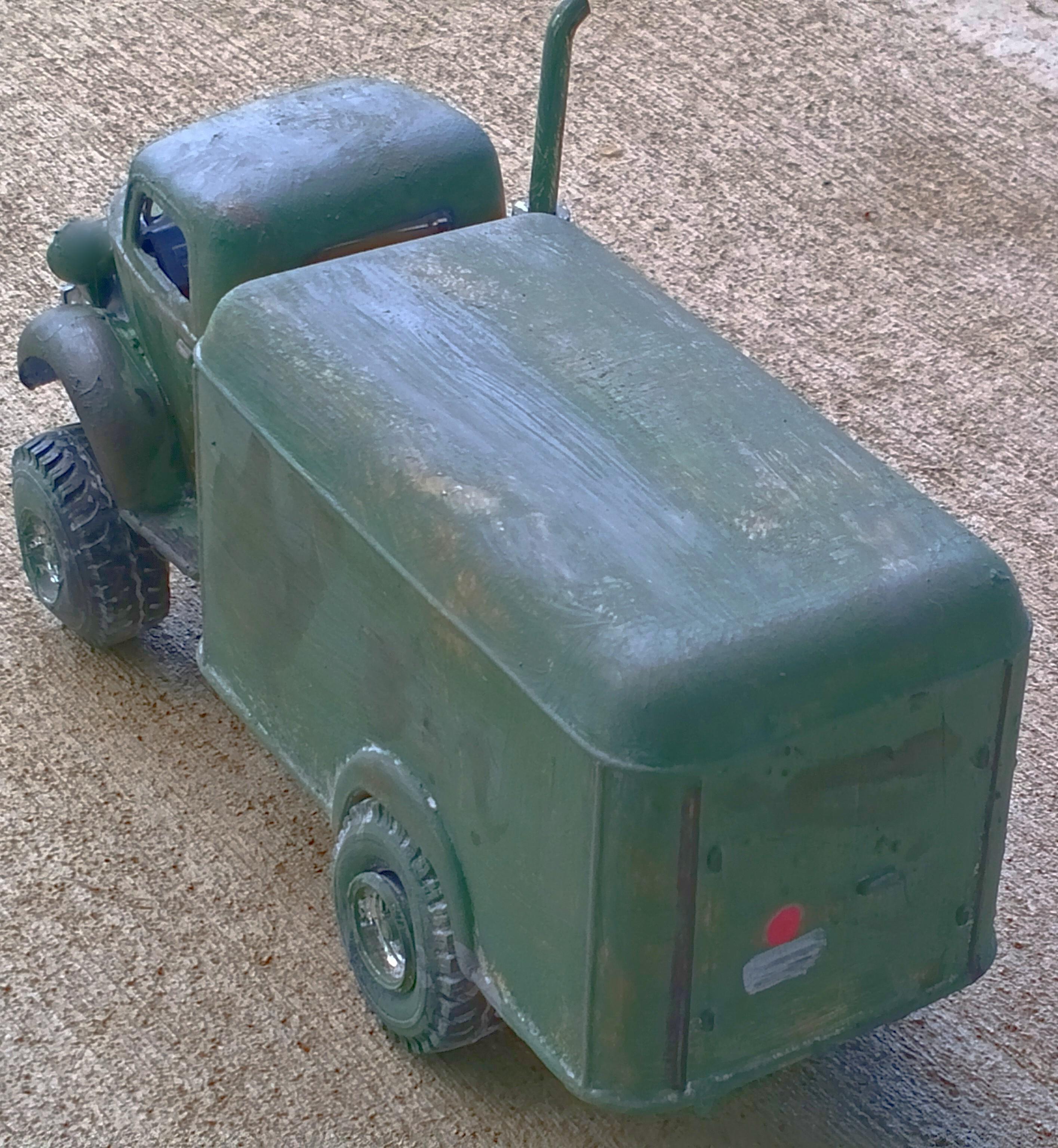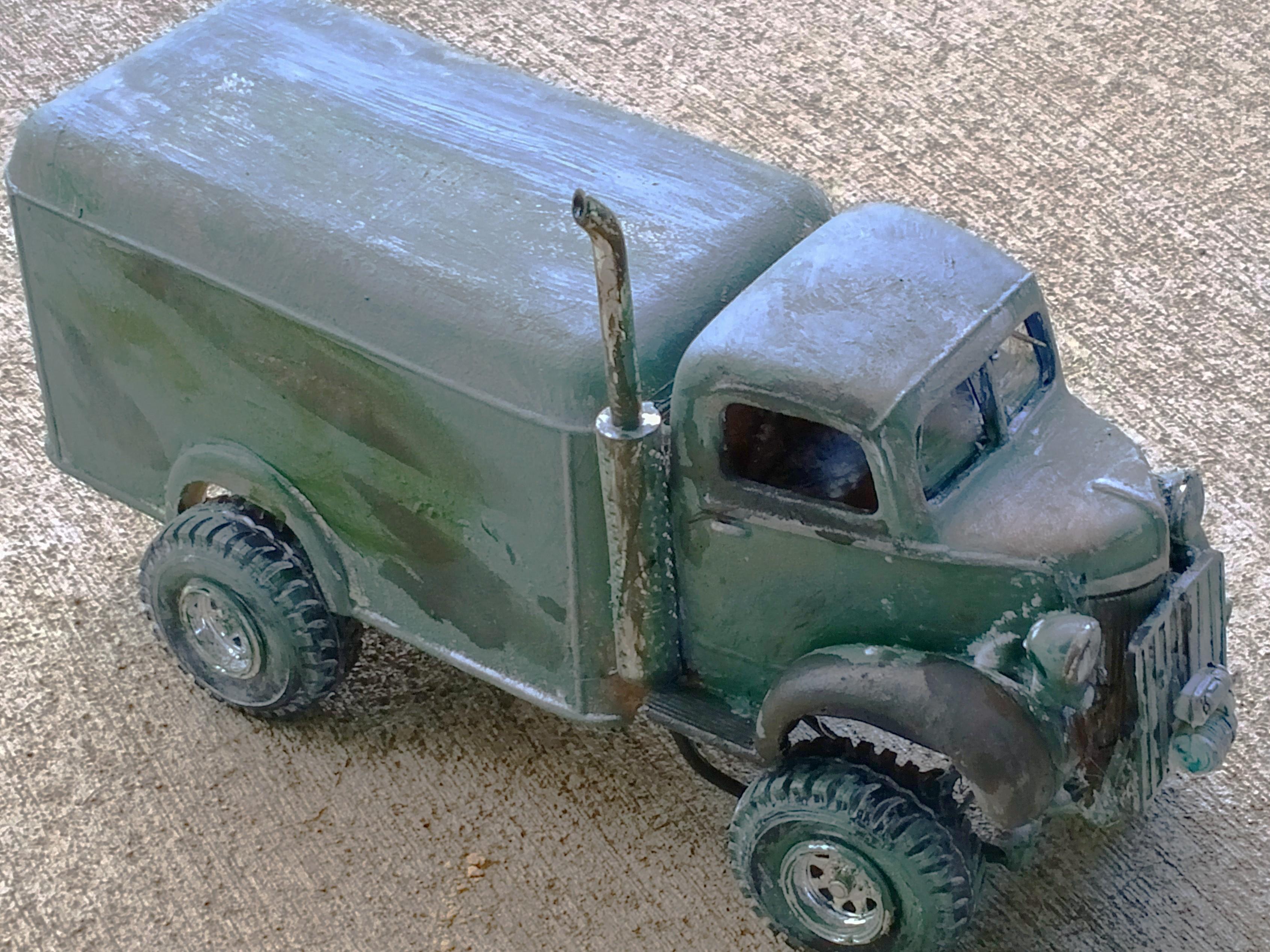 Kitbashed with Flintstone resin cab/box, weathered and built from spare parts. While the 1/1 Jeepers Creepers truck was a GMC, I had this Ford cab so chose to build a tribute like some Halloween or horror fans might build in real life.