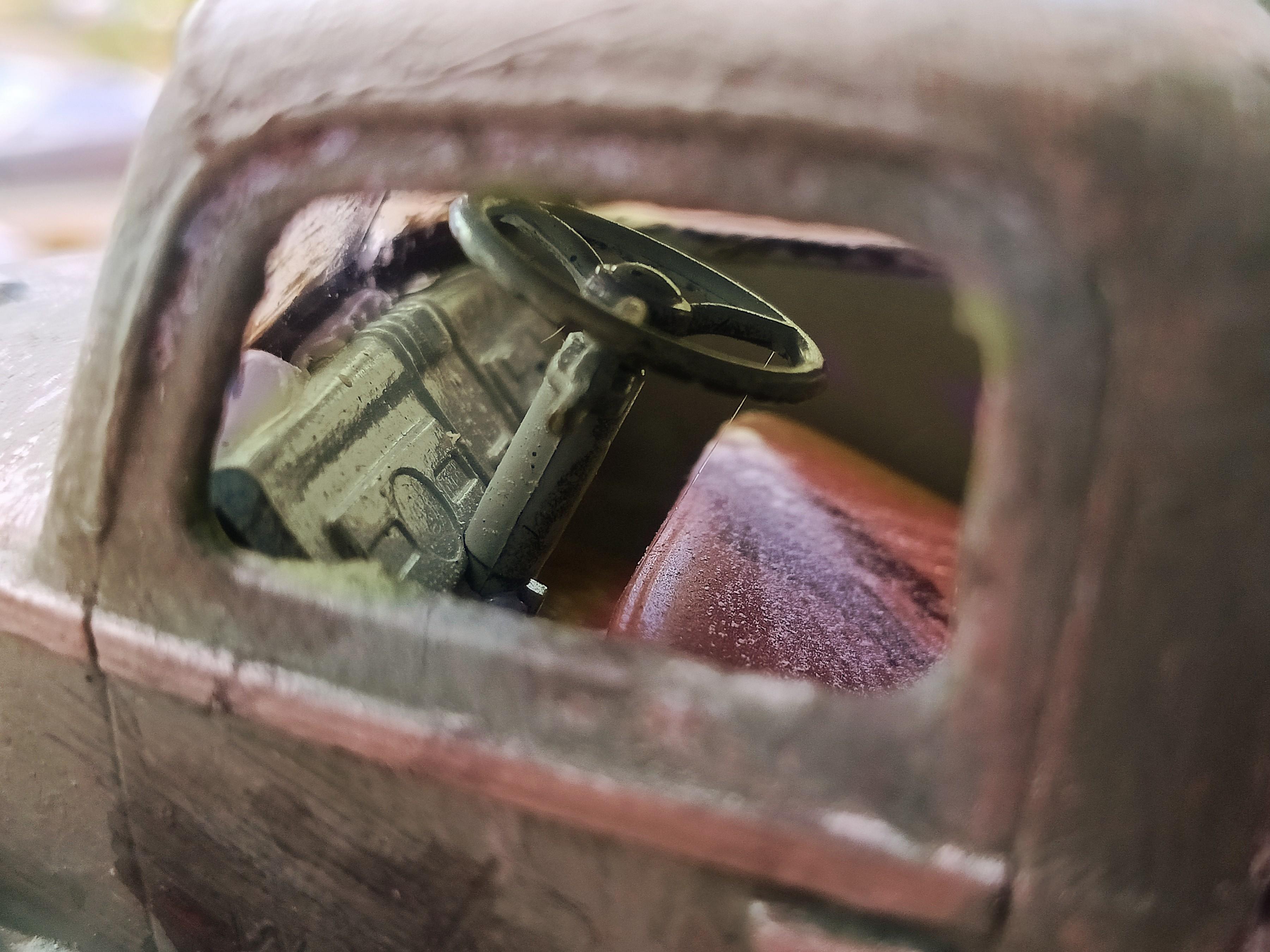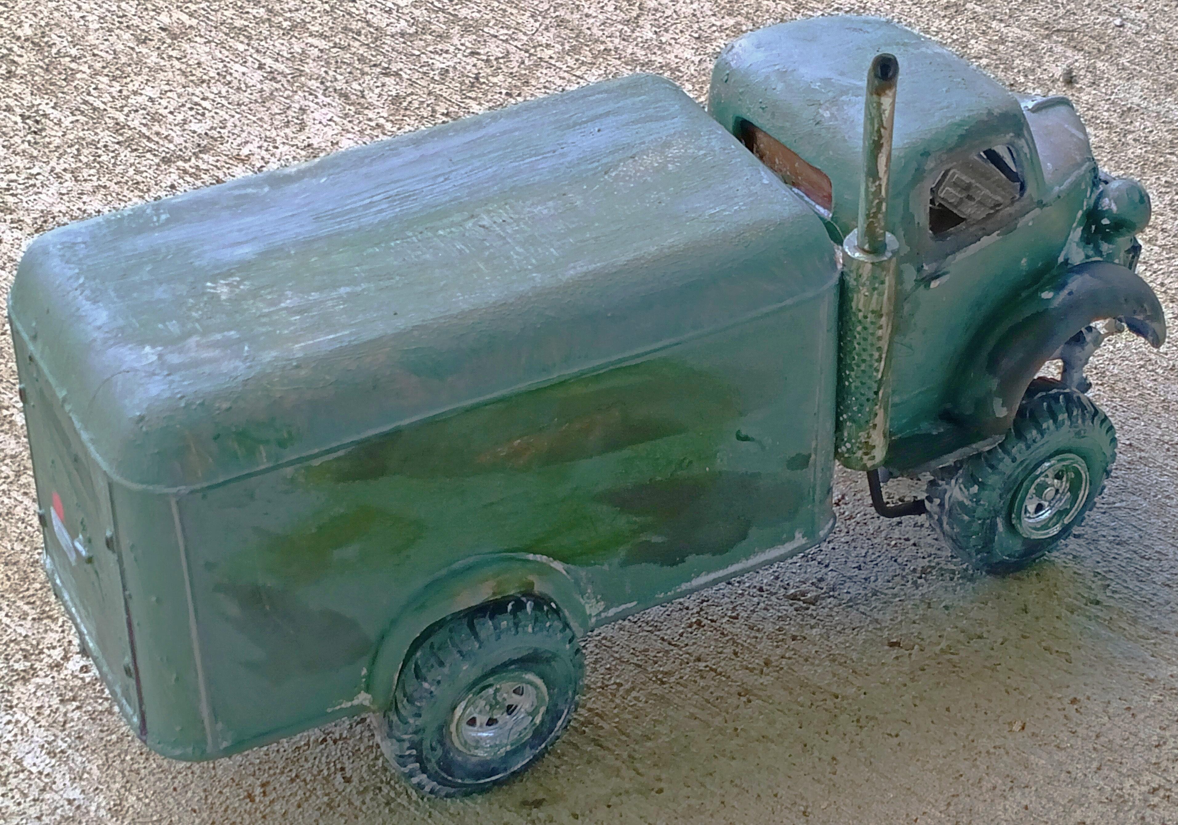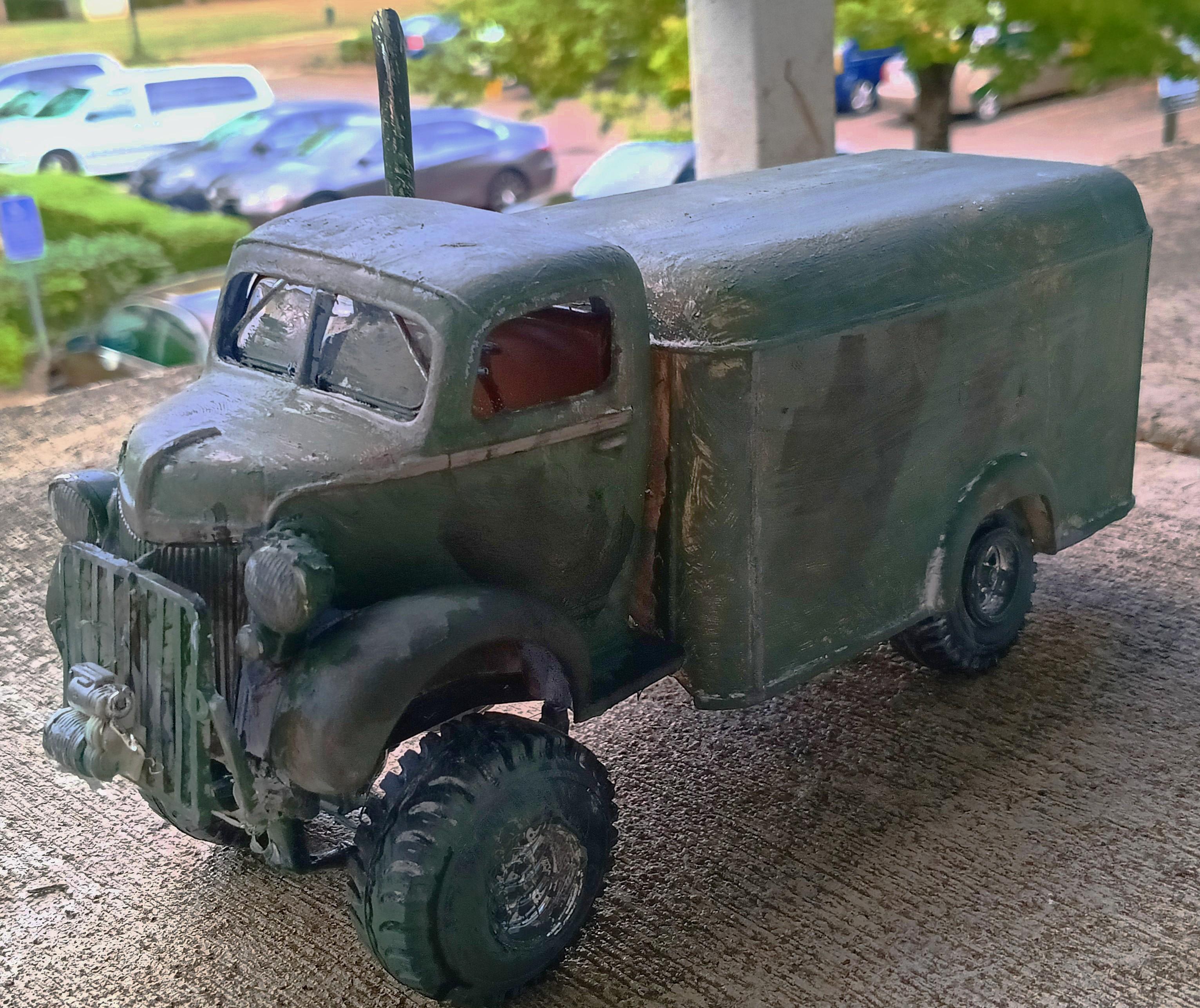 Kitbashed with Flintstone resin cab/box, weathered and built from spare parts. While the 1/1 Jeepers Creepers truck was a GMC, I had this Ford cab so chose to build a tribute like some Halloween or horror fans might build in real life.