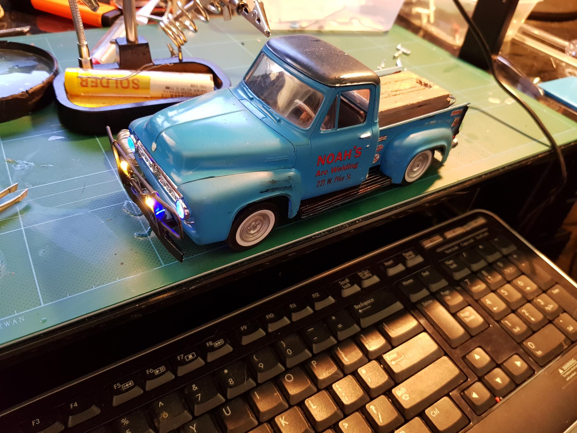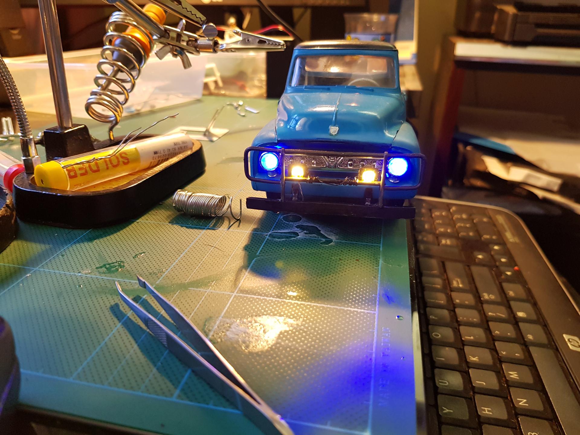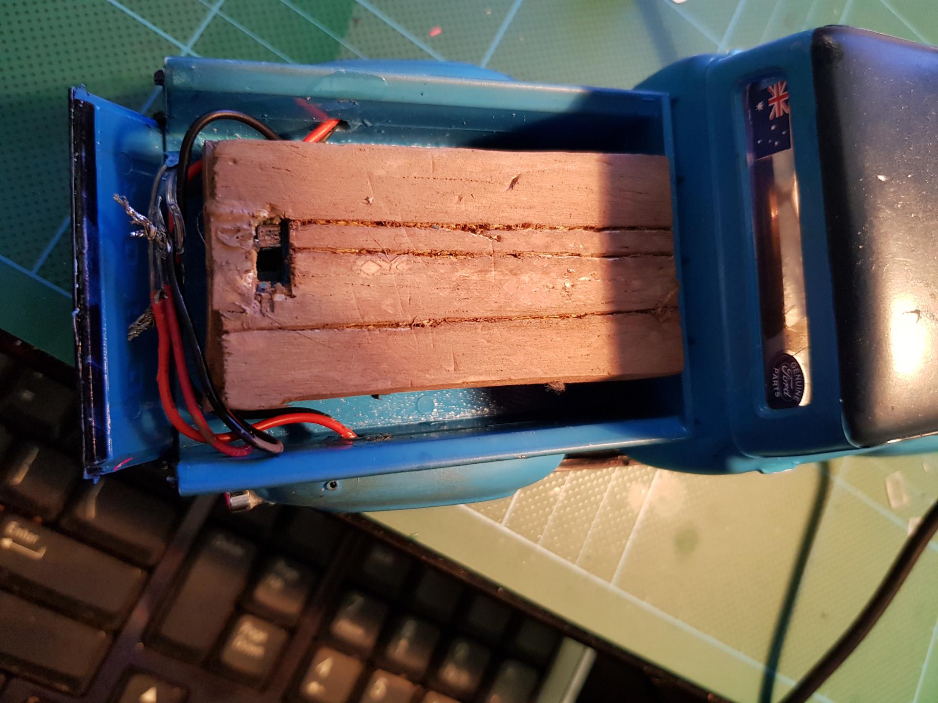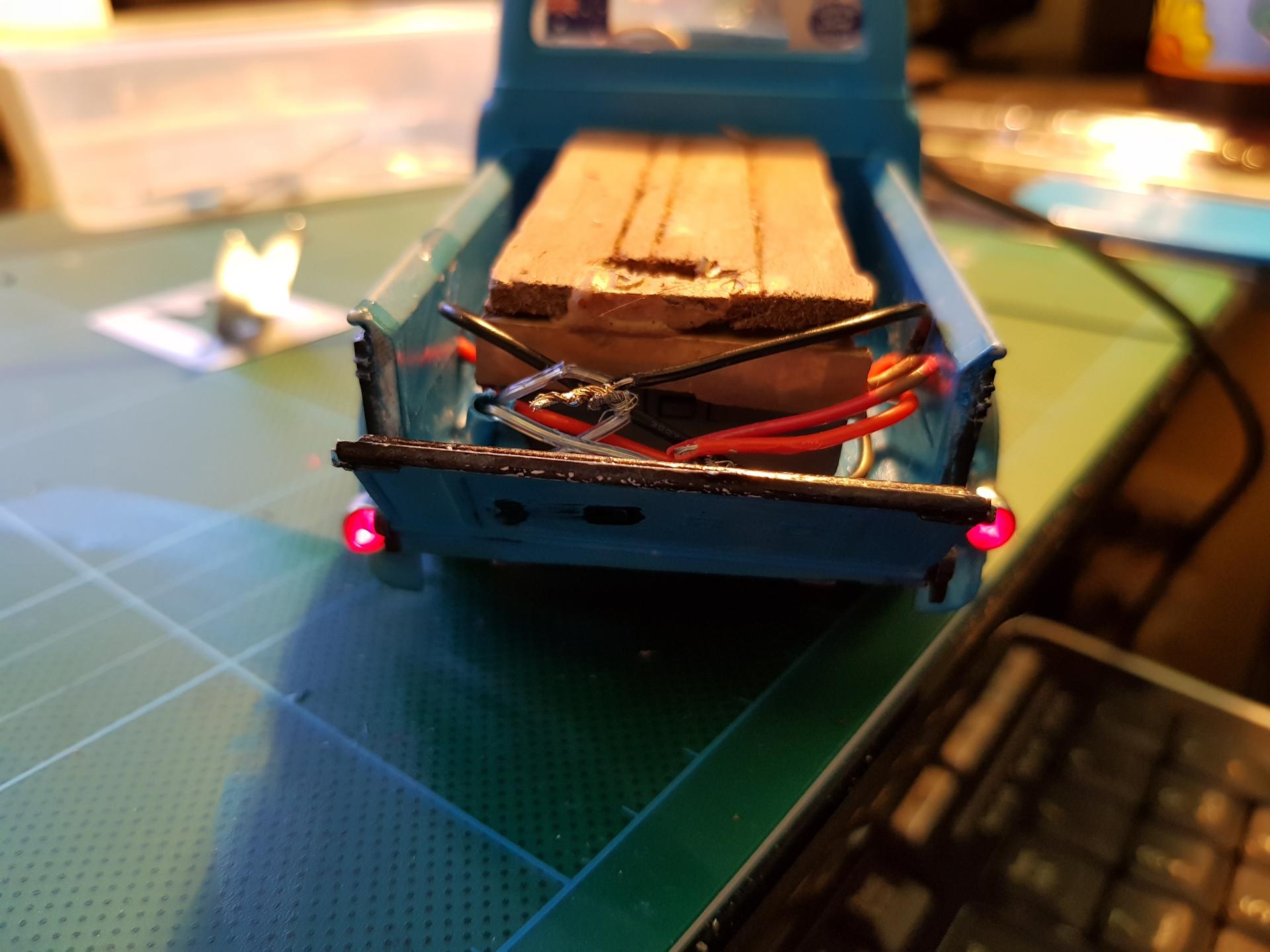 First time poster and newbie. Here's my attempt; it''s rough but it's a work truck. I'm really happy with my first attempt at lights, I learnt a lot and next time would use smaller batteries, next gen LEDS. I tried to disguise the battery box as a crate; as you can see I need to hide the wires. It was my first time soldering as well, I'd like to try some sort of circuit board next time. Anyway gentle with the constructive comments. Dave. P.S. Notice the Australian flag in the left hand bottom corner of the rear window. D.