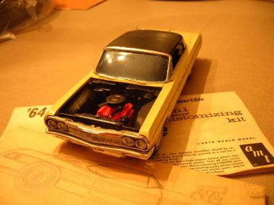 Next month I will have had this model in my possession for 50 years. This model is not a contest winner. It's not even a rare kit, except it's the AMT 1964 Impala convertible version that has never been re-issued since 1964. However, it is the oldest kit that I have and built by me when I was 9 years old. I got it on a trip to the North Shore Mall in Peabody, MA from a store called Jordan Marsh. I remember having lunch with my mother and playing with the parts while waiting for the food to arrive. This was August of 1964. Originally, it was brush painted testors turquoise on the body and white top. The lights used to work, but no more. I glued the up top on and probably used too much glue around the windshield. I rebuilt it in the early '70s. It was kind of a mess. The glass didn't come out easily. I ruined the cowl and the windshield frame and visors. The 409 engine lost pieces. I went to the local 5 & 10 where they had the 1969 re-issue of the '64 Impala. It was gone. They tried to get another, but no dice. I repainted and glued the convertible back together as best as I could. I was stuck with the up top and I decided to tint the windshield to hide the glue marks. I don't know where I found a '65 Chevelle wagon, but I robbed the 327 V8 and stuck it in the engine compartment. I painted it a gold lacquer color like the Chevy Autumn Gold. AMT's T408-225 '64 Impala kit arrives after I fixed this old convertible in 1972. Before that, it was about impossible to find a '64 Impala kit. Speed up to 1990 and this old Impala convertible was rebuilt again. This time I decide to make it look like a brand new Chevy I saw at the dealership. It was yellow with a black roof. Had no wheel covers as they were stored in the trunk until the sale to the customer. I BMF this job unlike before. Third and last time working on this model. It has been stored in a box since 1990 along with original instructions and a childhood sketch from the '60s.