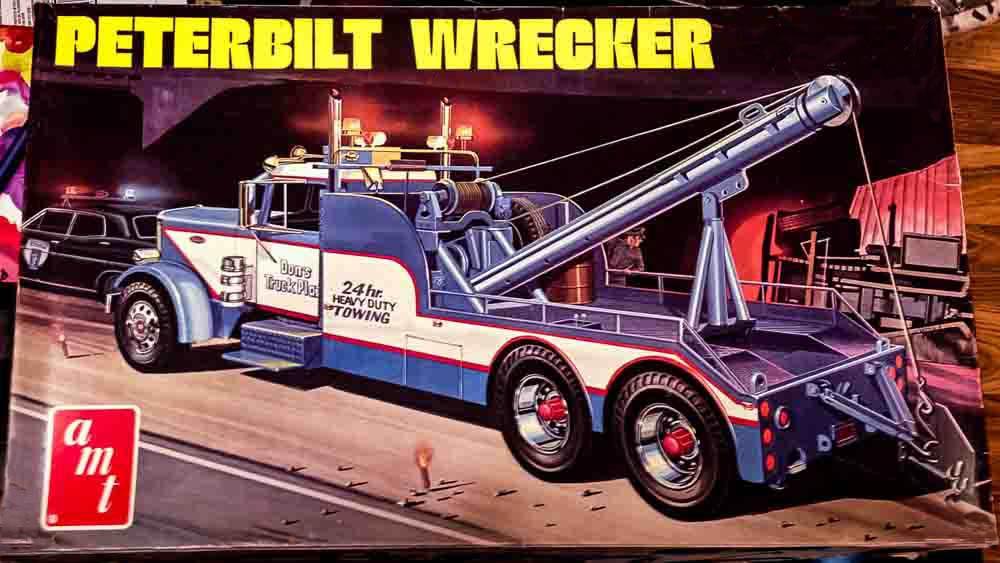 I just finished a nostalgia build on the original AMT Peterbilt wrecker. I opened an original box with the blue wrecker and built straight from the box as I wanted to keep this as close to the spirit of how I would have built it back in the early 70s as I could. This is one of the hardest builds that I've had in a long time; not due to quality or difficulty of the kit, but to keep myself from digressing and building it the way I would now. I'm sure that a repop is going to be coming soon, and I'll let myself go then. For now, this is my trip back to 1972. This is the box it was built from. I sure hope that the next time AMT repops this one that they use this artwork.
