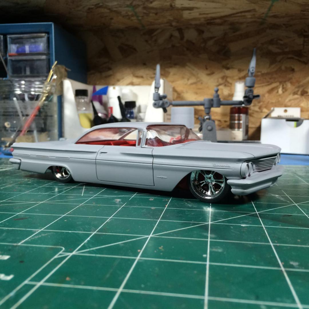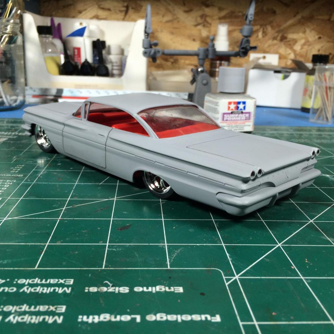 At the Art Center here in Aberdeen SD they have an "Open Art Session" every Thursday between 10am and 12pm. My wife and I go there, she usually works on her book while I prep models. Today I took in the 64 Cutlass 442 and the Bonneville kits. I moved the front axle holes forward on the Olds so the wheels look better balance in the wells. Then I started to work on the Pontiac. I had already started to narrow the rear for some big tires at home, so I thought I'd work on the engine. You can guess what I came up with. Yeah, I'm going to have to cut out the hood on the Bonnie! Here it is mocked up with the wide tires on the rear and the set of wheels from an AMT 66 Nova pro-street kit. Not sure if they will be the ones I use or not. I "narrowed" the rear the old-fashioned way. I removed the wheel wells and sanded down where the axles go through until I had enough clearance. I also thinned the fenders on the body as well. I'm using the backing plates for the slicks from the AMT 50 Ford convertible to mount them with a custom-made metal axle. Front tires are the BF Goodrich tires from the kit. I'll remove badges and door handles on the side and probably paint the lower finned panels grey. I'll get some card stock to remake the rear wheel wells so the inner body don't show. So, what do ya think? Is the world ready for a blown, tubbed 65 Bonneville? Thanks for looking, all comments welcomed.