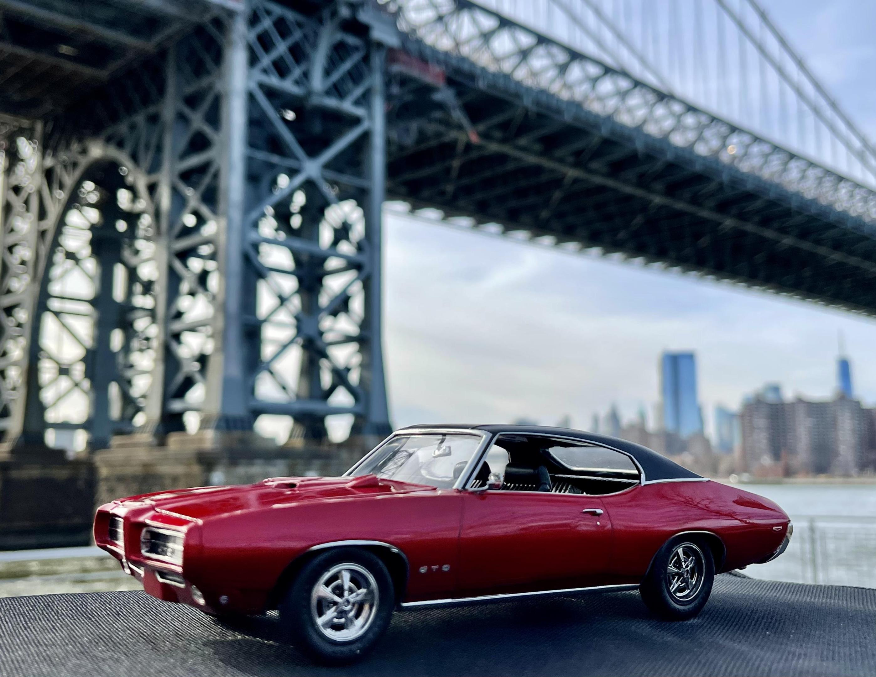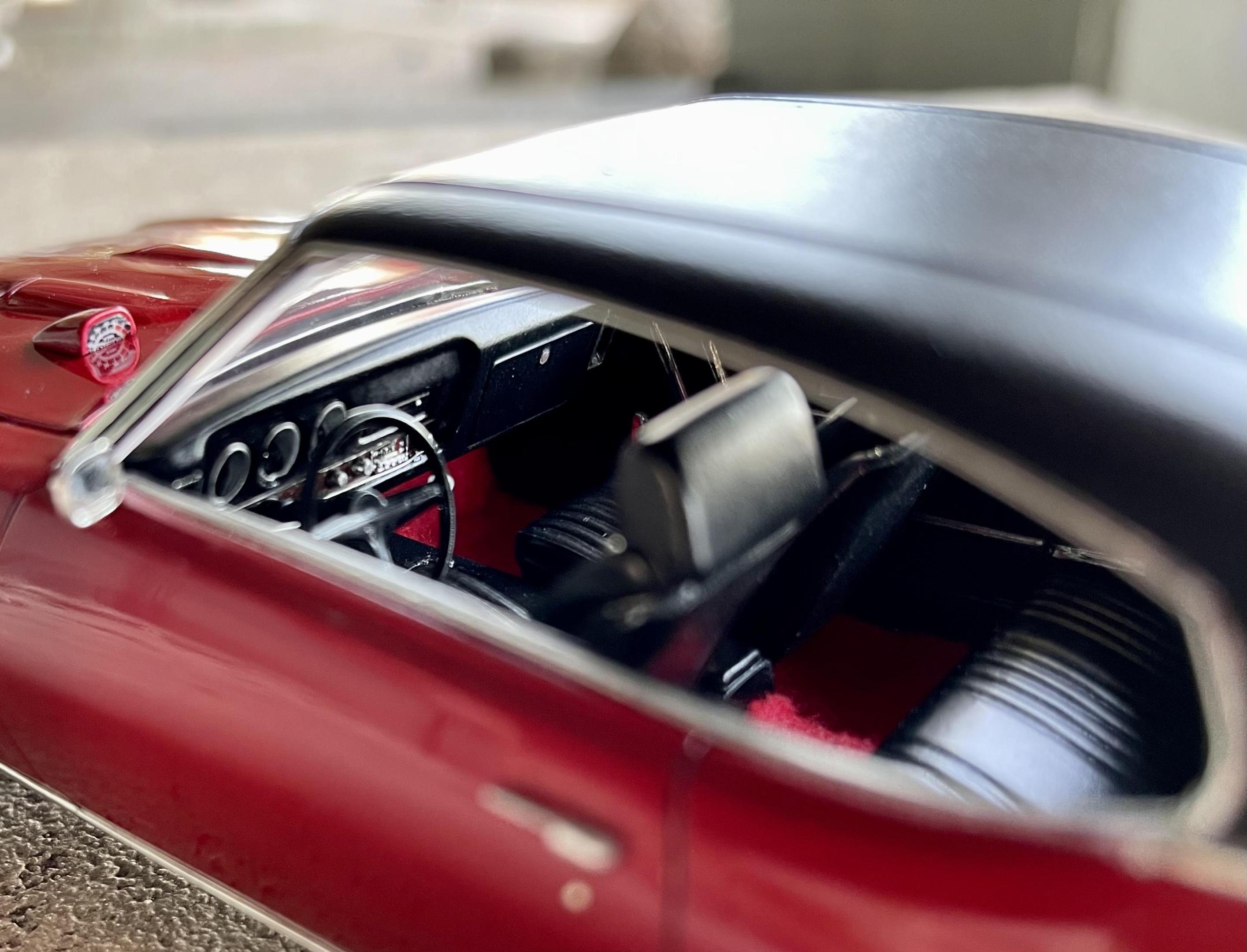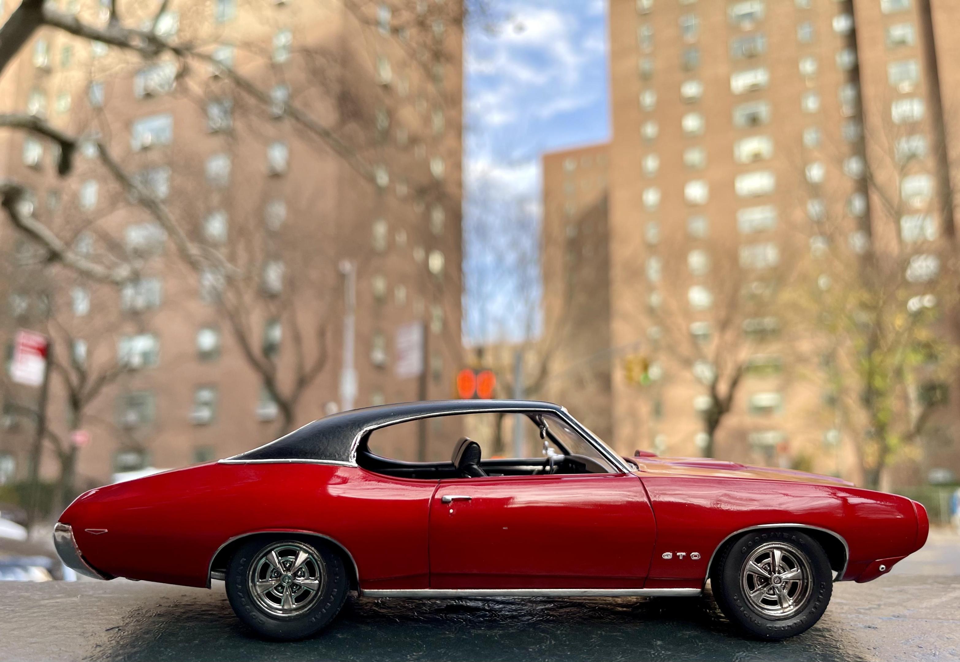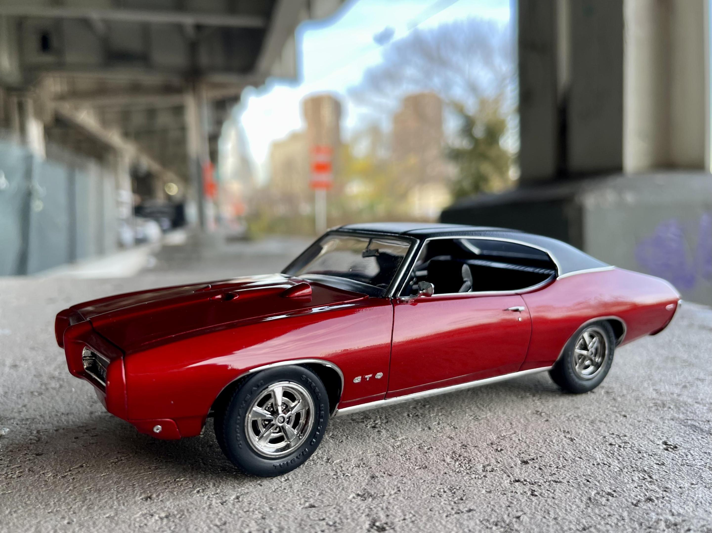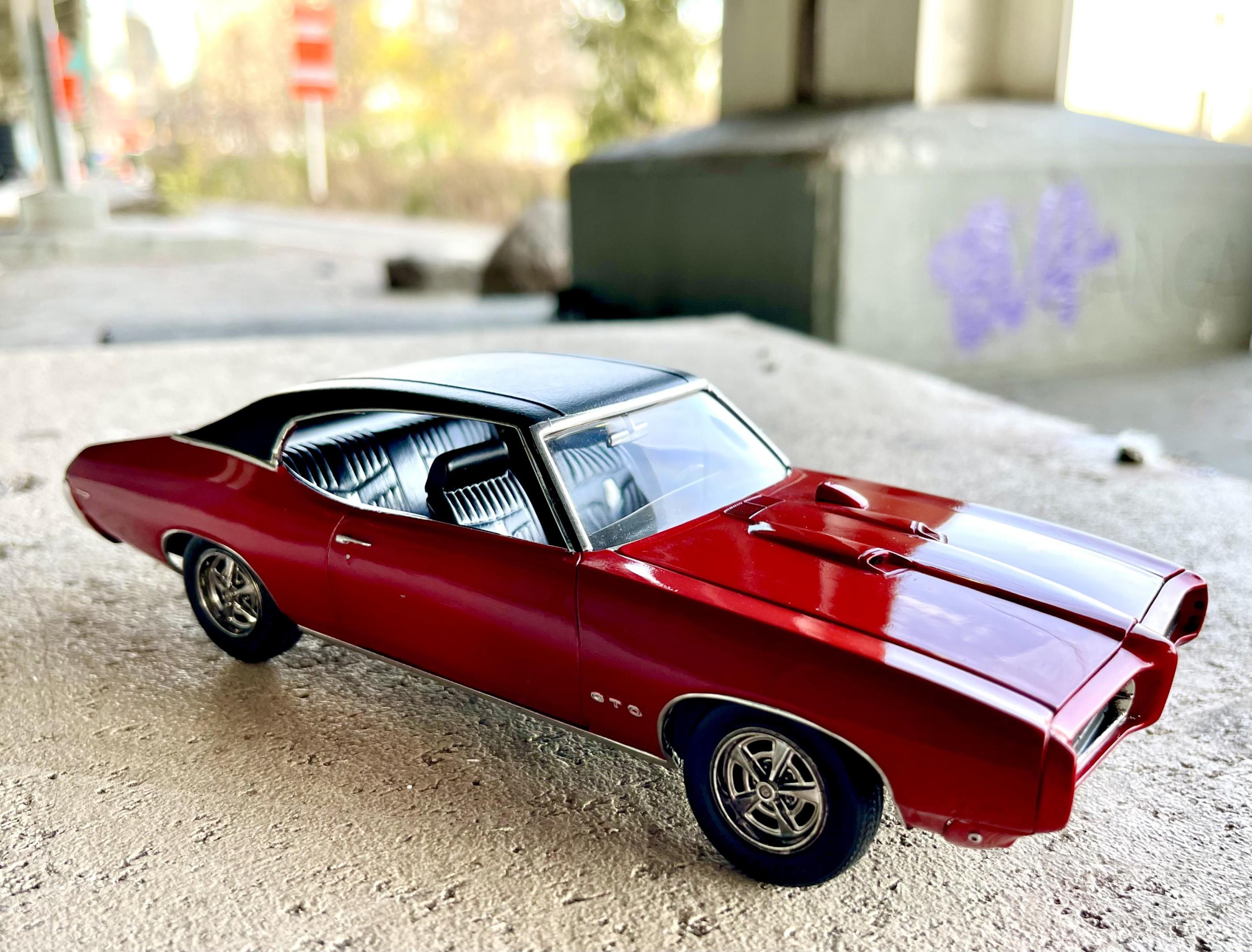 Just finished the ‘69 GTO by Revell/Monogram. I really had fun with this one. It took a lot of work to get the nose to line up flush with the body, but other than that there were no real issues. The kit was pretty basic so I had to make a few small tweaks/additions (engine bay, door handles, mirrors, tail lights, dash bezels, gauge faces, side reflectors, etc.) It was my first “candy” paint job and I really like how it added depth and realism to the little car - it almost changes color depending on the light. Tamiya spray cans - 2 coats grey primer, 3 light coats of clear red over two coats of gloss aluminum, wet sanded then cleared with ts-13 and polished out. Will definitely use that combo again. Gonna try it with clear blue next… Foiling the trim tested my patience more than usual but I eventually calmed down and got it done. Had no choice but to do the window and wheel trim with Hasegawa mirror finish since I simply could not get the bmf to stick (may redo it if/when bmf ever sorts out their product - it’s been brutal and almost ruined the build). Ok enough complaining ? I want to drive this car!!